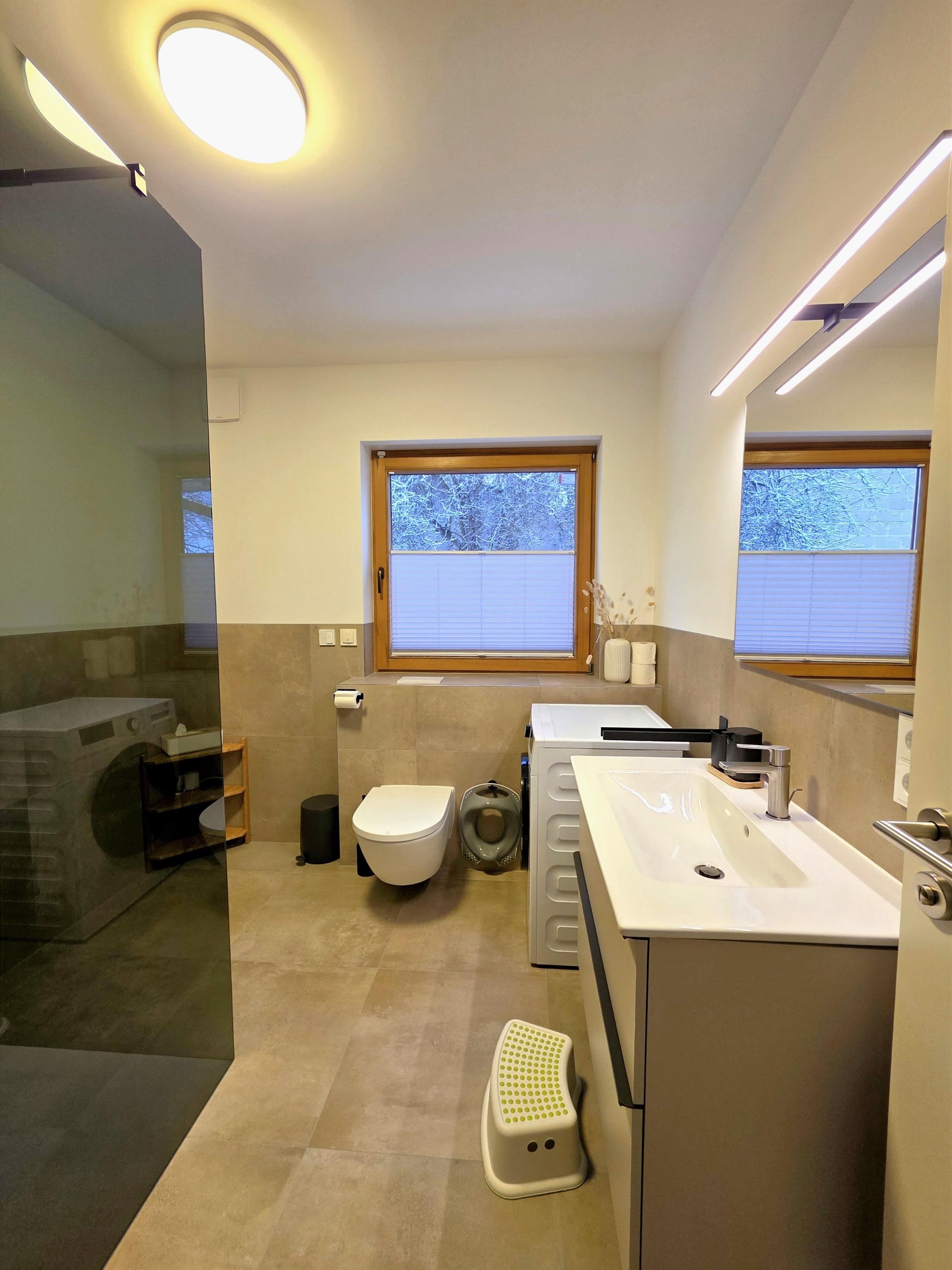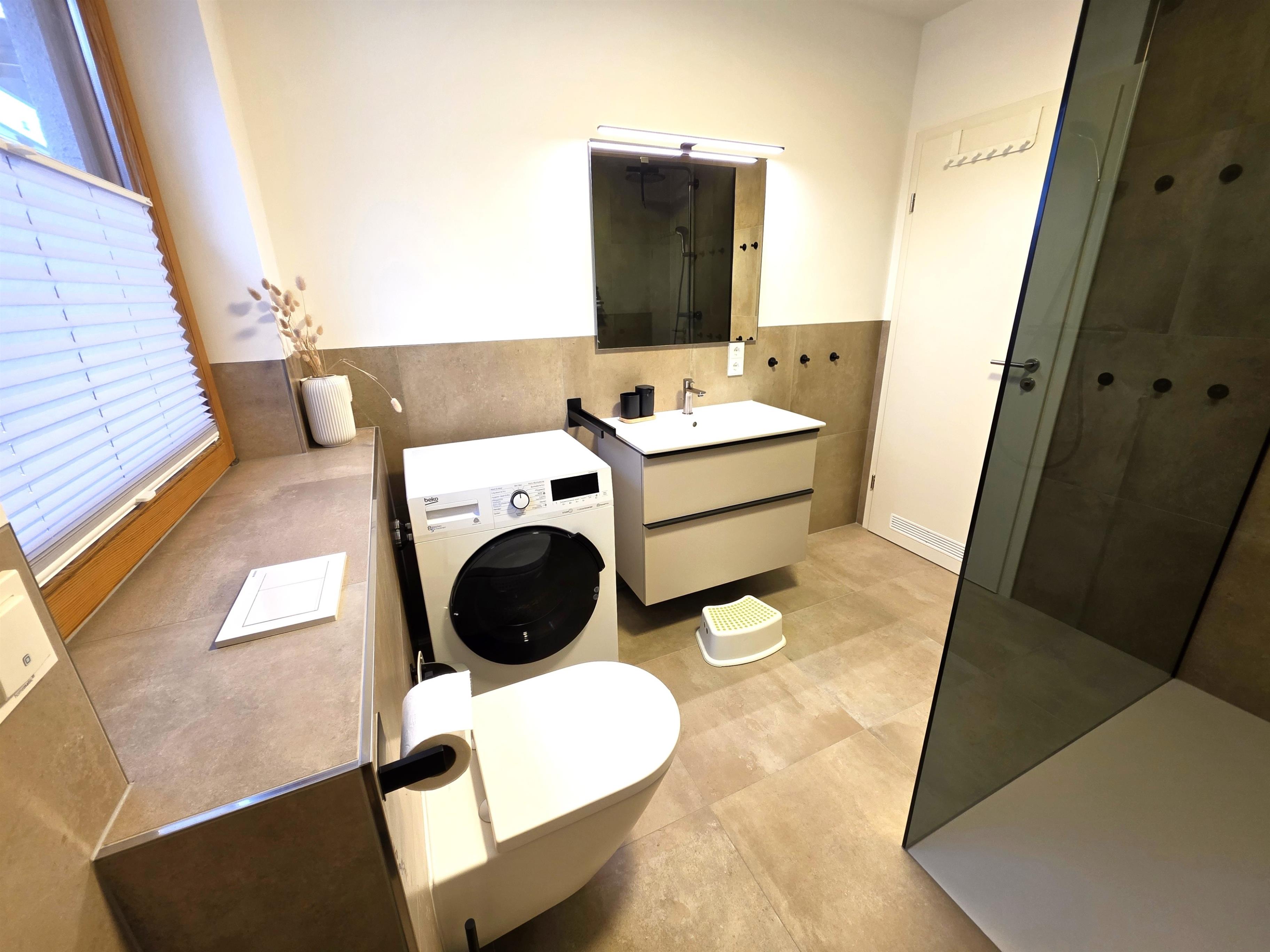 Das Badezimmer wurde modernisiert und mit einer Duschkabine aus Glas ausgestattet. Außerdem steht eine Waschtrocknerkombination kostenlos zur Verfügung, sodass Sie nicht Unmengen an Kleidung mitnehmen müssen.