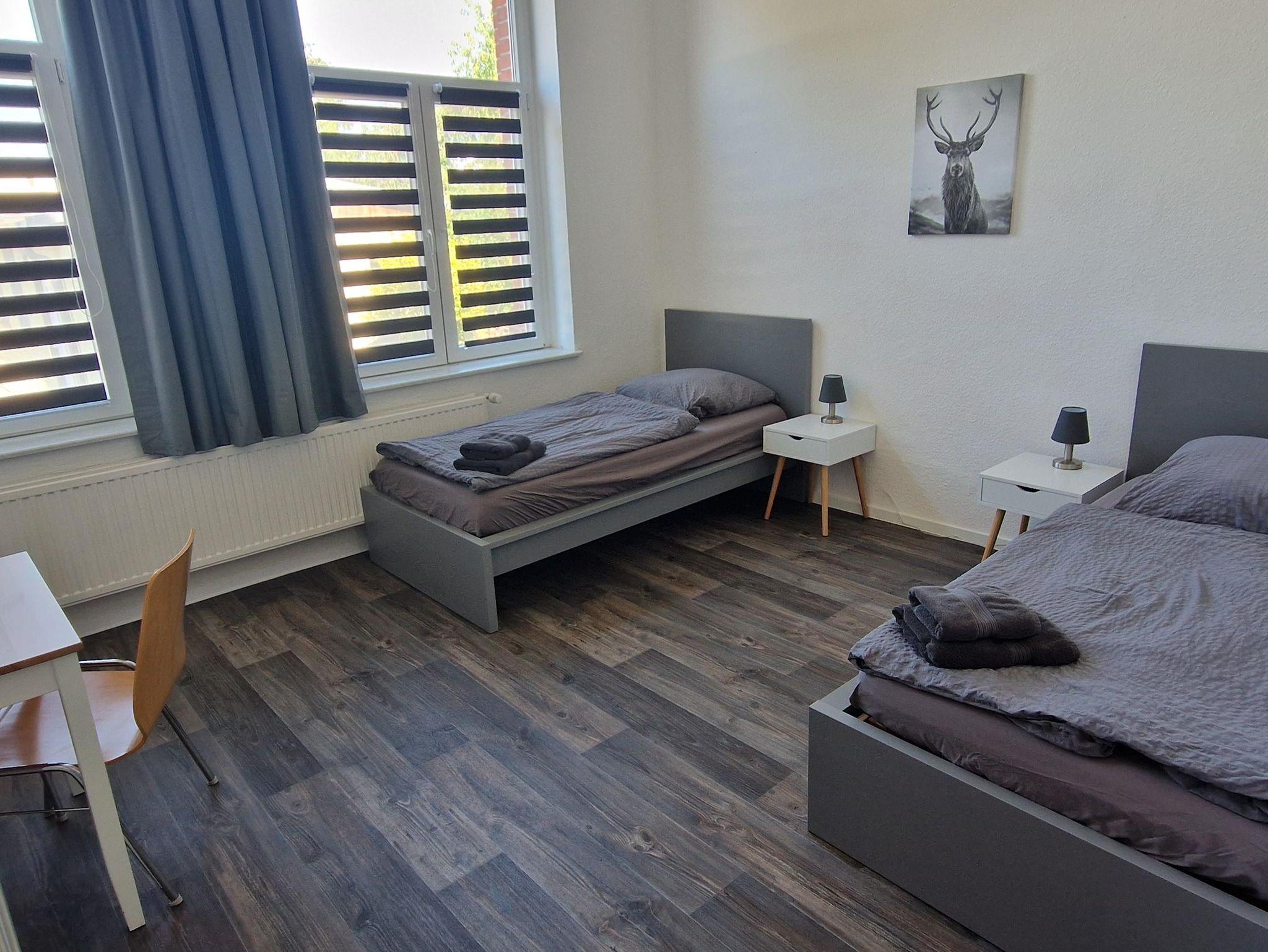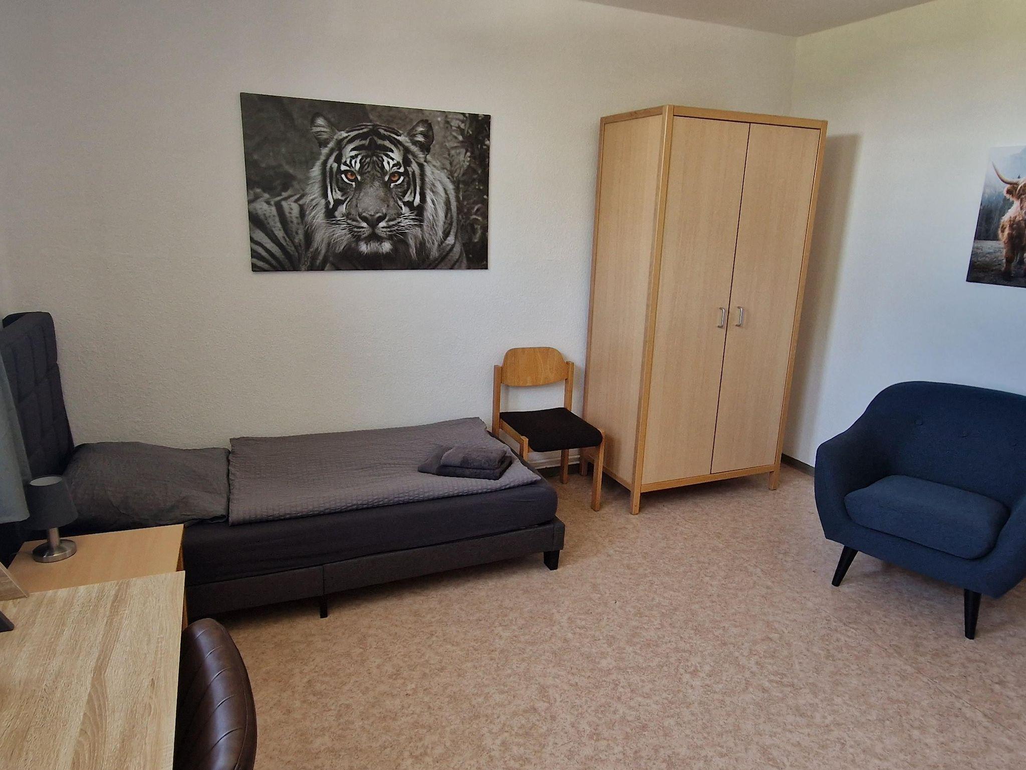 Hier haben Sie alles was Sie benötigen. Das Zimmer verfügt über zwei einzel Betten , Schreibtisch, Sessel, TV. Gerne nutzen Sie auch unsere Gemeinschaftsräume, den Außenbereich mit Sitzgelegenheiten und Grill sowie unsere komplette Gemeinschaftsküche.