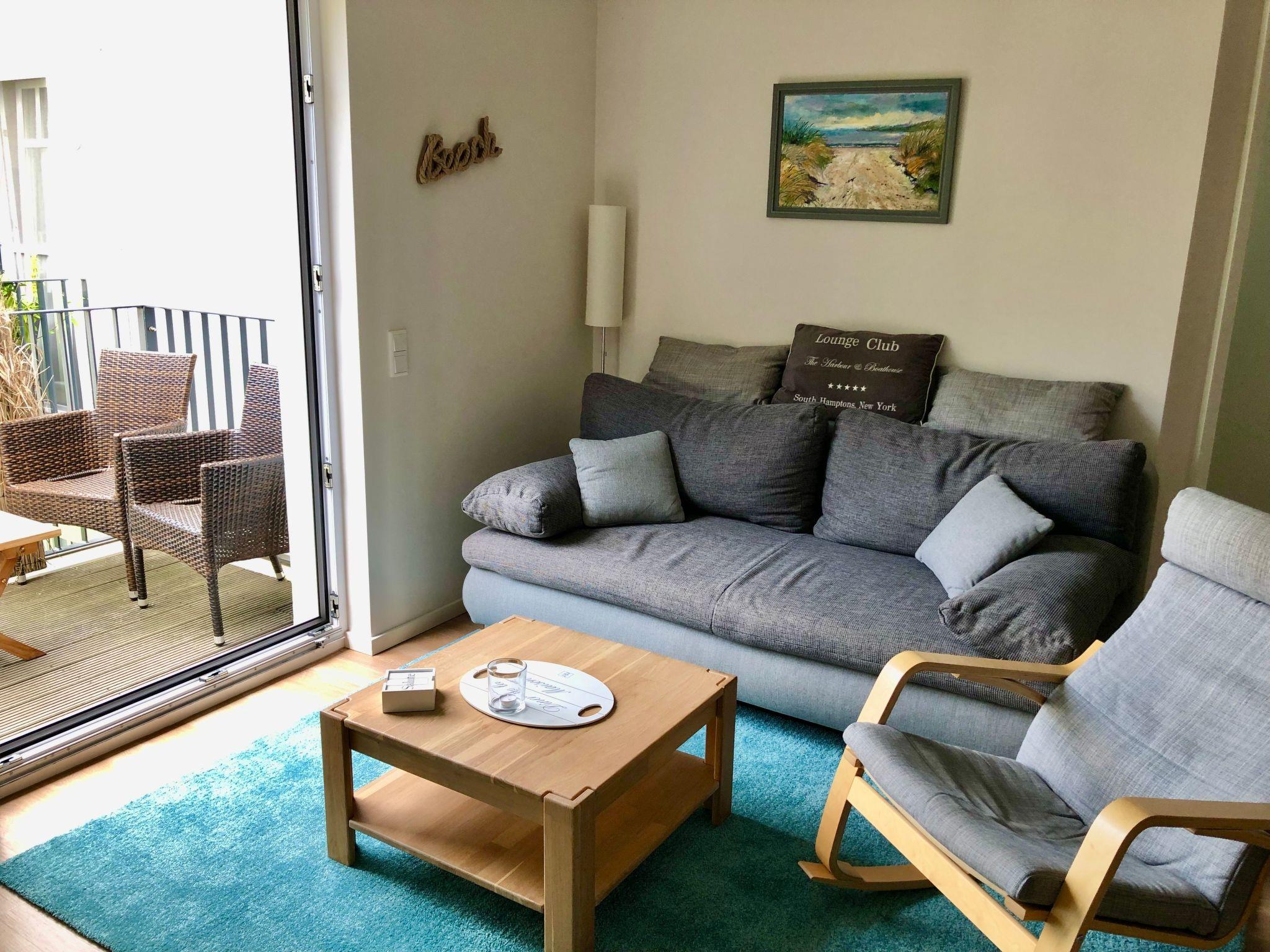 The approx. 48 m² luxury holiday flat is designed for three people and consists of a living room with open-plan kitchen, bedroom and bathroom with shower, washbasin and WC. It was newly built in 2016 and is tastefully furnished to a high standard in warm and discreet colours. Two people can sleep on the 180 x 200 cm double bed in the bedroom with a large wardrobe, and another person can sleep on a 160 x 200 cm sofa bed in the living room. The open-plan kitchen is fully equipped. In the living room, guests will find a television with satellite TV and home cinema system for evening entertainment. There is underfloor heating in all rooms and wireless WLAN is also available.