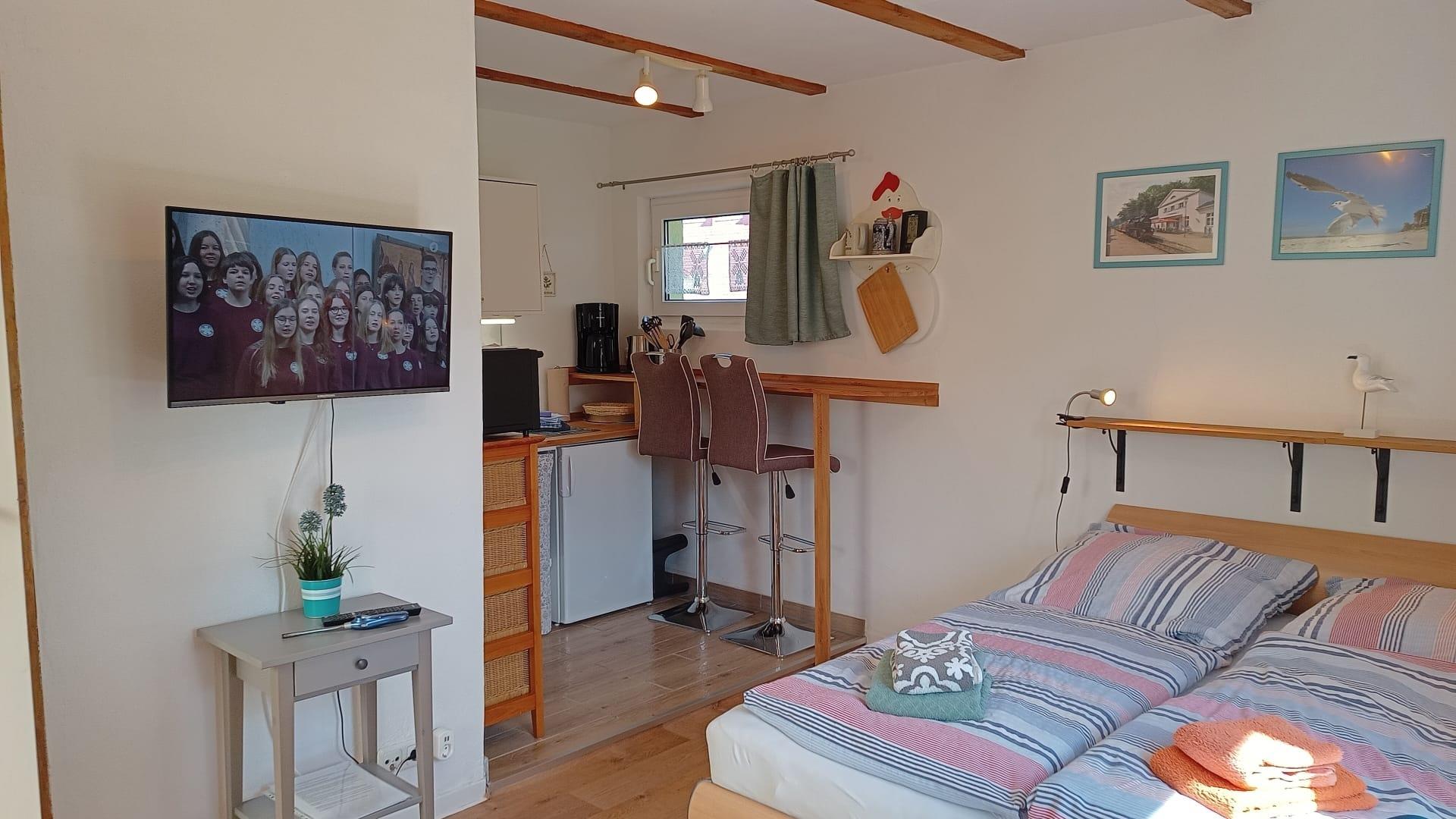 Das Doppelbett ist 1,60x1,90 m groß und hat 2 Matratzen, die Lattenroste sind verstellbar. Zwei bequeme Sessel laden zum Fernsehen ein. Der Raum kann zum Schlafen durch Verdunklungsrollos und blickdichte Gardinen abgedunkelt werden. An den Fenstern sind Insektenschutzgitter angebracht.