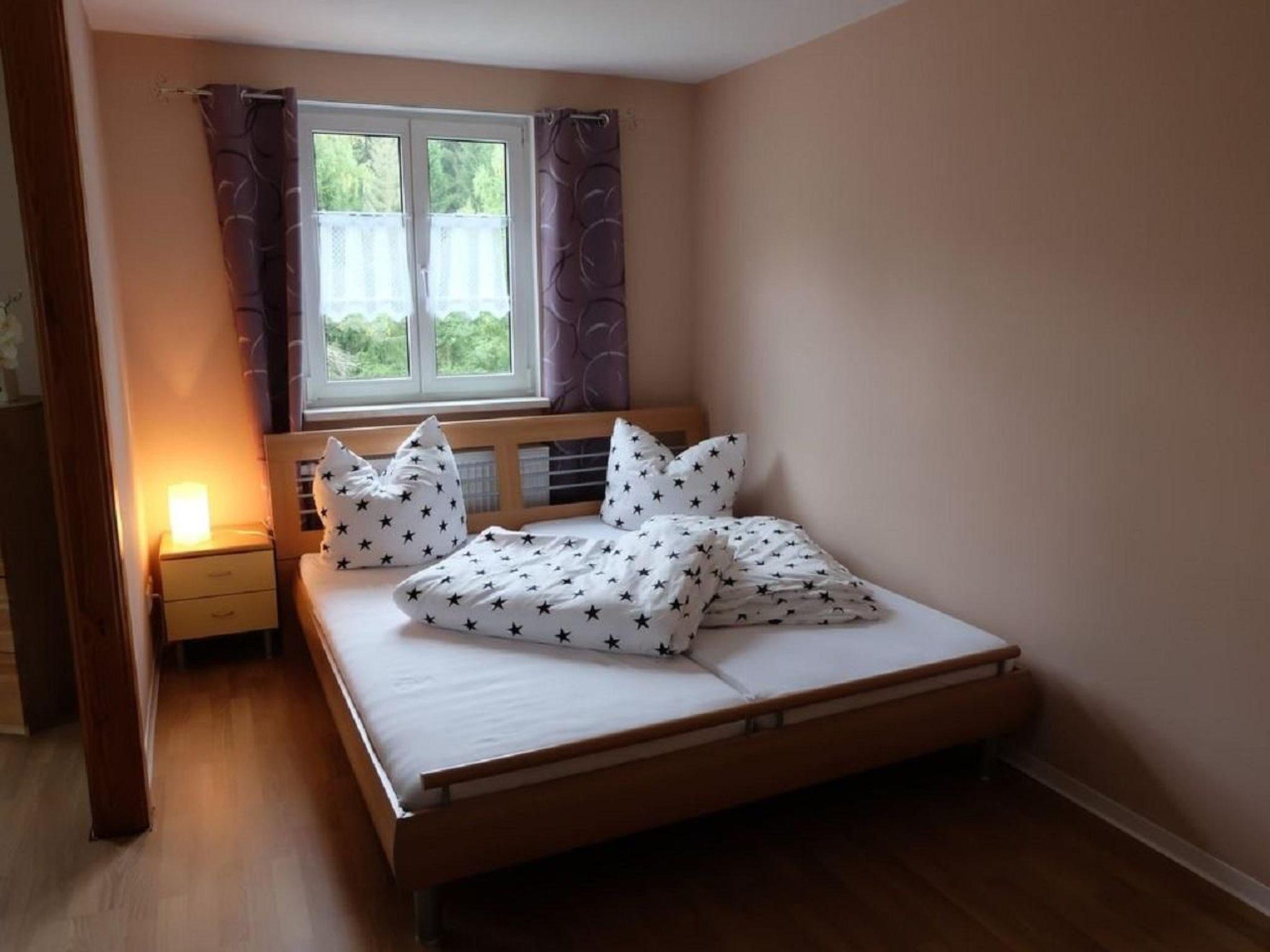 Our holiday home am Wald is located in the traditional spa town of Bad Elster. It is a customs border house built in 1938, completely renovated inside in 2019, idyllically situated on the edge of the forest in the countryside, which has been open for rent since November 2019. The neighbourhood is very quiet and there is no street noise. The holiday flat is located in one half of the house, which is built as a semi-detached house. The other half is occupied by the landlords. This is very practical if you have any questions, tips or requests. The holiday flat is laid out over 2 floors (ground floor and upper floor). It is completely renovated, approx. 80 square metres in size and offers many highlights. Such as its own sauna, lovingly furnished children's room, large eat-in kitchen and much more. The small housing estate in which the house is located consists of only 5 houses. The town centre with its spa facilities can be reached on foot in 20 minutes. Local supplies are easily provided by an Edeka supermarket. This is within walking distance. 1x sauna is included per booking, any further use see additional services. Non-smoking house Pets not allowed Brief description Miscellaneous : Non-smoking house Brief description 1 Number of kitchens : 1 Rooms : Sauna Living room 1 Other living room facilities : large corner sofa, TV, DVD player Bathroom 1 Other bathroom facilities : Potty and toilet seat for small children Kitchen 1 Other kitchen facilities : Senseo coffee machine, dishwasher and much more Surroundings Sports facilities in the area : Golf course, mountain biking, cycling, cross-country skiing, alpine skiing Garden and outdoor facilities Leisure facilities at the property : Sauna Garden facilities : Garden furniture available, barbecue