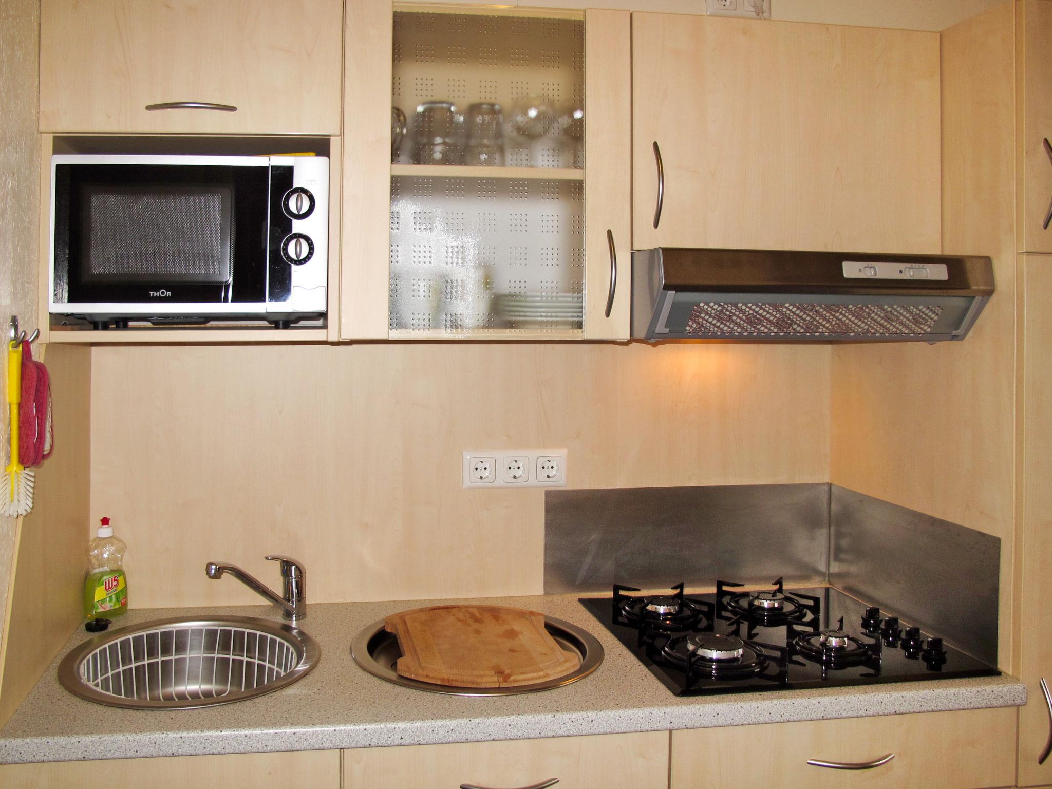 3-room bungalow 40 m2. Modern furnishings: living/dining room with dining table, satellite TV, radio and DVD. Exit to the terrace. 1 double bedroom. 1 small room with 1 x 2 bunk beds. Open kitchen (4 gas rings, toaster, kettle, microwave, electric coffee machine). Shower/WC. Underfloor heating. Terrace. Terrace furniture. Facilities: children's high chair, baby cot. Internet (WiFi, free). Please note: non-smokers only. Maximum 1 pet/ dog allowed. Smoke alarm, fire extinguisher.