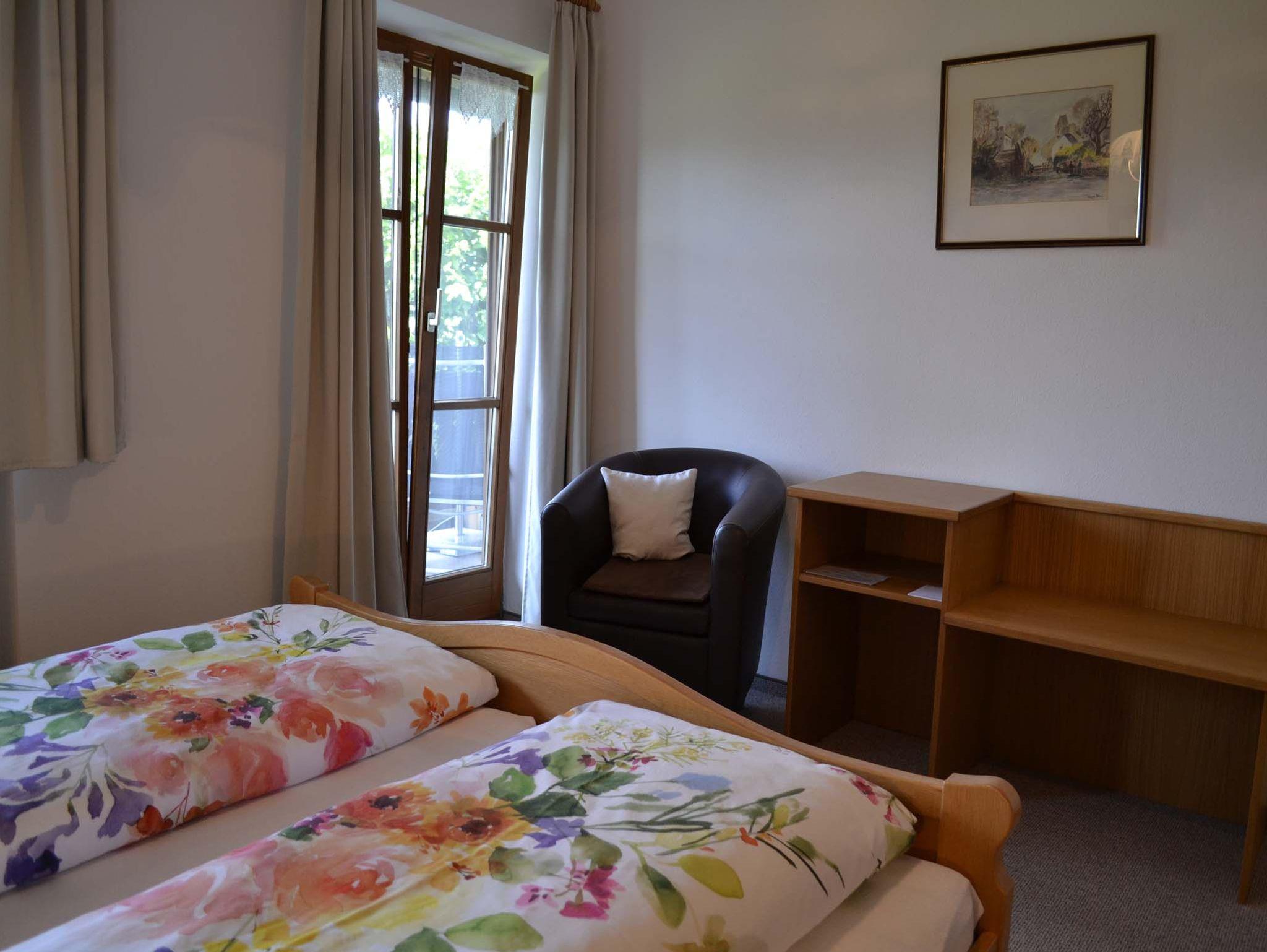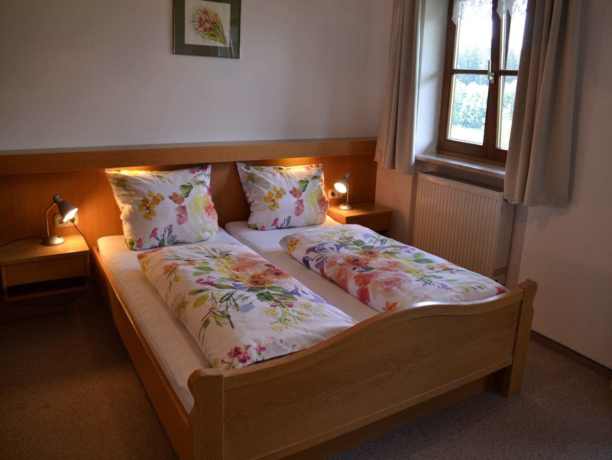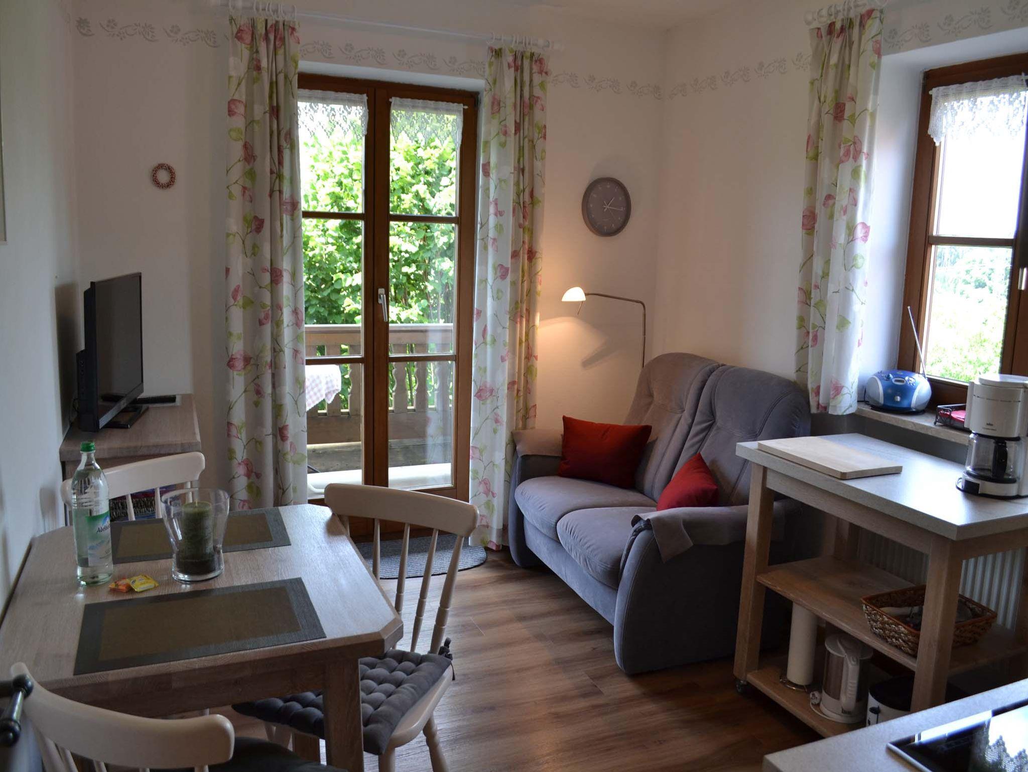 Gemütliche 2-Zimmerferienwohnung mit sonnigem Balkon, von dem aus Sie den Sonnenuntergang mit freiem Blick auf Berge, Wald und Wiesen genießen können. Komplett ausgestattete Küche mit Geschirrspüler, Mikrowelle incl. Grill, Kühlschrank mit Gefrierfach, Kaffeemaschine und vieles mehr. Im Schlafzimmer finden Sie verstellbare Lattenroste, Verdunklungsvorhänge und Bettwäsche. Ein Bad mit Dusch- und Handtüchern, sowie Kosmetikspiegel, Fön und diverse Sanitärartikel steht Ihnen zur Verfügung. Selbstverständlich auch ein Flachbildfernseher (Sat-TV), kostenloses WLAN und CD-Radio. Nichtraucher Ferienwohnung (Rauchen ist auf dem Balkon gestattet).