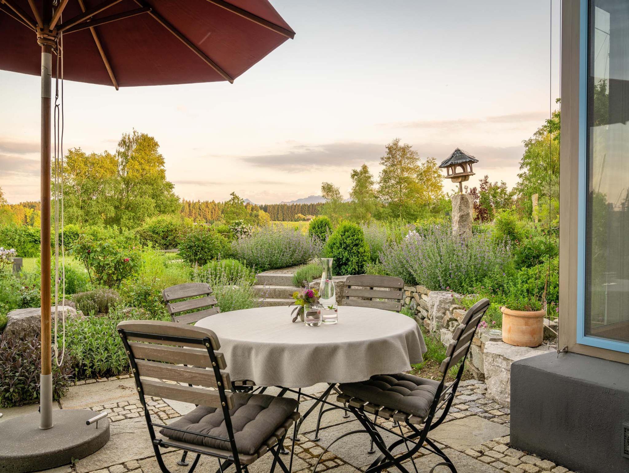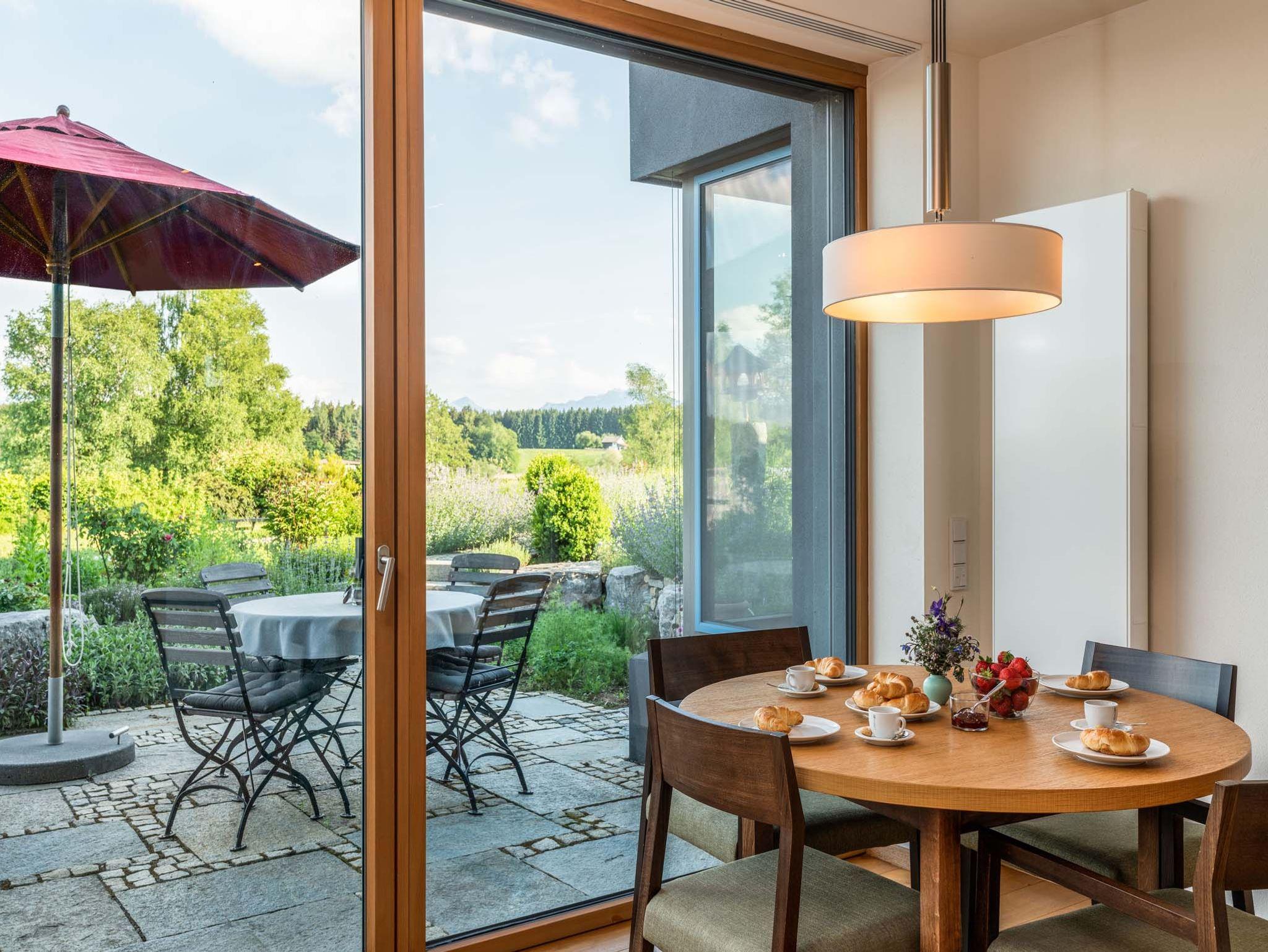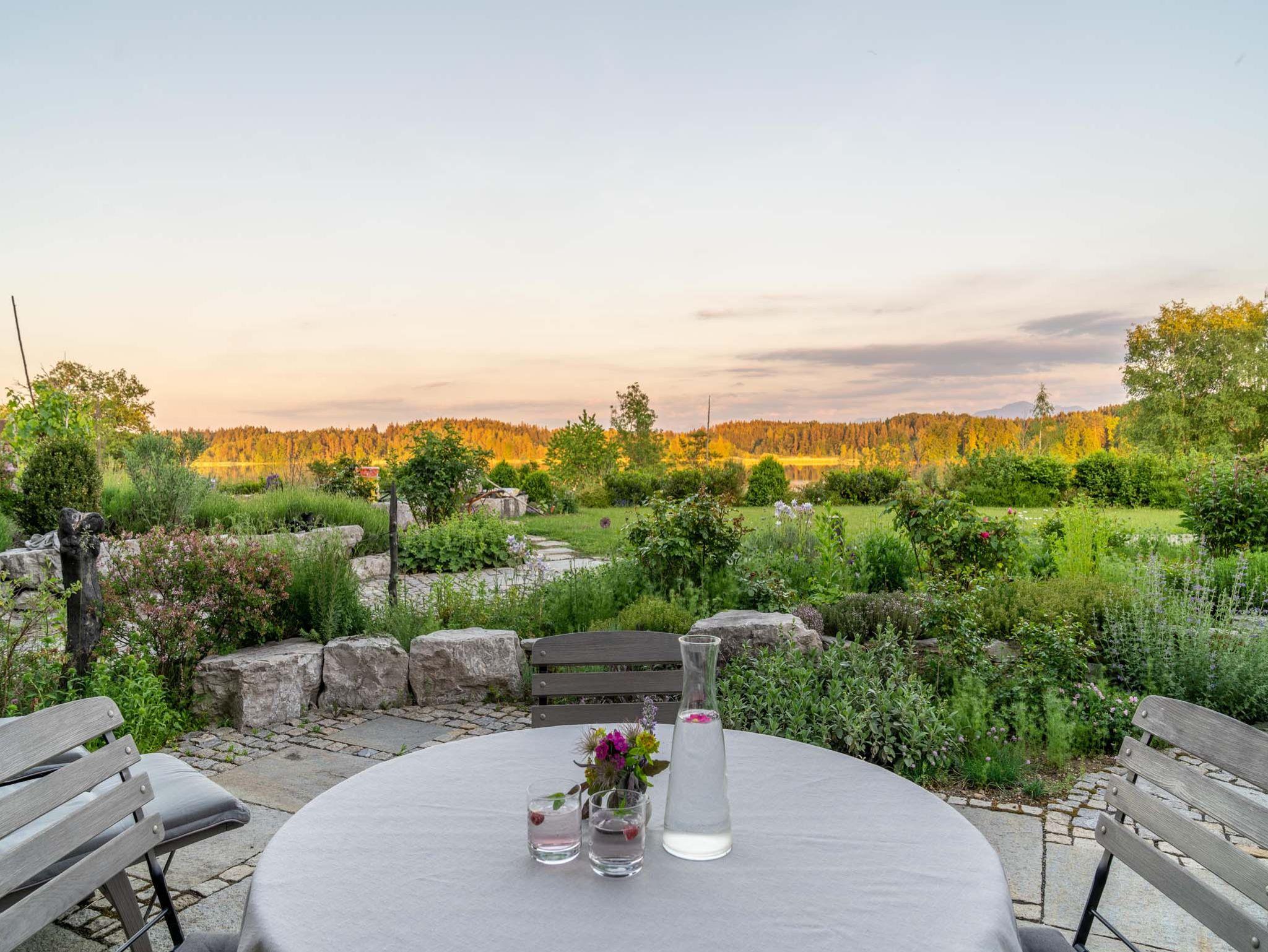 Einen wunderschönen Blick auf den Pelhamer See und die Chiemgauer Alpenkette bietet das große Panoramafenster des lichtdurchfluteten, offenen Wohnraums des Appartements Rosengarten“. An sonnigen Tagen ist die Terrasse eingebettete in Blumen und Rosen und bereichert das Appartement. Ein Traum für jeden Naturliebhaber und pure sommerliche Lebensart!