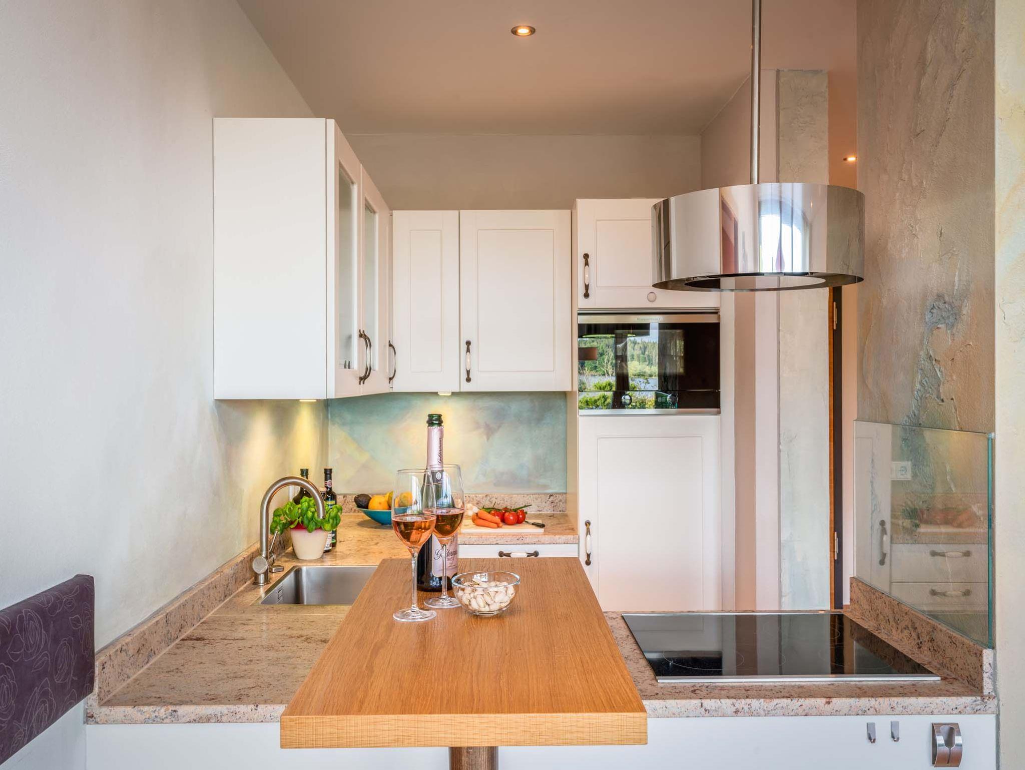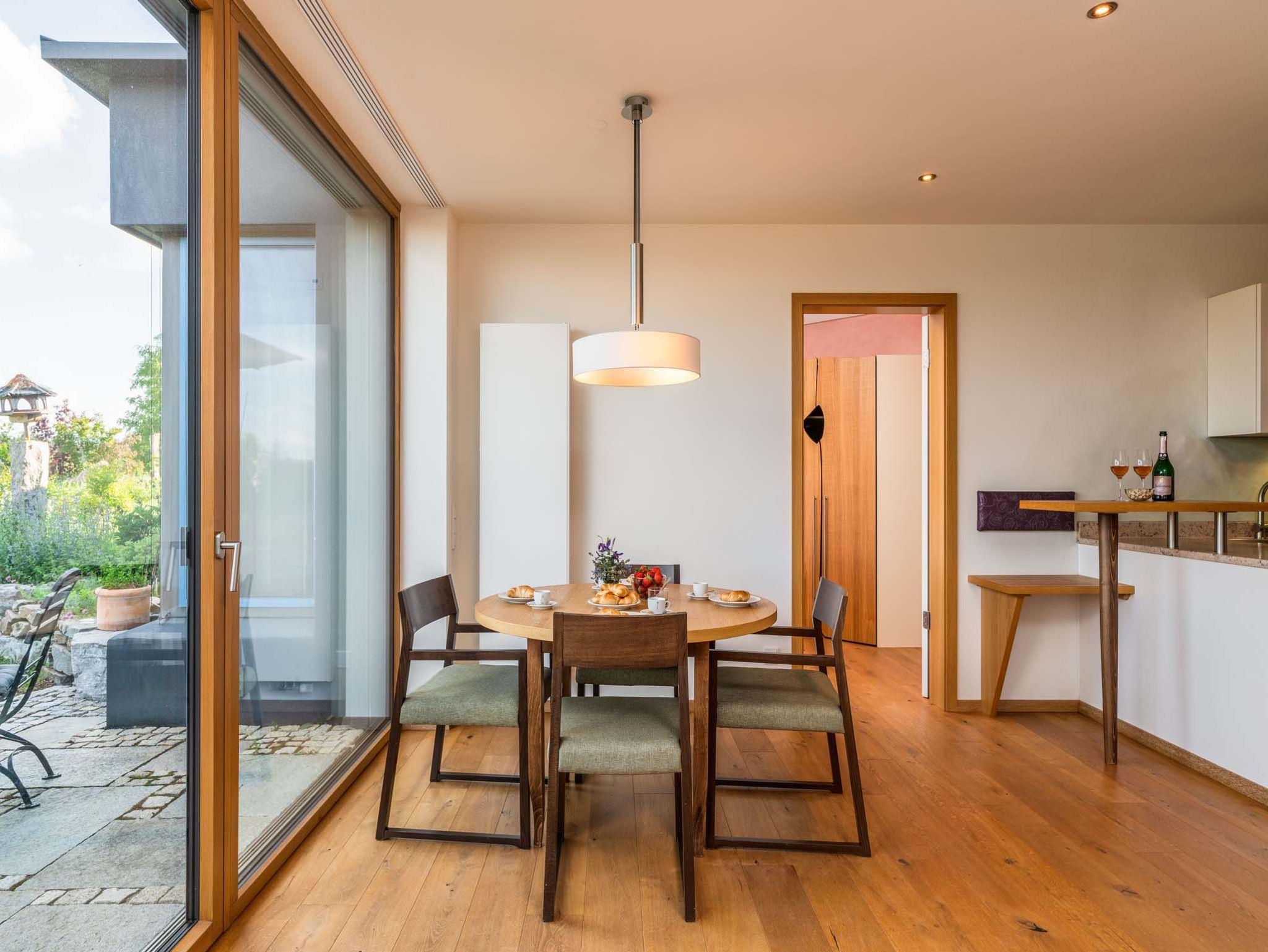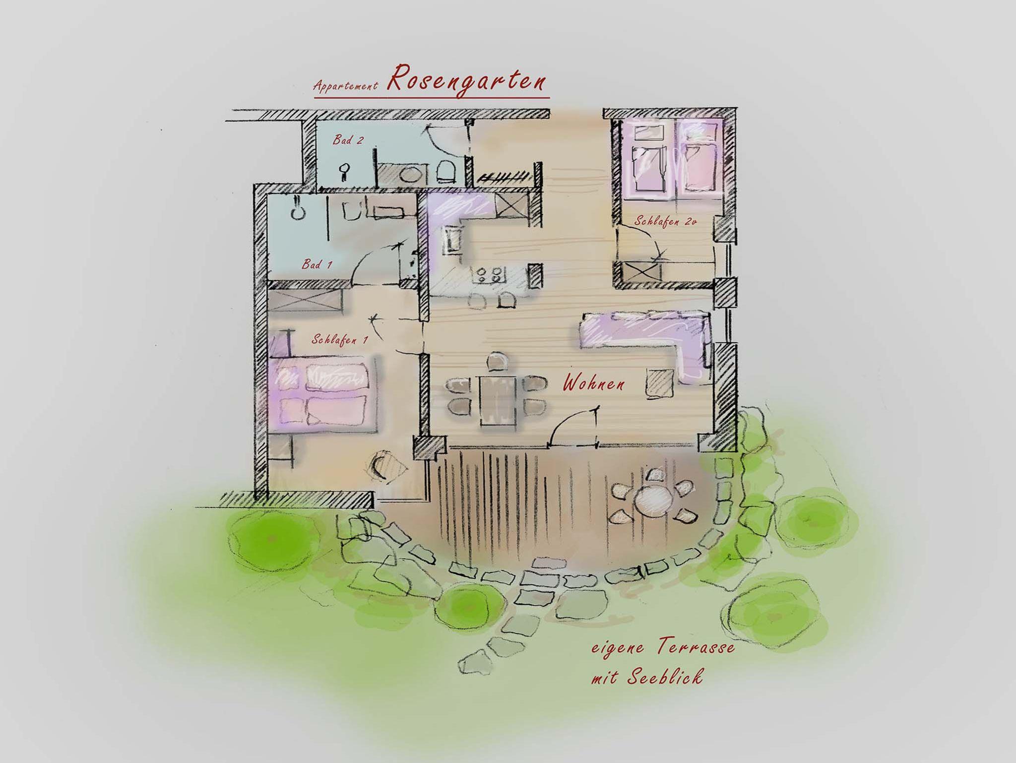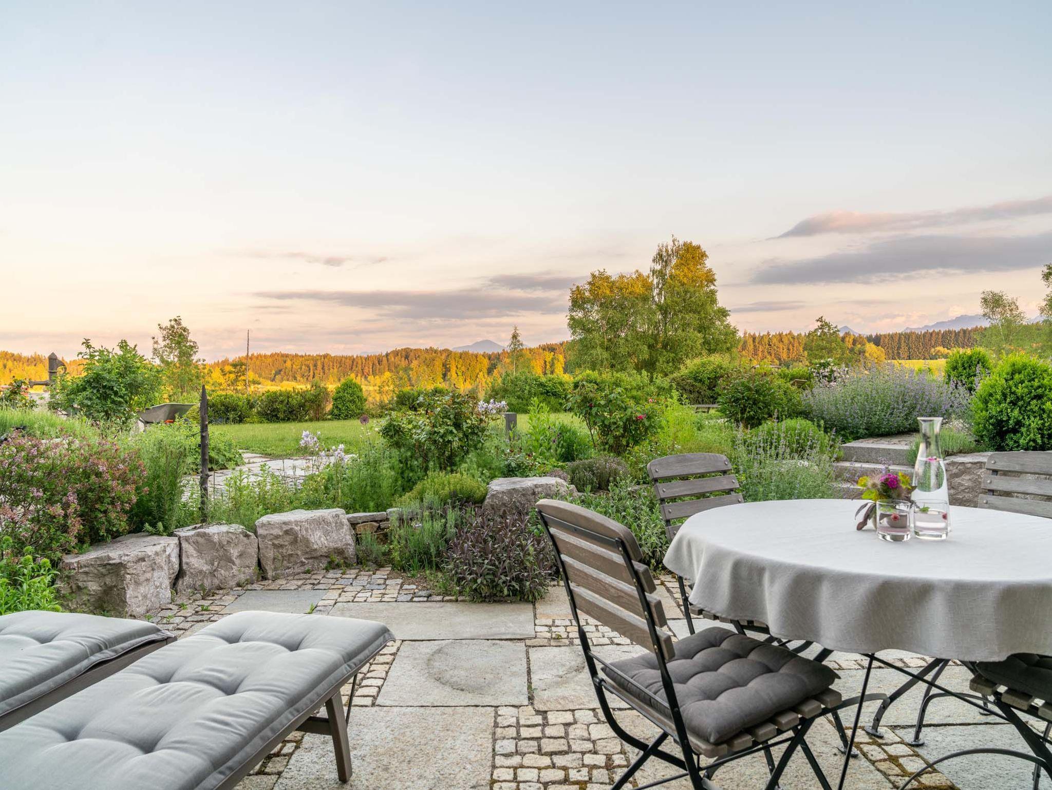 Einen wunderschönen Blick auf den Pelhamer See und die Chiemgauer Alpenkette bietet das große Panoramafenster des lichtdurchfluteten, offenen Wohnraums des Appartements Rosengarten“. An sonnigen Tagen ist die Terrasse eingebettete in Blumen und Rosen und bereichert das Appartement. Ein Traum für jeden Naturliebhaber und pure sommerliche Lebensart!
