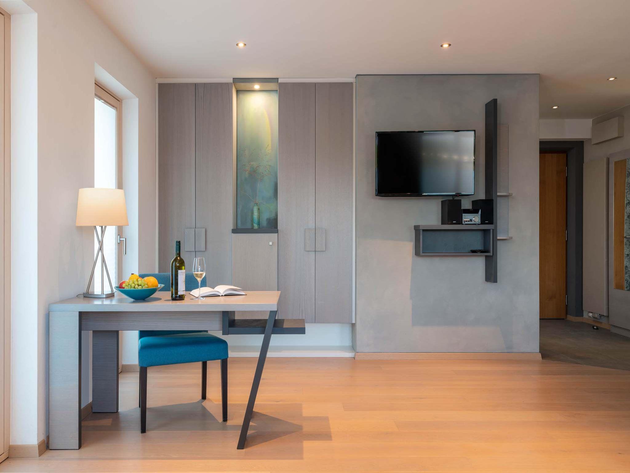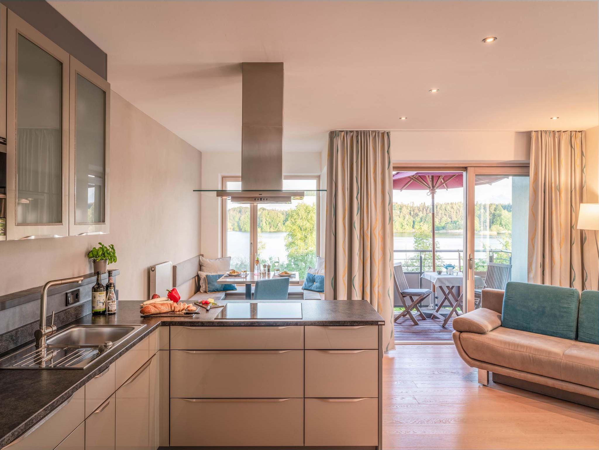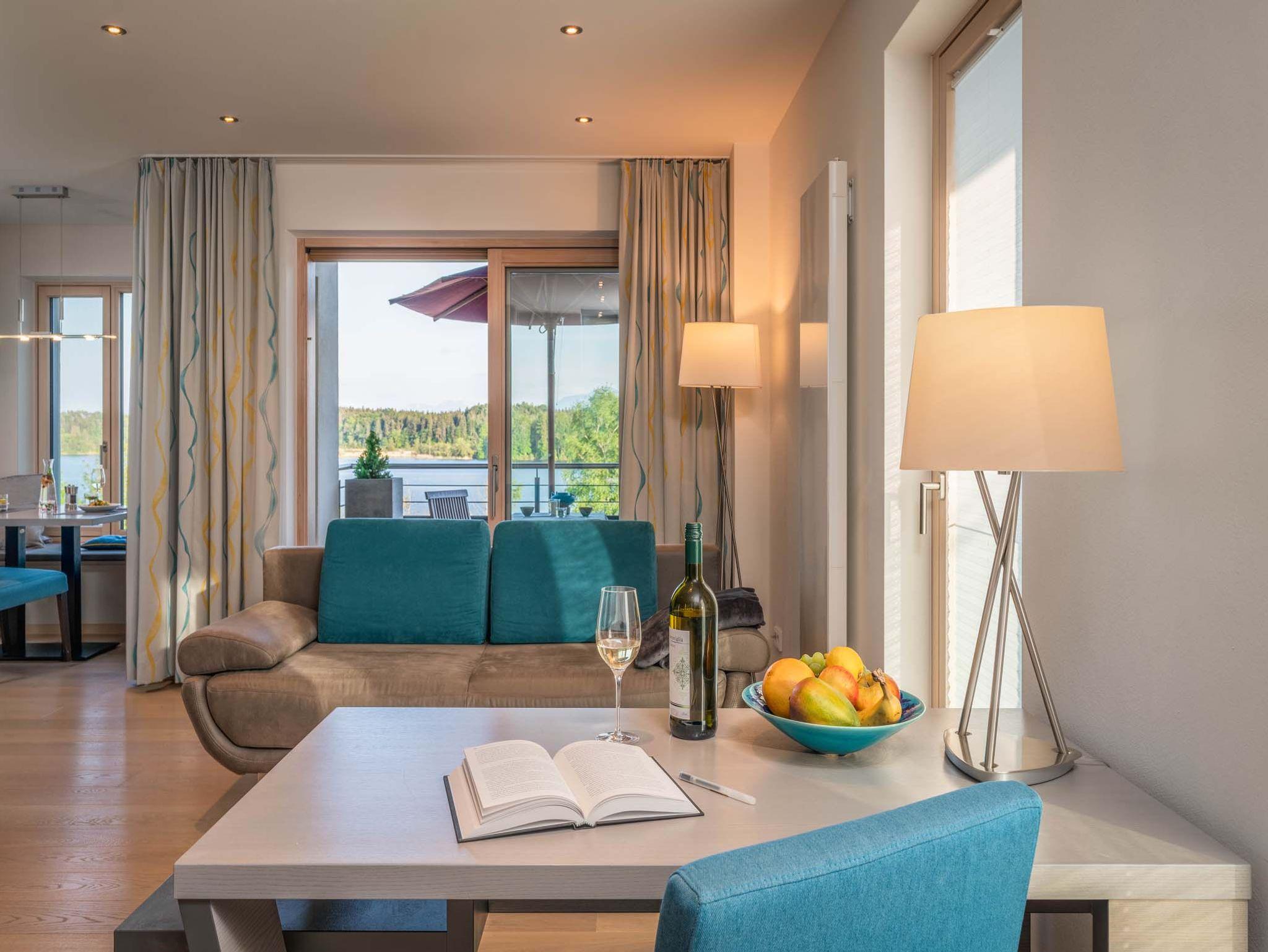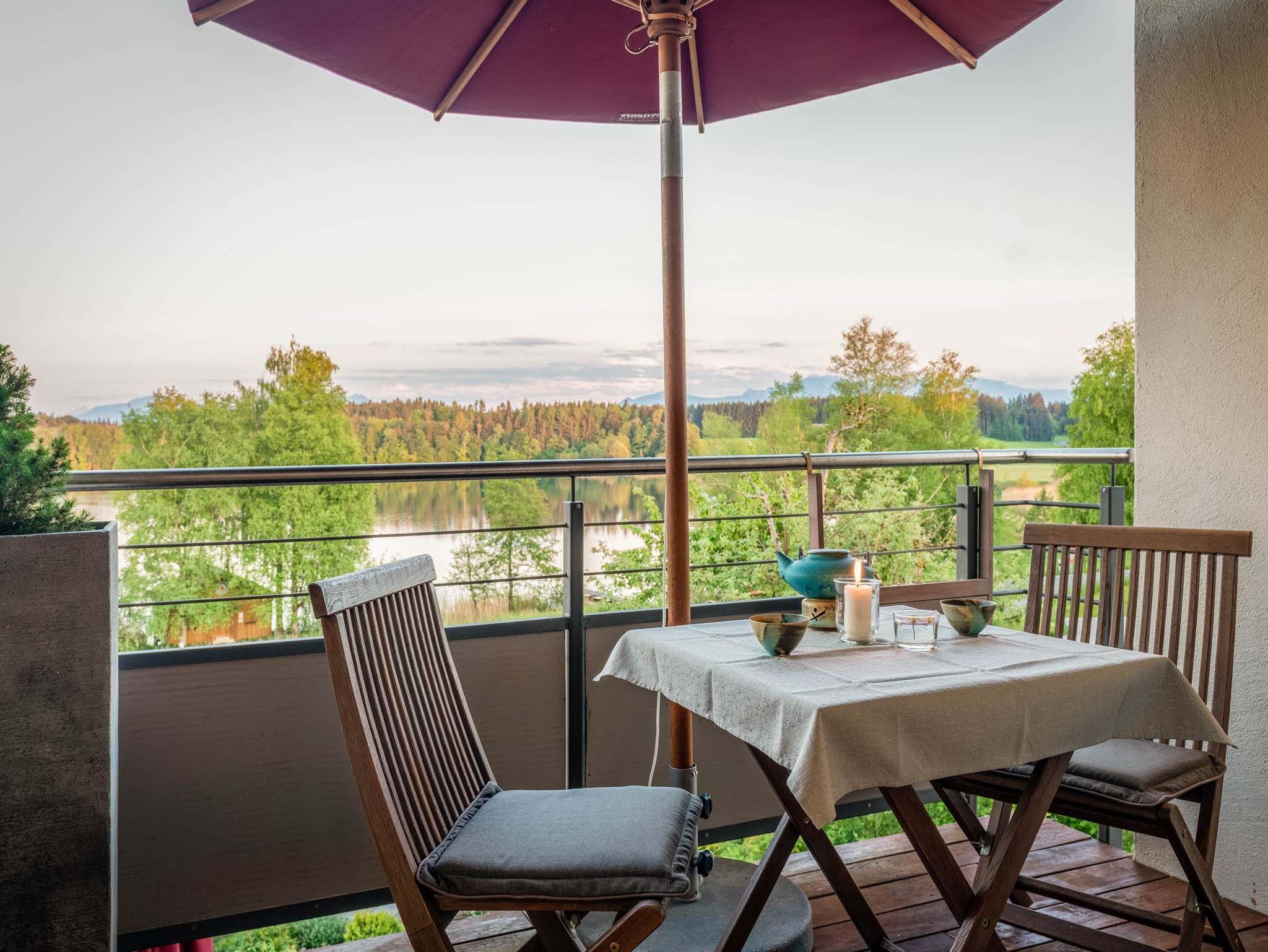 Offenes Wohnen in einem puristisch, modernen Urlaubsappartement mit separatem Schlafzimmer und großzügigem Bad. Die Kombination aus klarer Formensprache und lichten Räumen schafft eine angenehme Wohlfühlatmosphäre. Die kuschelige Leseecke und der Balkon bieten einen unvergleichlichen Blick auf den Pelhamer See und die Chiemgauer Alpenkette. Urlaub vom Feinsten!