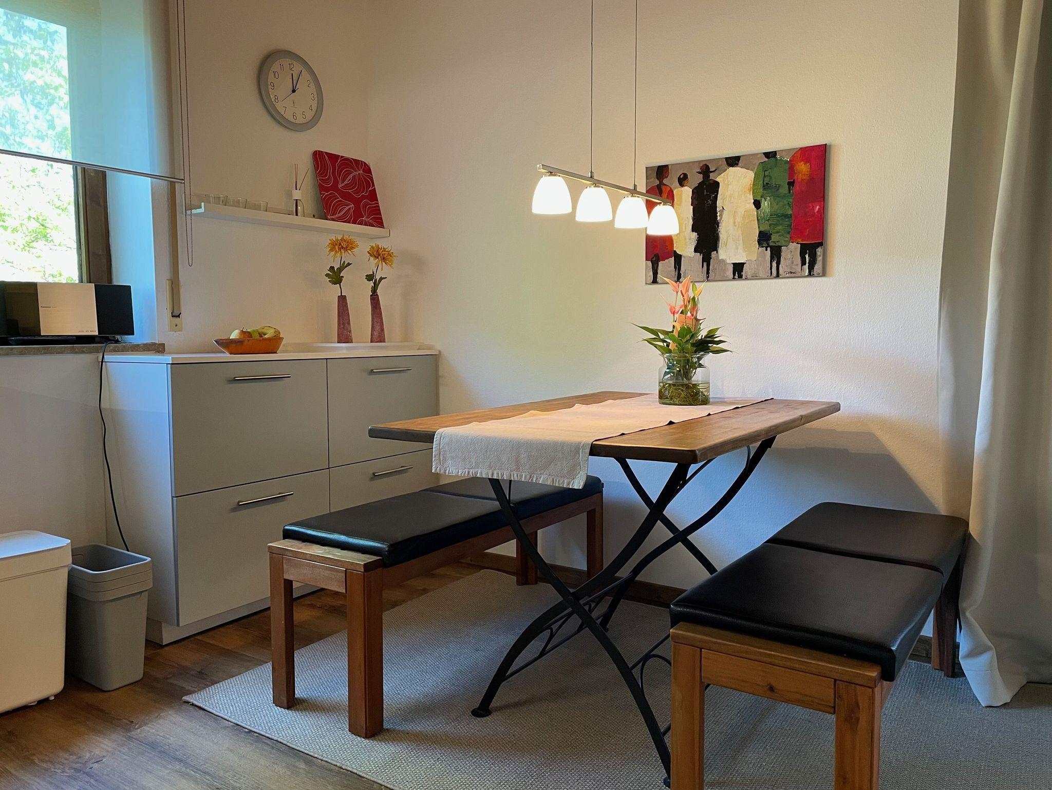 Willkommen in unserer liebevoll eingerichteten Einliegerwohnung – der perfekte Rückzugsort für erholsame Tage. Die gemütliche Wohnung befindet sich in einem Einfamilienhaus und verfügt über einen separaten Eingang für maximale Privatsphäre. Genießen Sie Ihr Frühstück auf der sonnigen Terrasse, entspannen Sie auf der Liegewiese oder machen Sie es sich auf den Sonnenliegen gemütlich. Ein Parkplatz direkt auf dem Grundstück sorgt für zusätzlichen Komfort. Die moderne, voll ausgestattete Einbauküche lässt keine Wünsche offen: Geschirrspüler, Umluftbackofen, Kühl-/Gefrierkombination, Dunstabzugshaube, Wasserkocher, Kaffeemaschine und Handmixer stehen Ihnen zur Verfügung. Direkt angrenzend lädt ein gemütlicher Essplatz zum Verweilen ein.