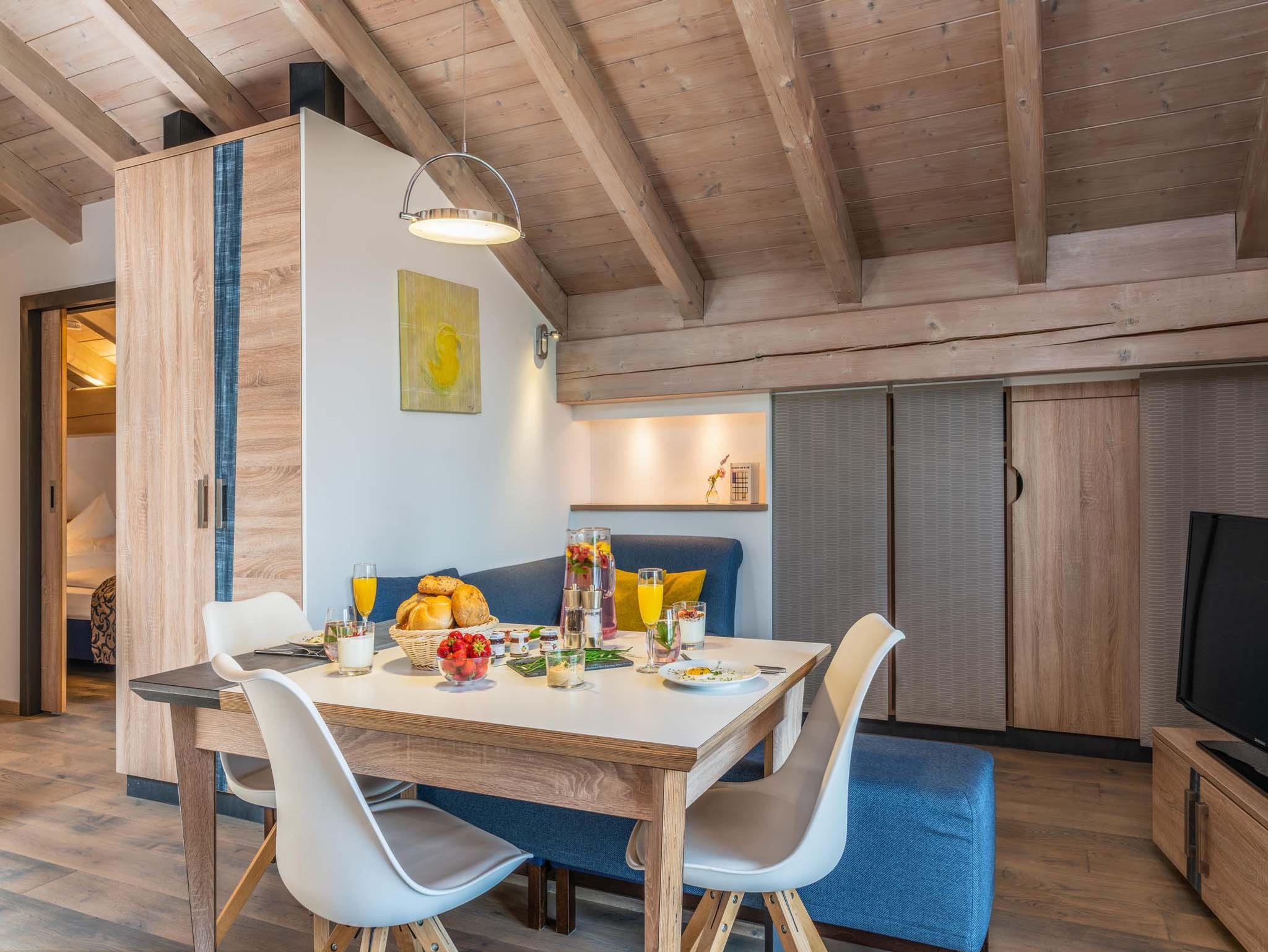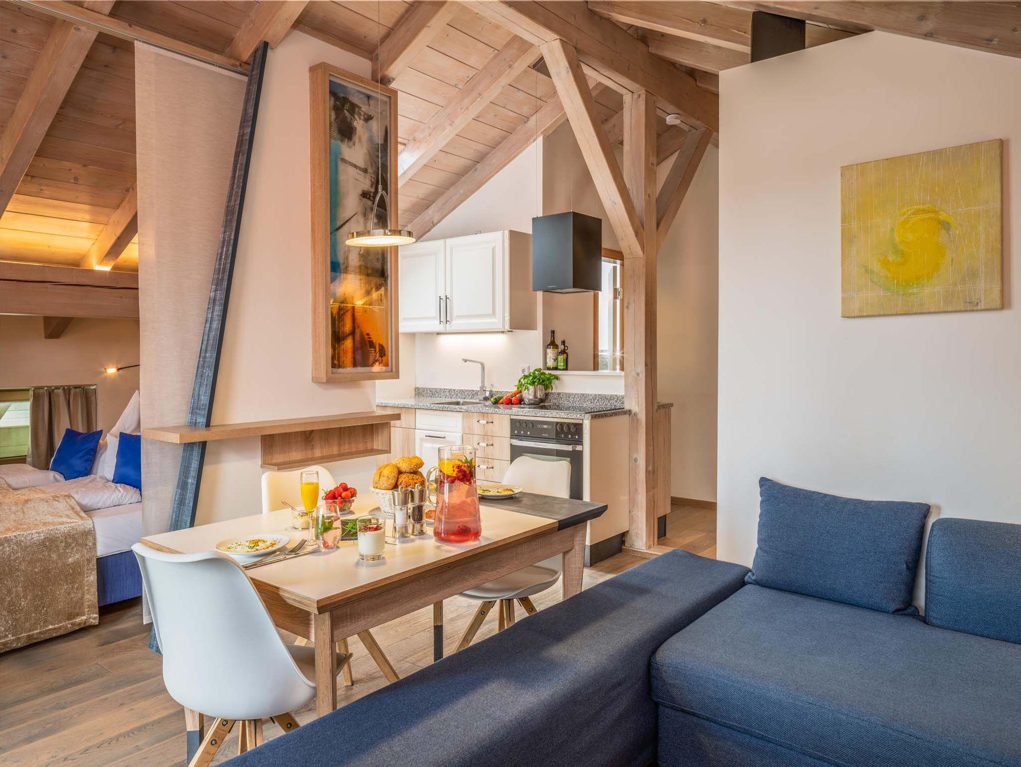 Dieses Appartement im Dachgeschoss in warmer Holzatmosphäre kombiniert Gemütlichkeit mit modernem Design. Das Appartement mit offenem Wohn- und Kochbereich verfügt über einen optisch abgetrennten Schlafbereich sowie ein separates Schlafzimmer. Im Bad befindet sich neben einer Regendusche eine großzügige Badewanne für die besondere Entspannung. Vom Balkon aus geniessen Sie den wundervollen Blick auf den Pelhamer See und die Berge. Hochwertige Ausstattung und kreatives Raumdesign runden das Gesamtpaket dieser Wohnung ab.