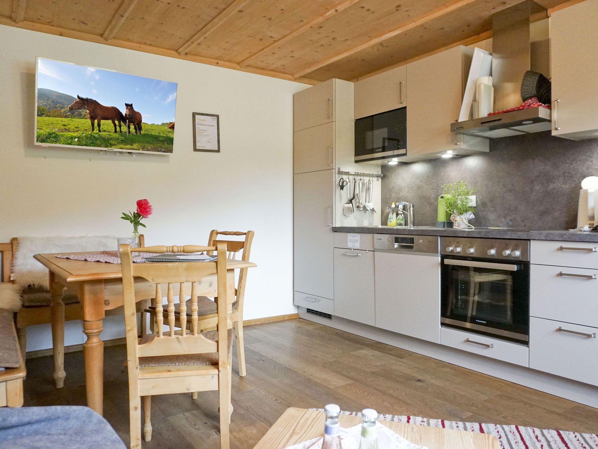 Wohnraum mit gut ausgestatteter Küchenzeile, Spülmaschine, TV, Autostellplatz.