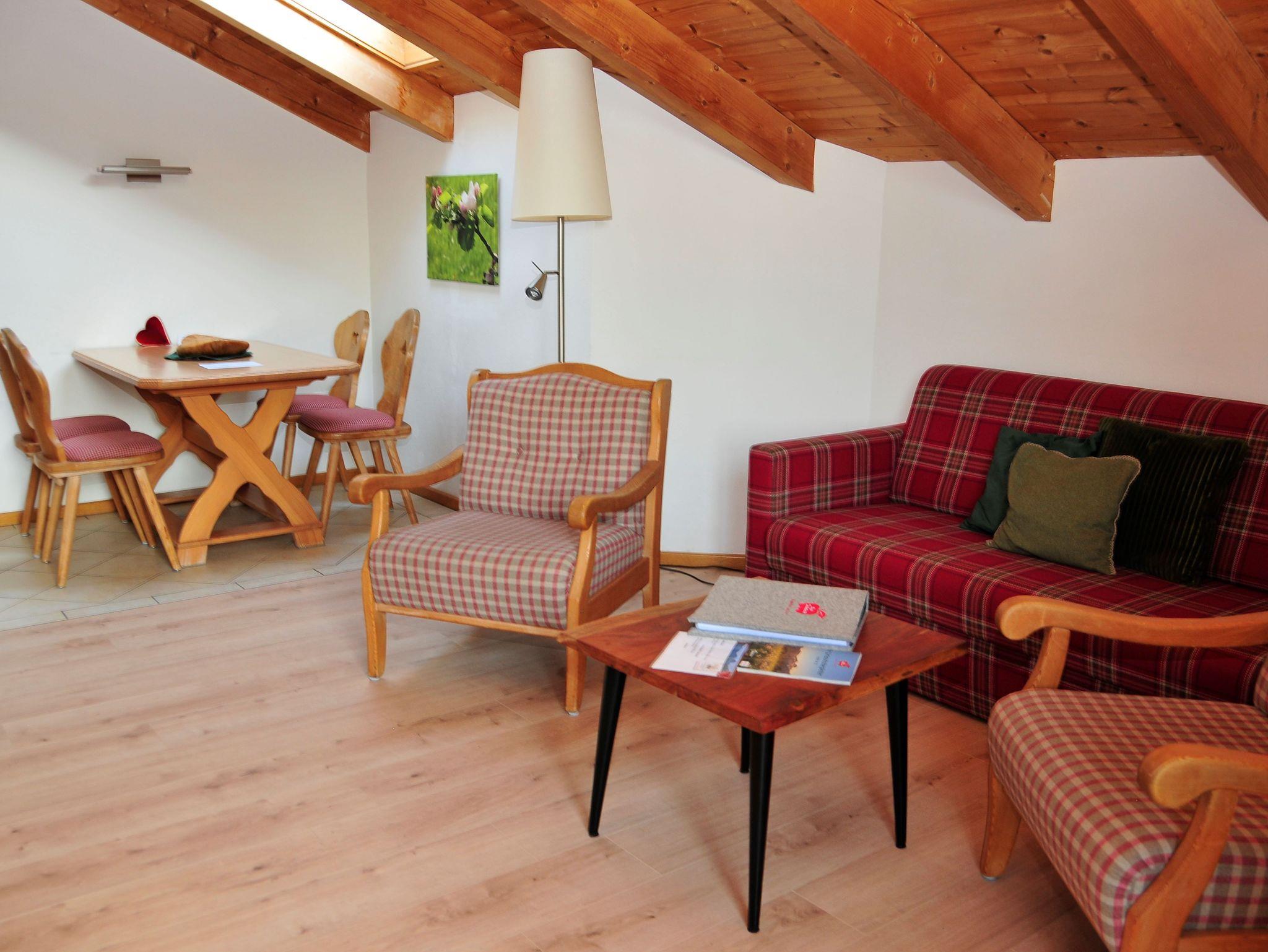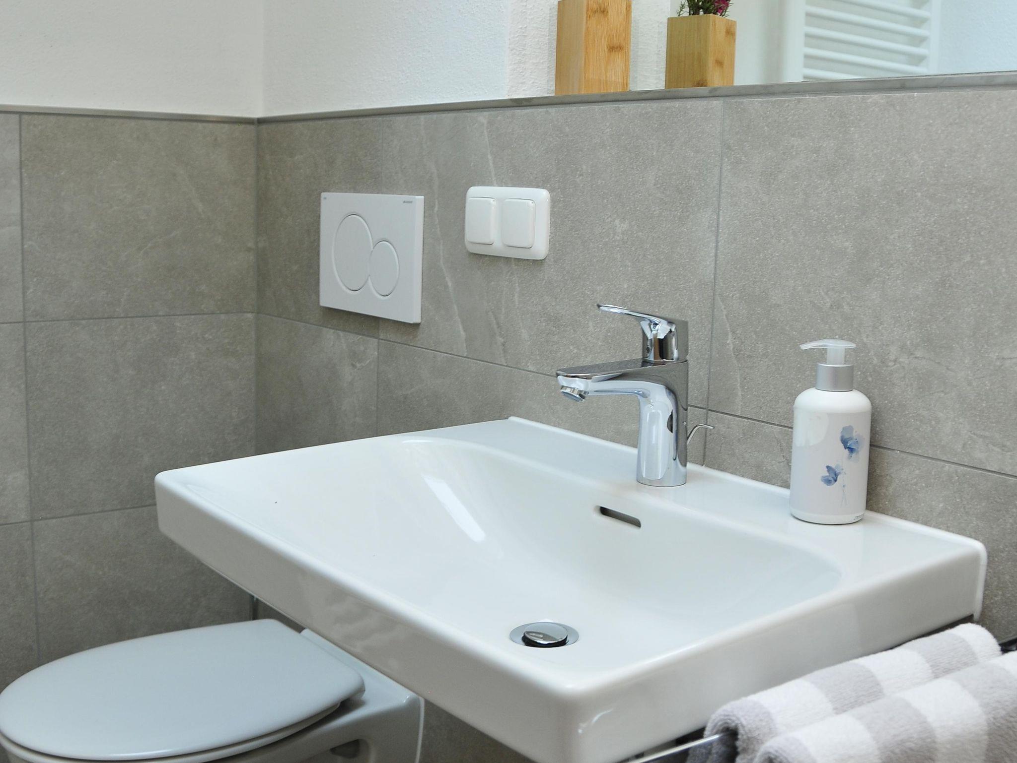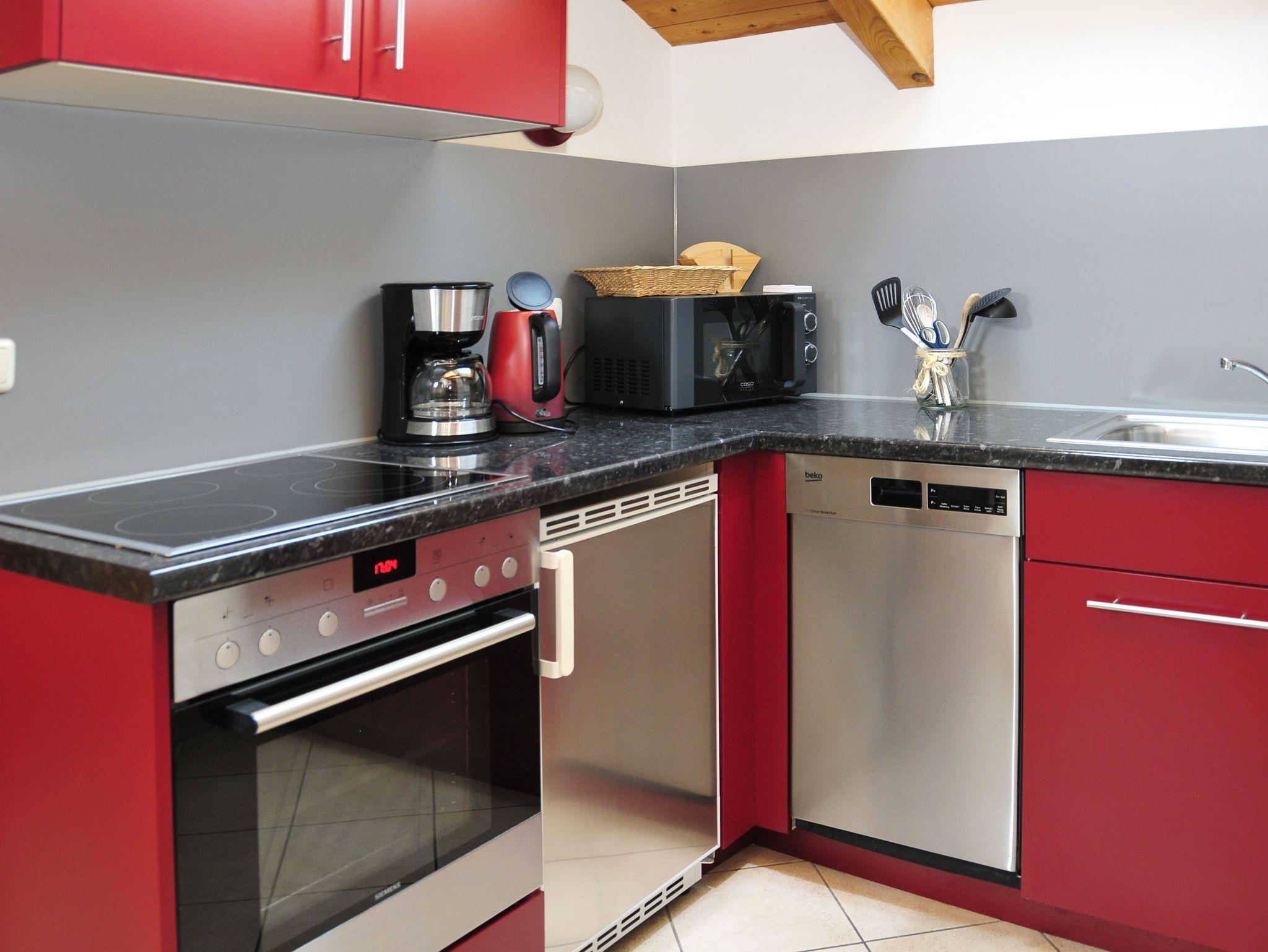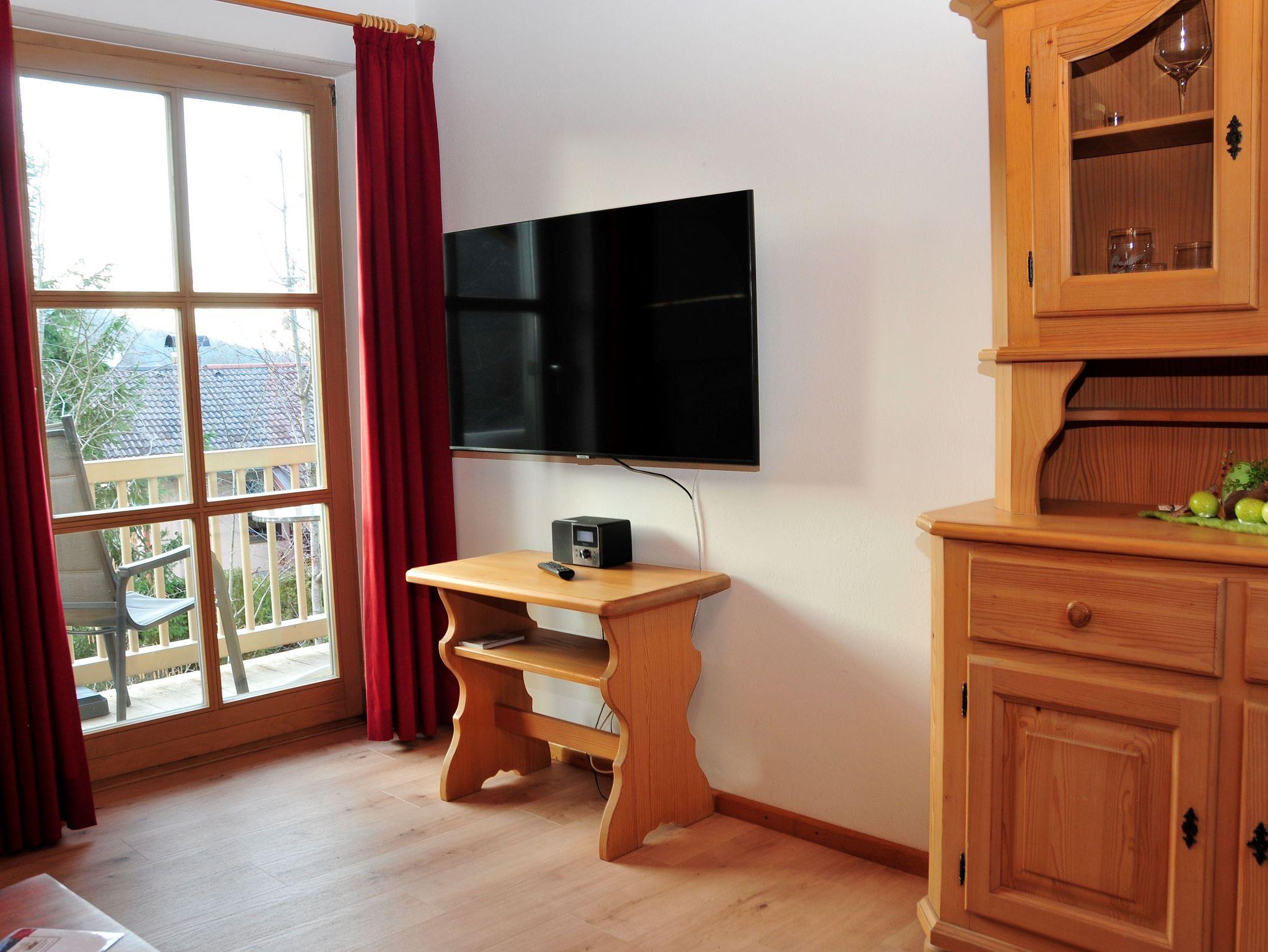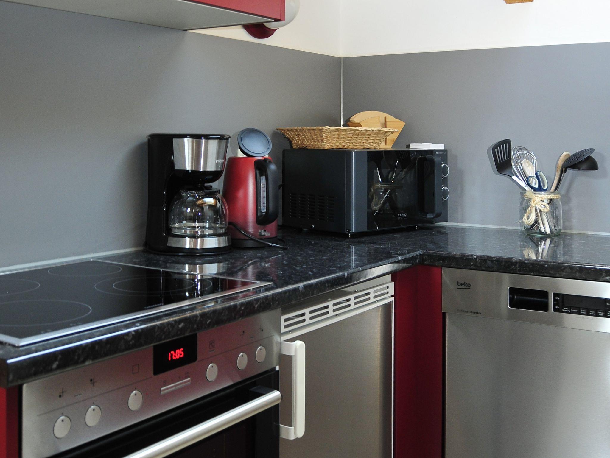 2-4 Personen, 50m², Dachgeschoss, Wohnzimmer mit Couchgarnitur, Fernseher, Radio mit Bluetooth, W-LAN kostenlos, Küche in der Diele, Spülmaschine, Backofen, Mikrowelle, Kaffeemaschine, Wasserkocher, Toaster, Geschirr für 4 Personen, Schlafzimmer mit Doppelbett, Bettcouch im Wohnzimmer für 2 Personen geeignet, Dusche mit WC, Föhn, Westbalkon mit Blick auf den nahegelegenen Aubach sowie einem Tisch und 2 Stühlen.