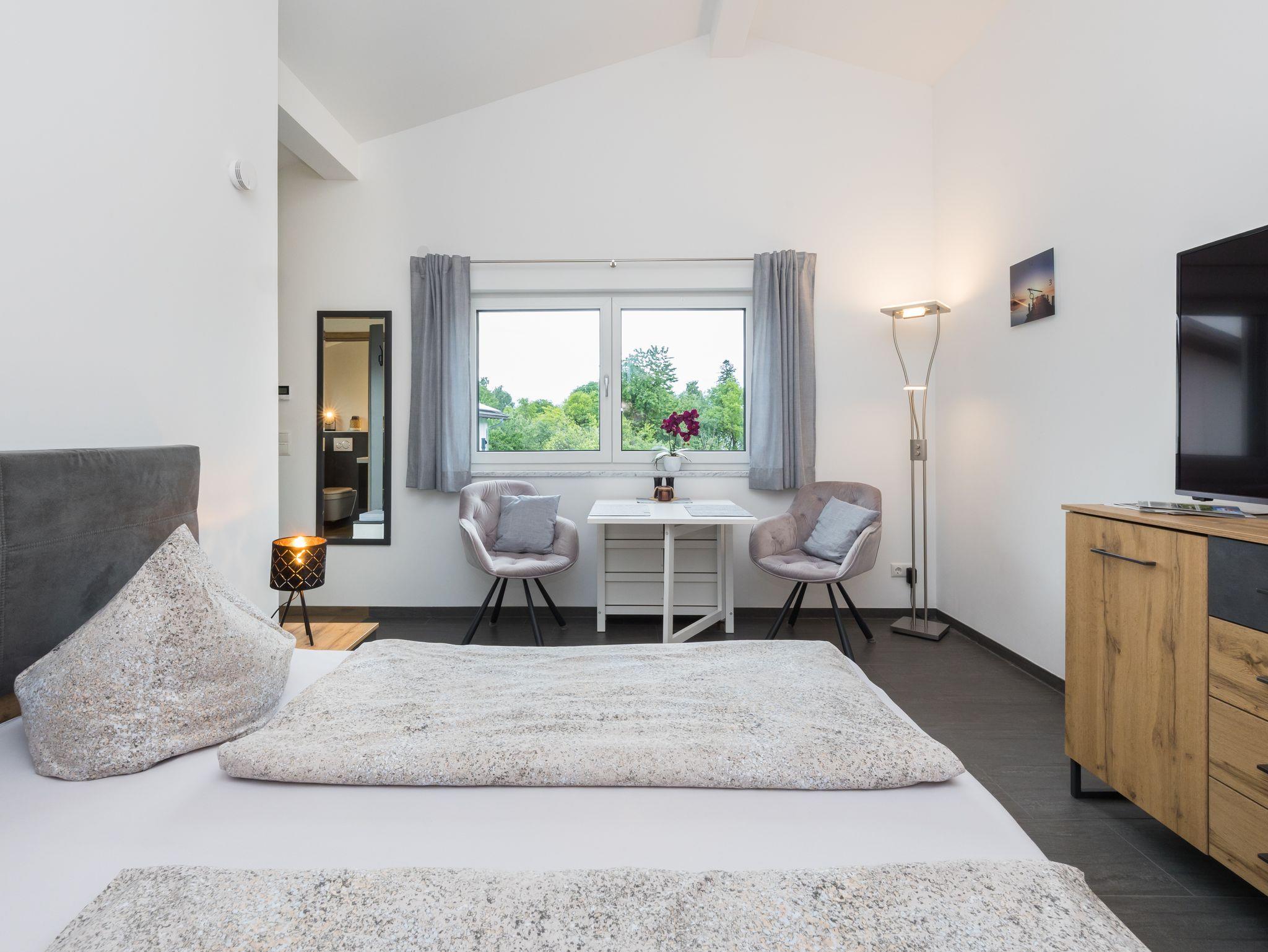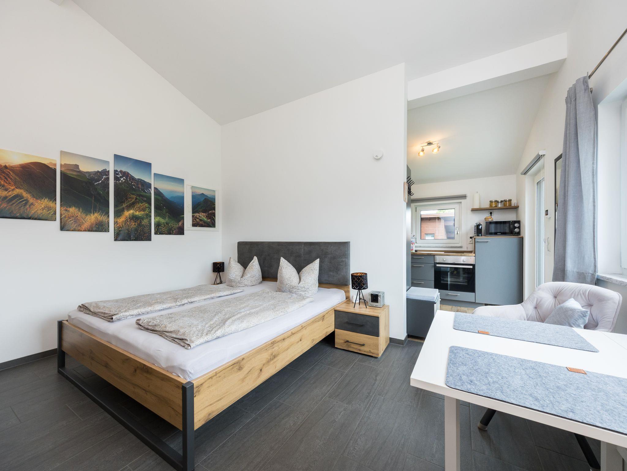 Die helle und freundliche Ferienwohnung liegt in der 1. Etage. Über die Außentreppe auf der Nordseite kommt man zur separaten Eingangstür. Ausgestattet ist das Apartment mit einem gemütlichen Doppelbett, großem Kleiderschrank und einem Flachbild Fernseher. Die kleine Küche im Eingangsbereich lässt keine Wünsche offen. Direkt angrenzend ist das modern gestaltete Badezimmer mit Fenster. Auf dem Balkon genießen Sie die Ruhe und den herrlichen Blick auf die Bergkette. In der gesamten Unterkunft können Sie das W-Lan kostenfrei nutzen.