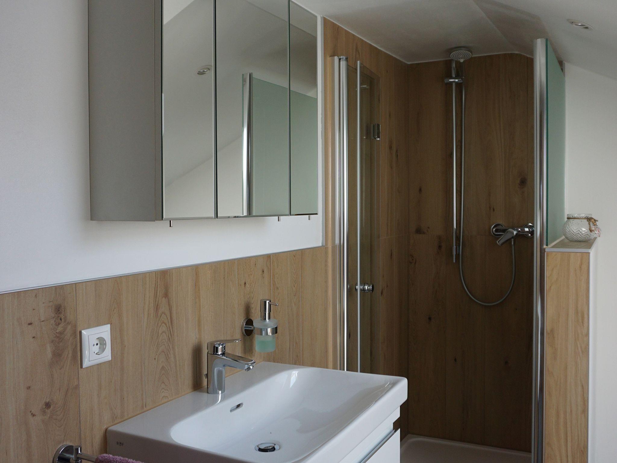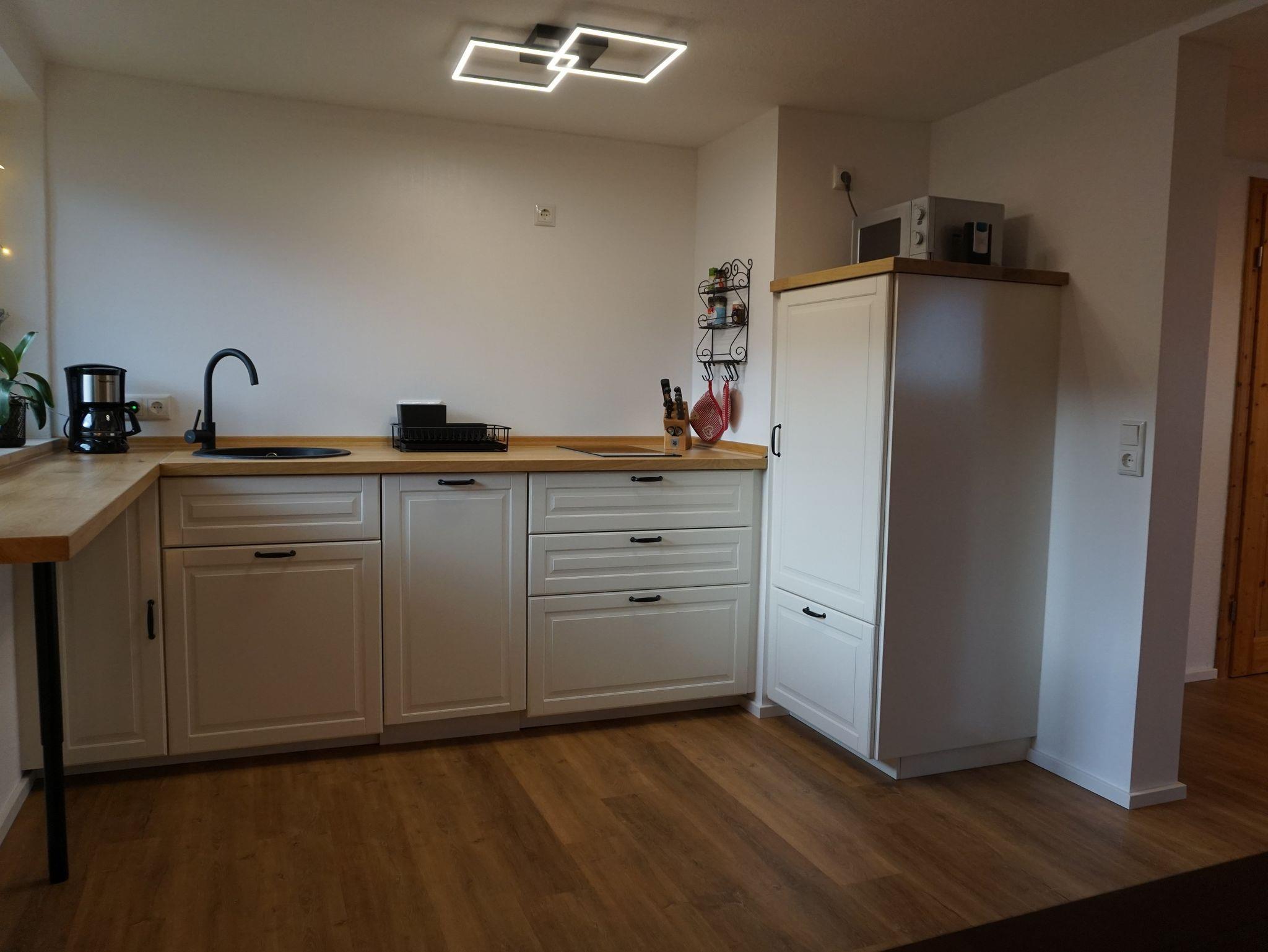 Die Ferienwohnung hat einen offenen Wohn- und Essbereich, eine sehr gut ausgestattete Küche inkl. Geschirrspüler, Kaffeemaschine, Mikrowelle, Wasserkocher und einem Induktionskochfeld (Grundausstattung wie Salz, Pfeffer, Filtertüten vorhanden). Ausgestattet mit einem großem Schlafzimmer mit Doppelbett, einem großzügigen Bad mit Dusche, einem TV und WLAN. Die Außentreppe hat einen integrierten kleinen Balkon mit gemütlicher Bank.