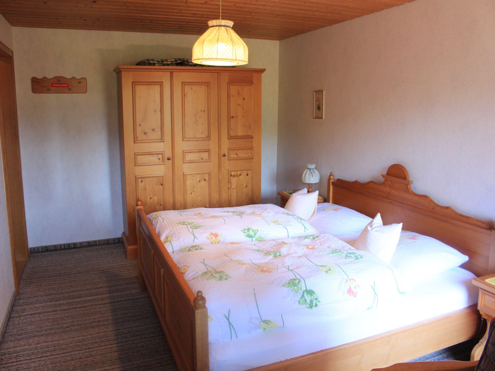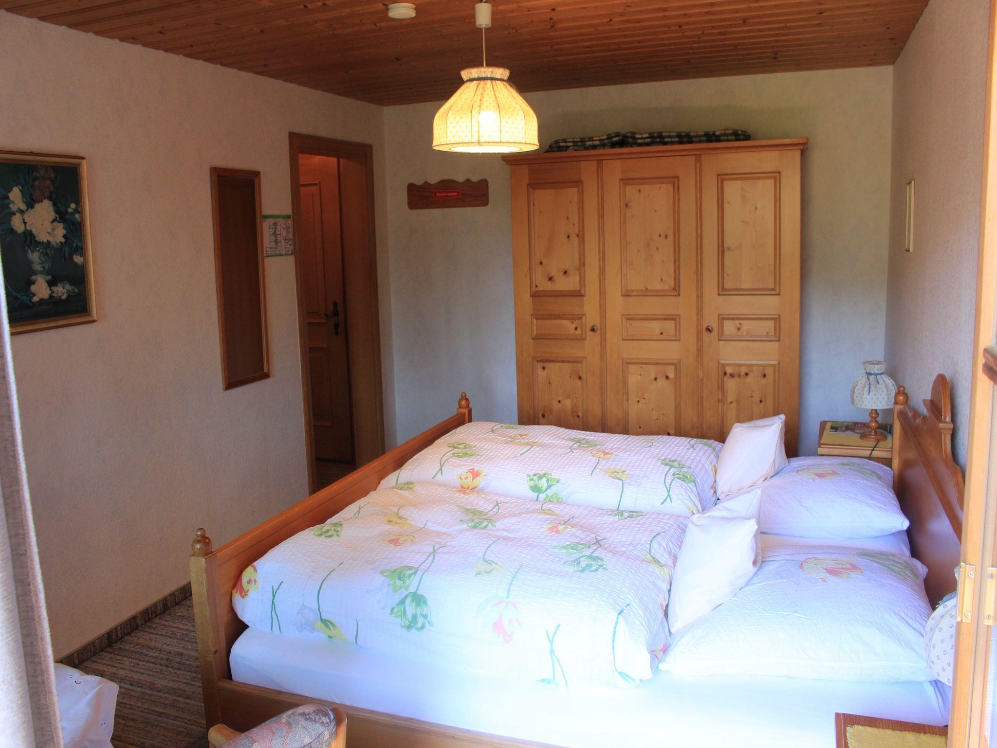 Das Doppelzimmer liegt auf der Südseite mit Blick auf den Garten. Der Balkon lädt mit einem Tisch und zwei Stühlen zum Verweilen ein. Das Bett hat eine Größe von 2 auf 2 m und ist unten geschlossen. Das Zimmer ist mit einem Dreitürigen Schrank, DU/WC, Teppichboden, einer kleine Sitzecke und einem TV-Sat Gerät mit 70 cm Bildschirmdiagonale ausgestattet. Im Bad ist ein Föhn vorhanden. Aus Platzmangel keine Möglichkeit für Beistellbetten. WLAN ist vorhanden.