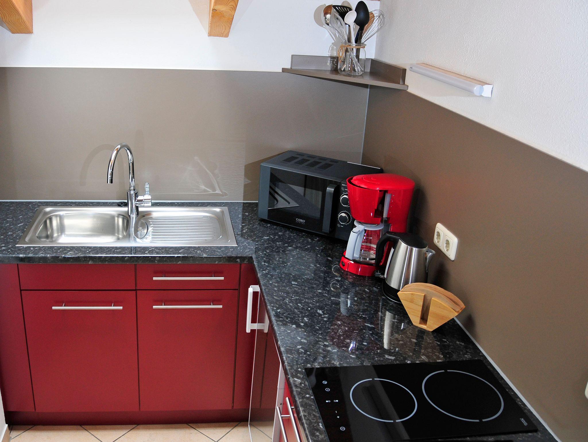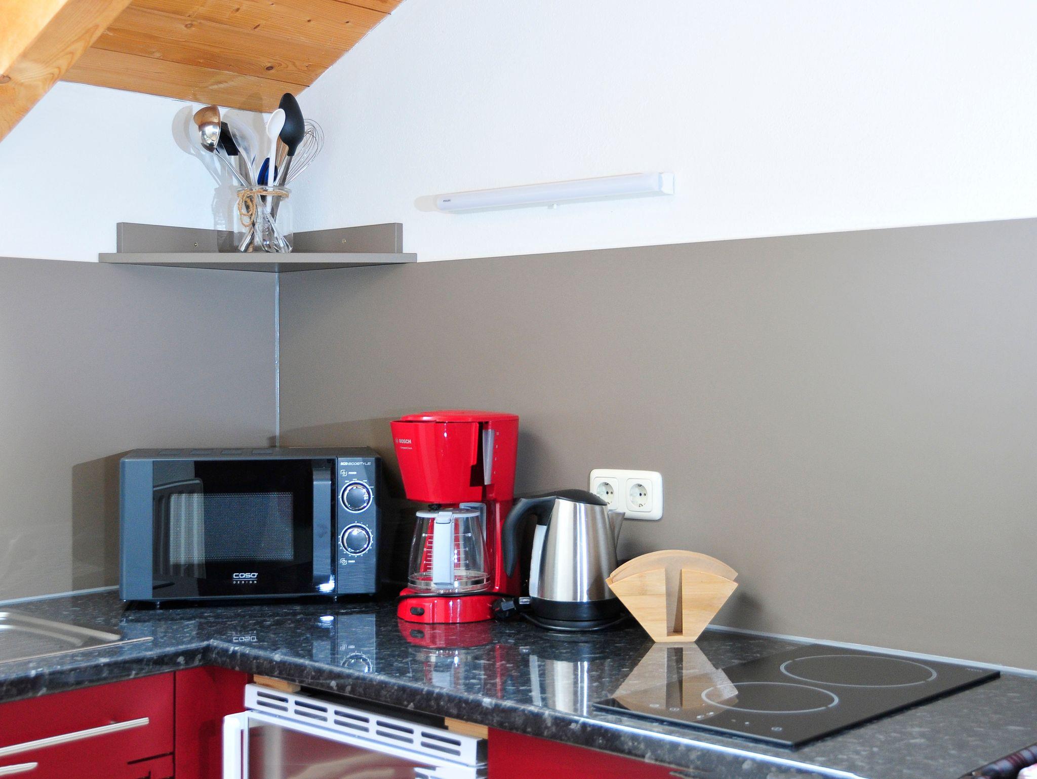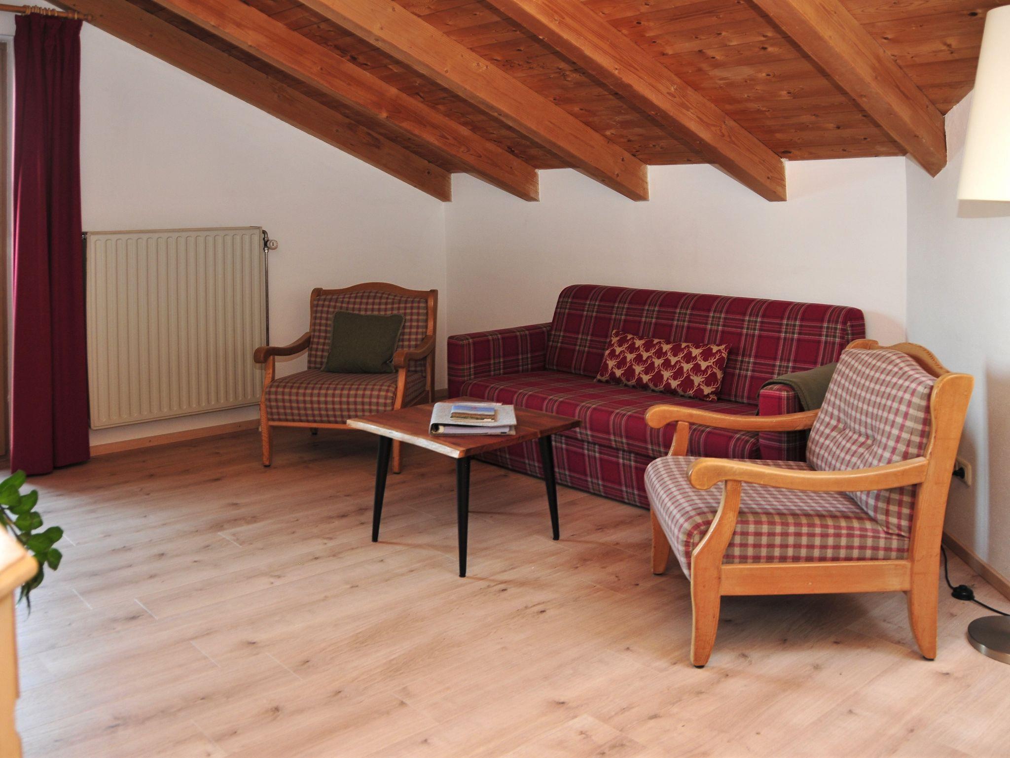 2-4 Personen, 50m², Dachgeschoss, Wohnzimmer mit Couchgarnitur, Fernseher, Radio mit Bluetooth, W-LAN kostenlos, Küche in der Diele, Mikrowelle, Kaffeemaschine, Wasserkocher, Toaster, Geschirr für 4 Personen, Schlafzimmer mit Doppelbett, Bettcouch im Wohnzimmer für 2 Personen geeignet, Dusche mit WC, Föhn, Ostbalkon mit Blickrichtung Hochsalwand und Heuberg, sowie einem Tisch und 2 Stühlen.