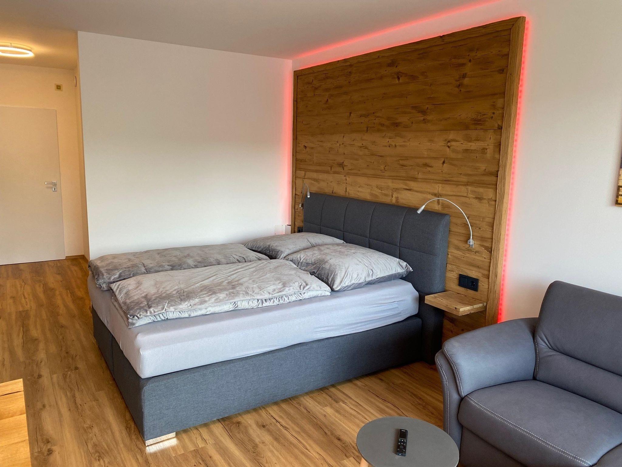 Die neu renovierte Ferienwohnung mit 30m² Wohnfläche bietet Platz für 1-2 Personen. Der gemütliche Wohn- und Schlafbereich mit Essecke und Flachbild-TV lädt zum Verweilen ein. Das komfortable Doppel-Boxspringbett mit Blick auf den Balkon und ins Grüne garantiert unseren Gästen einen erholsamen Schlaf. Die Ferienwohnung verfügt über eine komplett ausgestattete Kochnische mit Geschirrspüler, Kühlschrank, Herd, Wasserkocher und Kaffeemaschine. Das geräumige Badezimmer mit ebenerdiger Dusche, großem Spiegel und Handtuchtrockner rundet das Gesamtbild ab. Vor allem im Sommer können Sie den Abend entspannt am Balkon ausklingen lassen. Bitte beachten Sie, dass keine Haustiere erlaubt sind. Das WLAN im Thermenbereich können Sie kostenfrei nutzen.