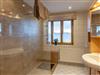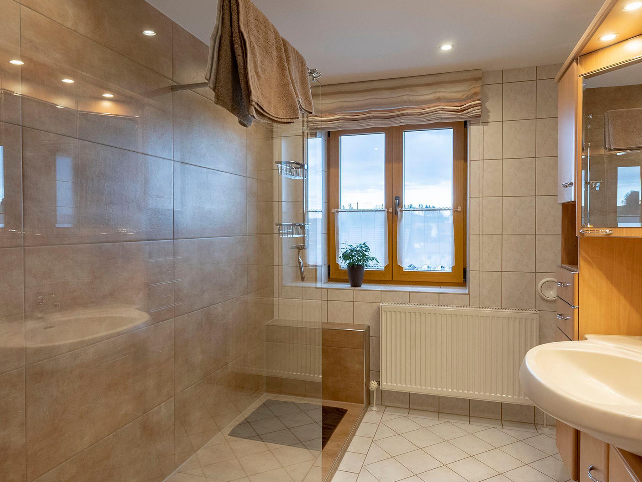 Bad: Dusche, Waschbecken mit Spiegel und Schränke.