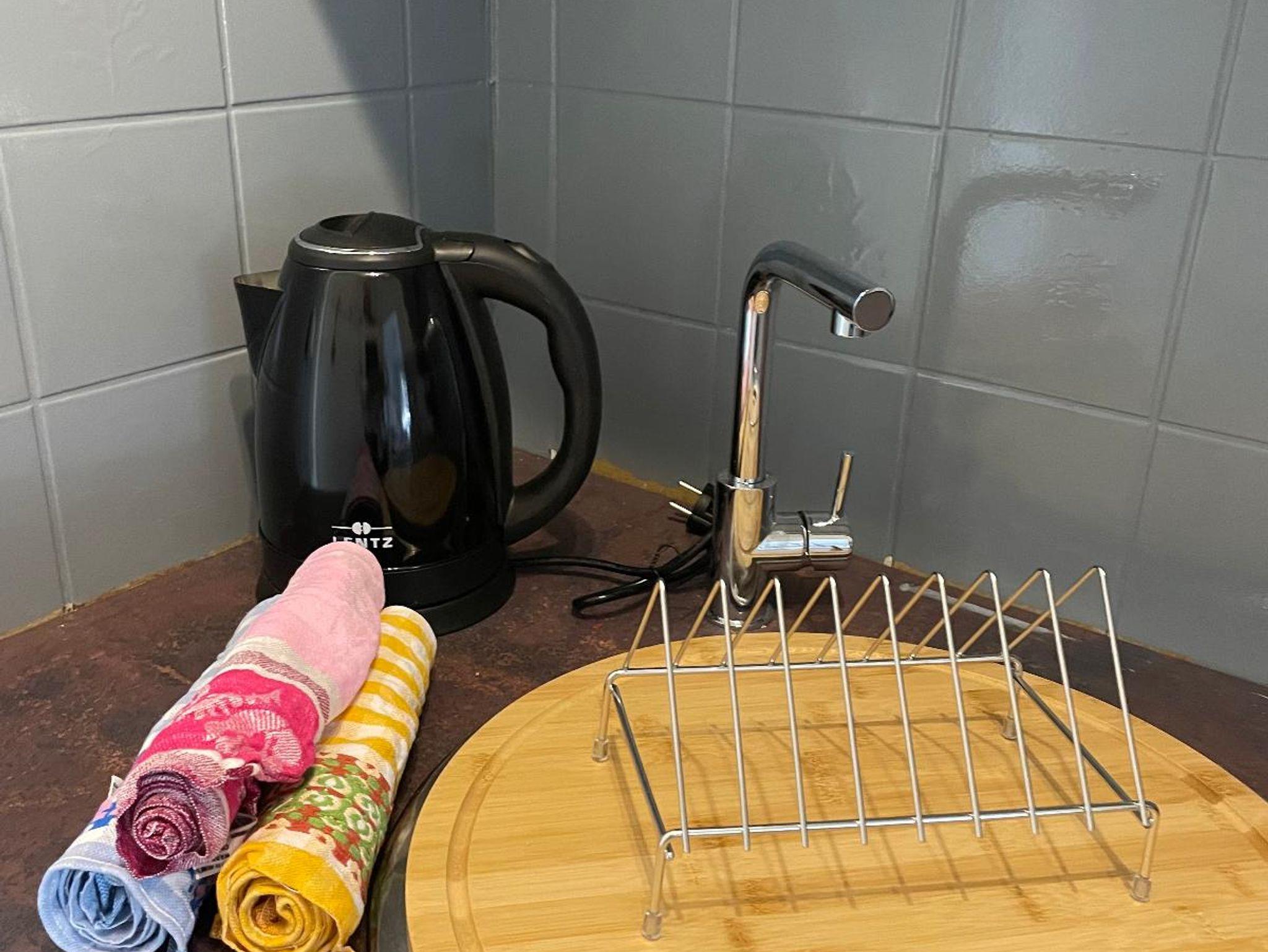 Dazu gehören Besteck, Geschirr, Töpfe und Pfannen, sowie ein Begrüßungsset mit Spültüchern, Spülmittel und Schwamm.