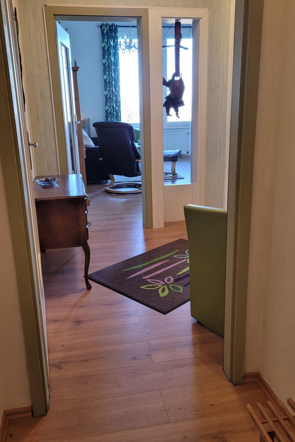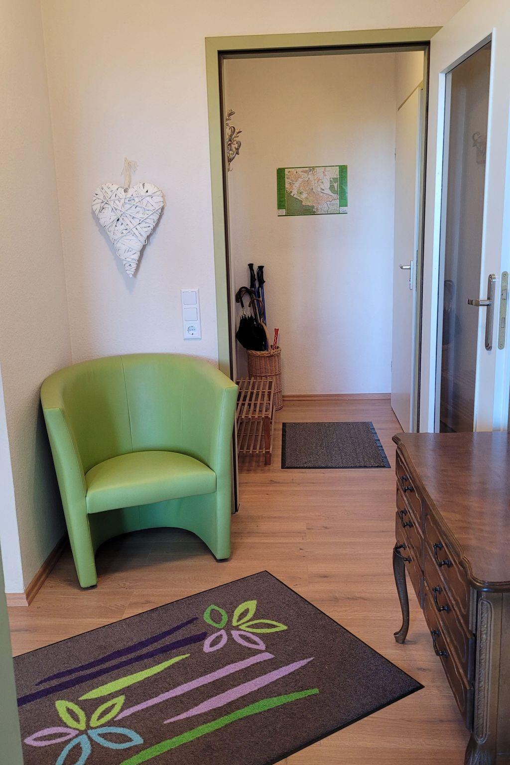 The furnishings are rustic and in good condition. The apartment has a sofa (fold-out sofa bed with a lying area of 1.40x2m), a kitchenette and a cosy dining area. There is a bathroom with shower and WC and a separate bedroom with a comfortable 1.60x2m box-spring bed. Each flat has a covered car park directly in front of the house. There is a key box in this carport with the number 10. Before arrival you will receive a six-digit code to open the box and in the communal cellar there is a washing machine and dryer as well as a lockable bicycle cellar. Next to the entrance door on the 1st floor there is a communal balcony (south-facing) with seating and parasol. A barbecue is available and can be used.