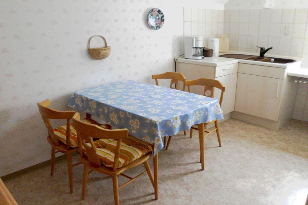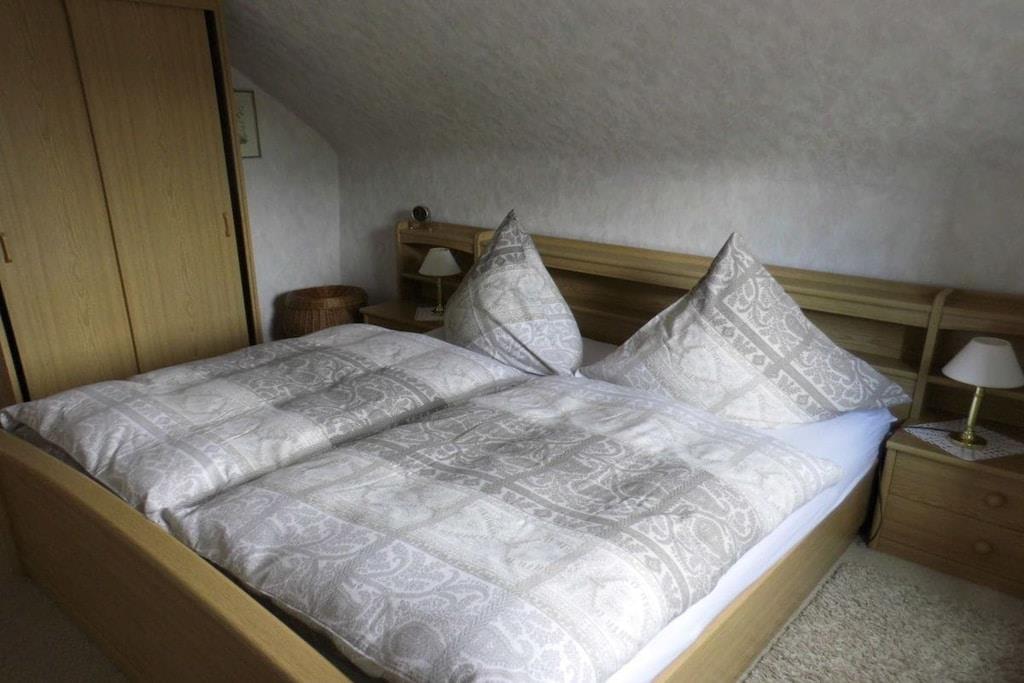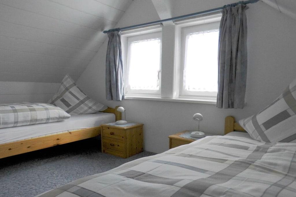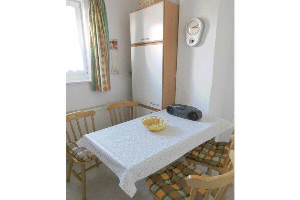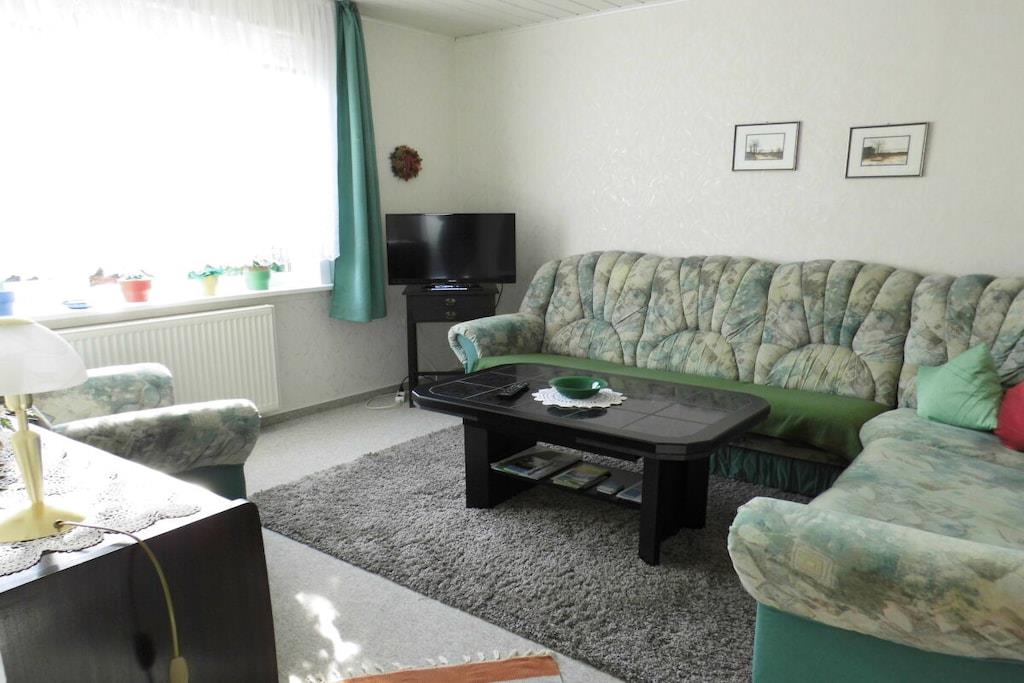 Das Ferienhaus ist ca. 50 m² groß komplett eingerichtet mit einem Schlafzimmer mit 4 Einzelbetten 100*200 cm, und Kleiderschrank. Separate Küche, Esstisch bis 4 Personen, Kaffeemaschine, Toaster, Wasserkocher, Mixer, 4-Plattenherd mit Backofen, Kühlschrank mit Gefrierfach. Seperates WC, Badezimmer mit Dusch, Waschbecken, Föhn und Badeschrank. Seperates Wohnzimmer befindet sich ein TV SAT/Kabel, CD-Player-Radio. Im Flur befindet sich eine Garderobe und ein Schuhständer. PKW-Stellplätze sind auf dem Grundstück vorhanden. Eine Überdache-Terrasse mit Blick in den herrlich blühenden Garten., zum Wohlfühlen, Entspannen, und Erholung ein. Die Fewo ist 50 m² groß mit zwei Schlafzimmer ein Doppelbetten 100* 200 cm, zwei einz. Betten 100*200 cm
