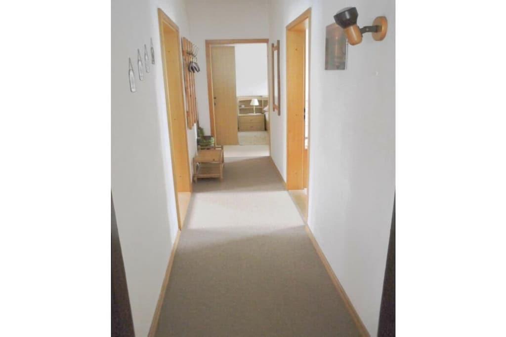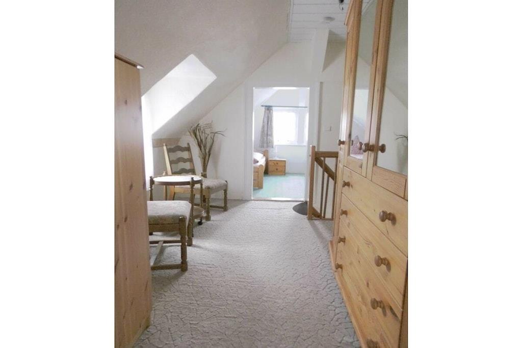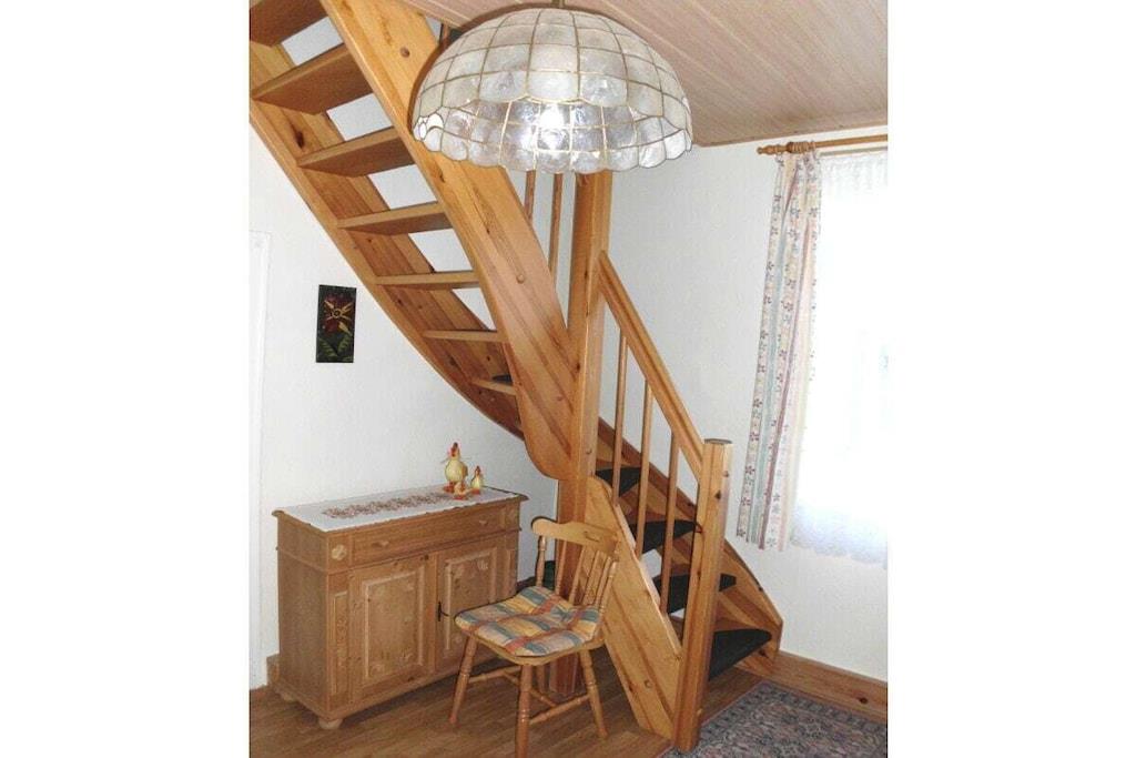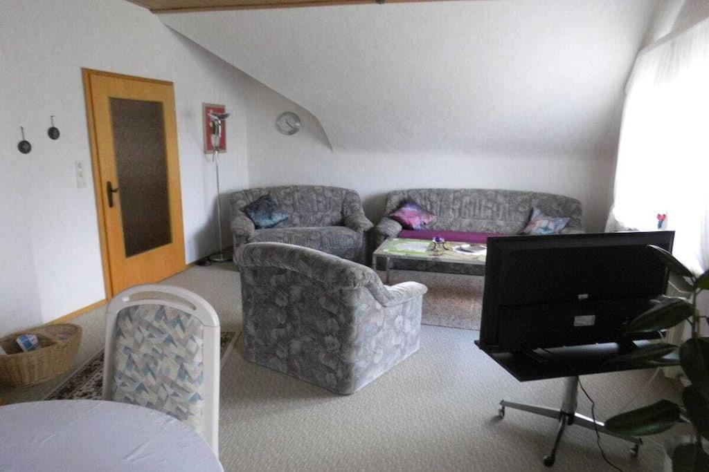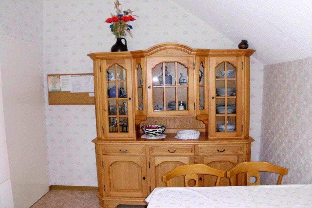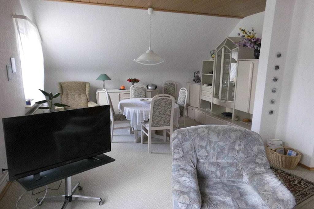 Das Ferienhaus ist ca. 50 m² groß komplett eingerichtet mit einem Schlafzimmer mit 4 Einzelbetten 100*200 cm, und Kleiderschrank. Separate Küche, Esstisch bis 4 Personen, Kaffeemaschine, Toaster, Wasserkocher, Mixer, 4-Plattenherd mit Backofen, Kühlschrank mit Gefrierfach. Seperates WC, Badezimmer mit Dusch, Waschbecken, Föhn und Badeschrank. Seperates Wohnzimmer befindet sich ein TV SAT/Kabel, CD-Player-Radio. Im Flur befindet sich eine Garderobe und ein Schuhständer. PKW-Stellplätze sind auf dem Grundstück vorhanden. Eine Überdache-Terrasse mit Blick in den herrlich blühenden Garten., zum Wohlfühlen, Entspannen, und Erholung ein. Die Fewo ist 50 m² groß mit zwei Schlafzimmer ein Doppelbetten 100* 200 cm, zwei einz. Betten 100*200 cm