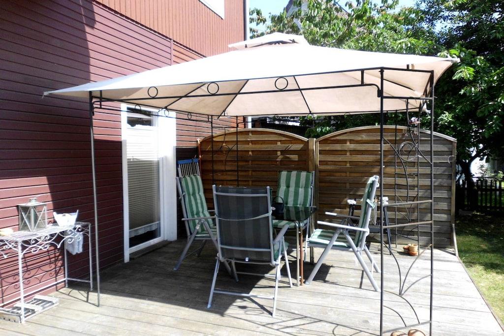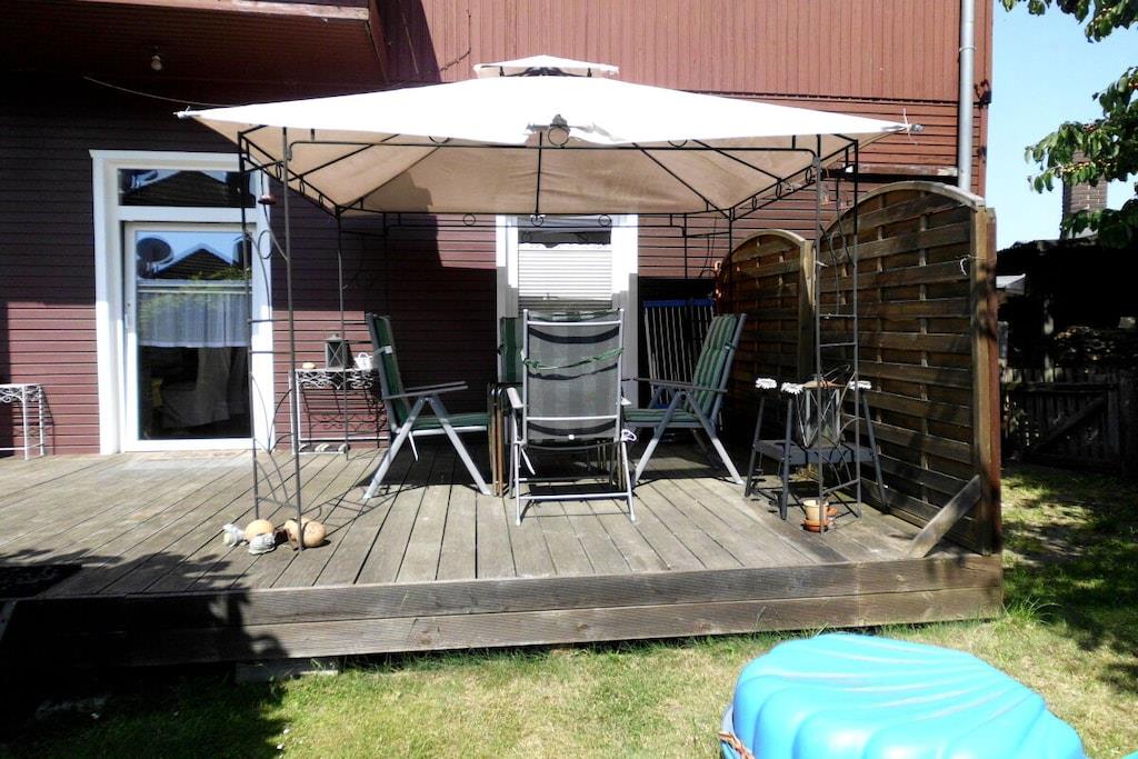 Stueetage: (Stue(, enkeltsovesofa, Fjernsyn, kakkelovn), Køkken(, tekøkken, kogeplade, elkedel, brødrister, kaffemaskine, ovn, grill, opvaskemaskine , køleskab, fryser, tremmeseng), soveværelse(, , dobbeltseng, radio), soveværelse(, , enkeltsovesofa, dobbeltseng), badeværelse(, toilet, badekar, bruser, håndvask, Håndklæder inkl.), badeværelse(, toilet, håndvask, Håndklæder inkl.)) , loungerum(sauna), Internetadgang, varme, terrasse(, havemøbler, solstole), parkering, Parasol, cykler til rådighed, strygebræt, strygejern