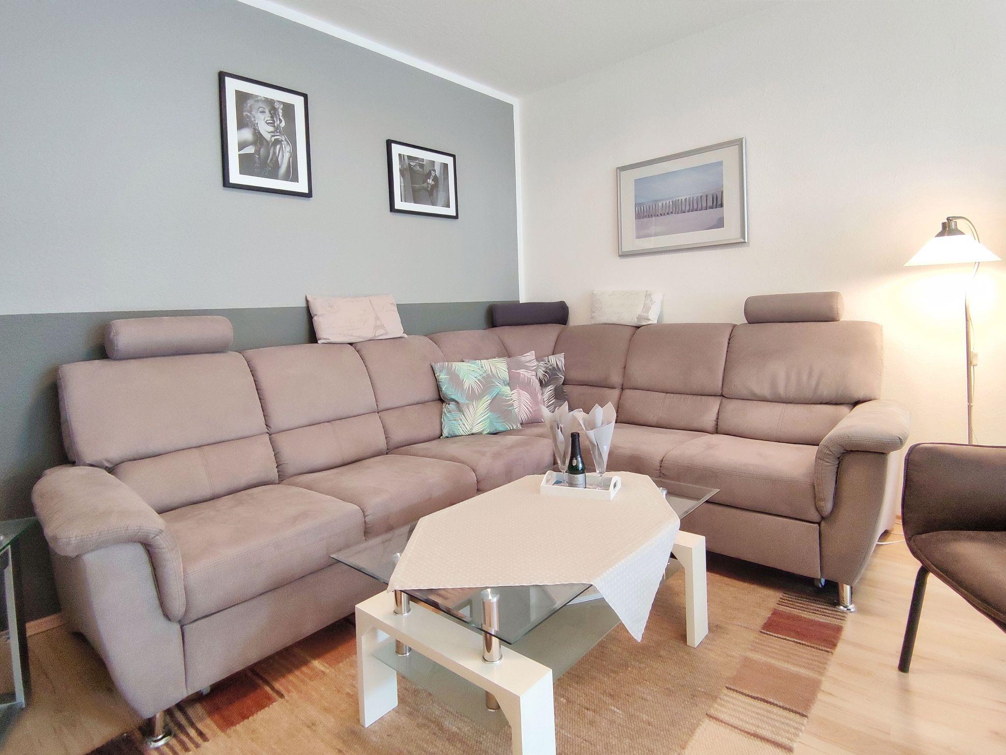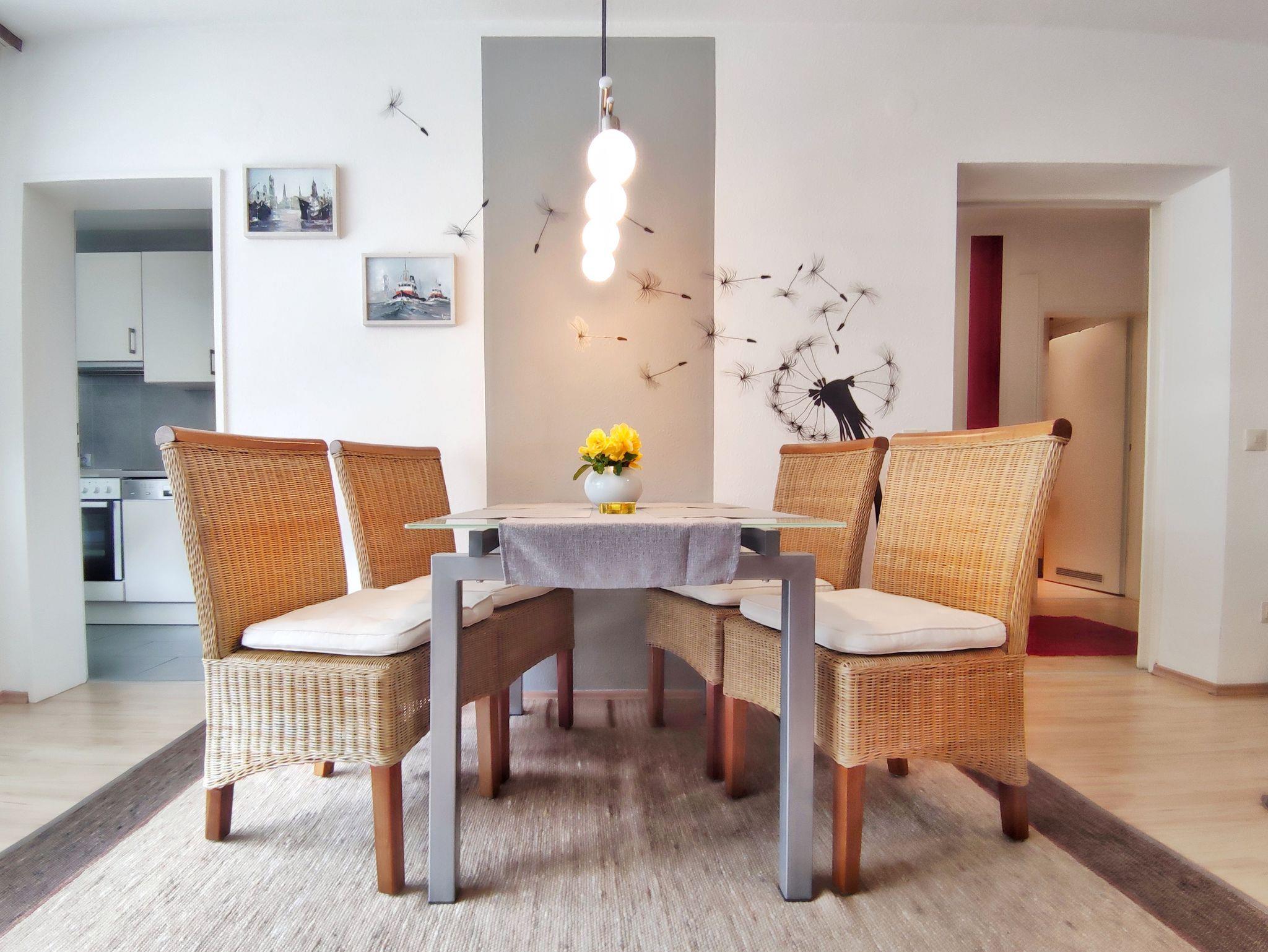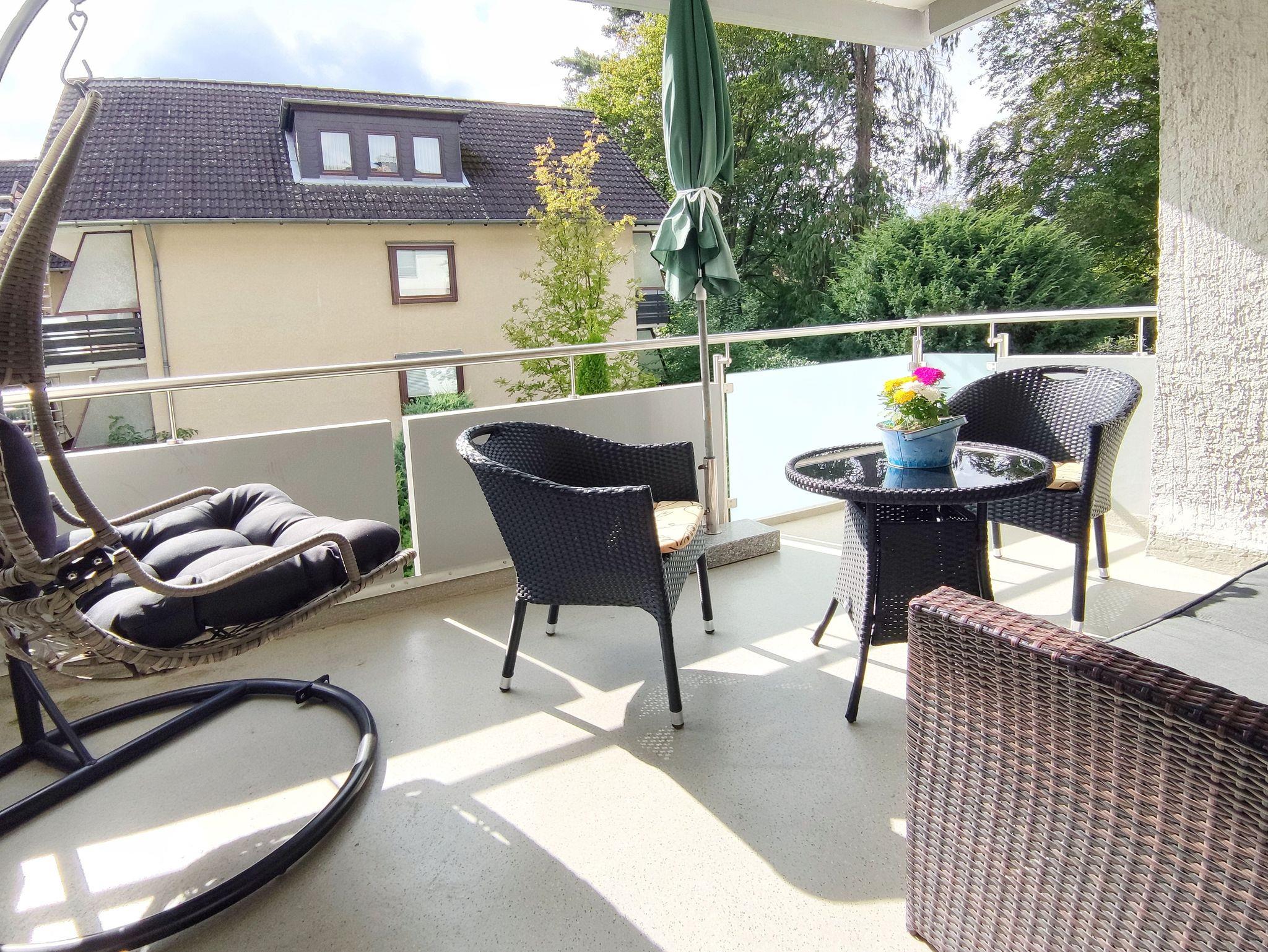 Die 53 qm grpße gemütliche Ferienwohnung mit Balkon befindet sich in der 1. Etage in einer kleinen gepflegten Wohnanlage. Für PKW Anreisende steht ein Stellplatz kostenfrei zur Verfügung. Die moderne Wohnung verfügt über Laminatboden - im Bad Fliesen. Das Wohnzimmer mit Esstisch bietet neben einer kompfortablen Couch ein großzügiges Ambiente mit Blick auf den Stadtpark. Kabel-TV (Flachbildschirm). Das Schlafzimmer ist mit einem Doppelbett ausgestattet. Die ebenfalls neue Einbau-Küche besteht aus einem Backofen mit Ceranfeld, Kühlschrank, Gefrierschrank, Mikrowelle, Geschirrspüler und Kücheninventar (Toaster, Kaffeemaschine usw.) Das neu erstellte Bad hat eine Runddusche mit niedrigem Einstieg, Waschbecken und ein WC. Kostenloses WLAN.