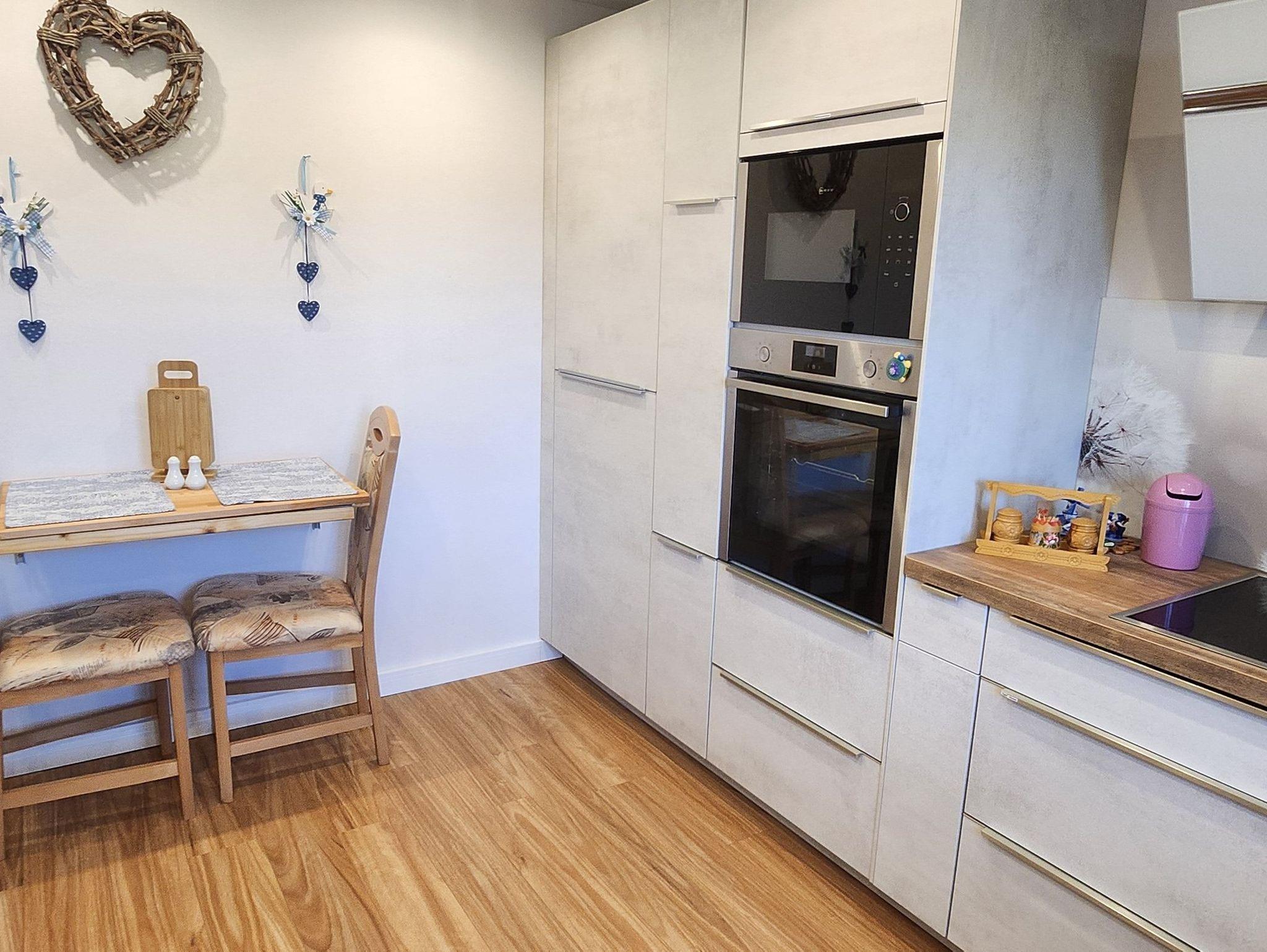 Die modern ausgestattete Küche bietet ihnen einen Kühlschrank, Gefrierschrank, große Mikrowelle, Induktionskochfeld, Backofen, Spülmaschine und Sitzgelegenheit für zwei Personen. Des Weiteren runden eine Kaffeemaschine, Senseopadmaschine, Wasserkocher, Toaster und Eierkocher das Kocherlebnis ab.