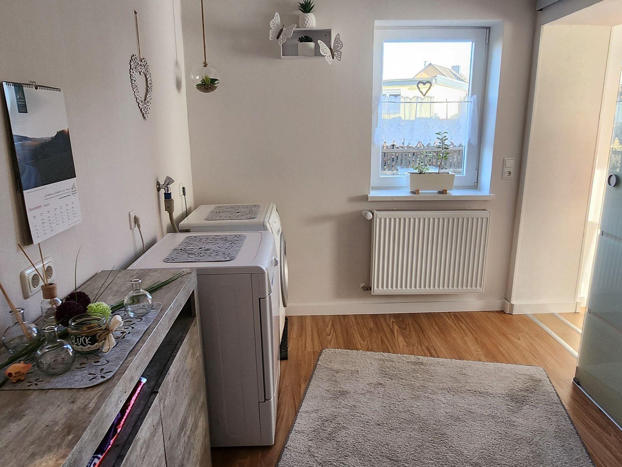 Das Badezimmer hat eine begehbare Dusche, Waschtisch, WC und einen Haartrockner. Im Flur steht eine Waschmaschine und ein Trockner für sie bereit.