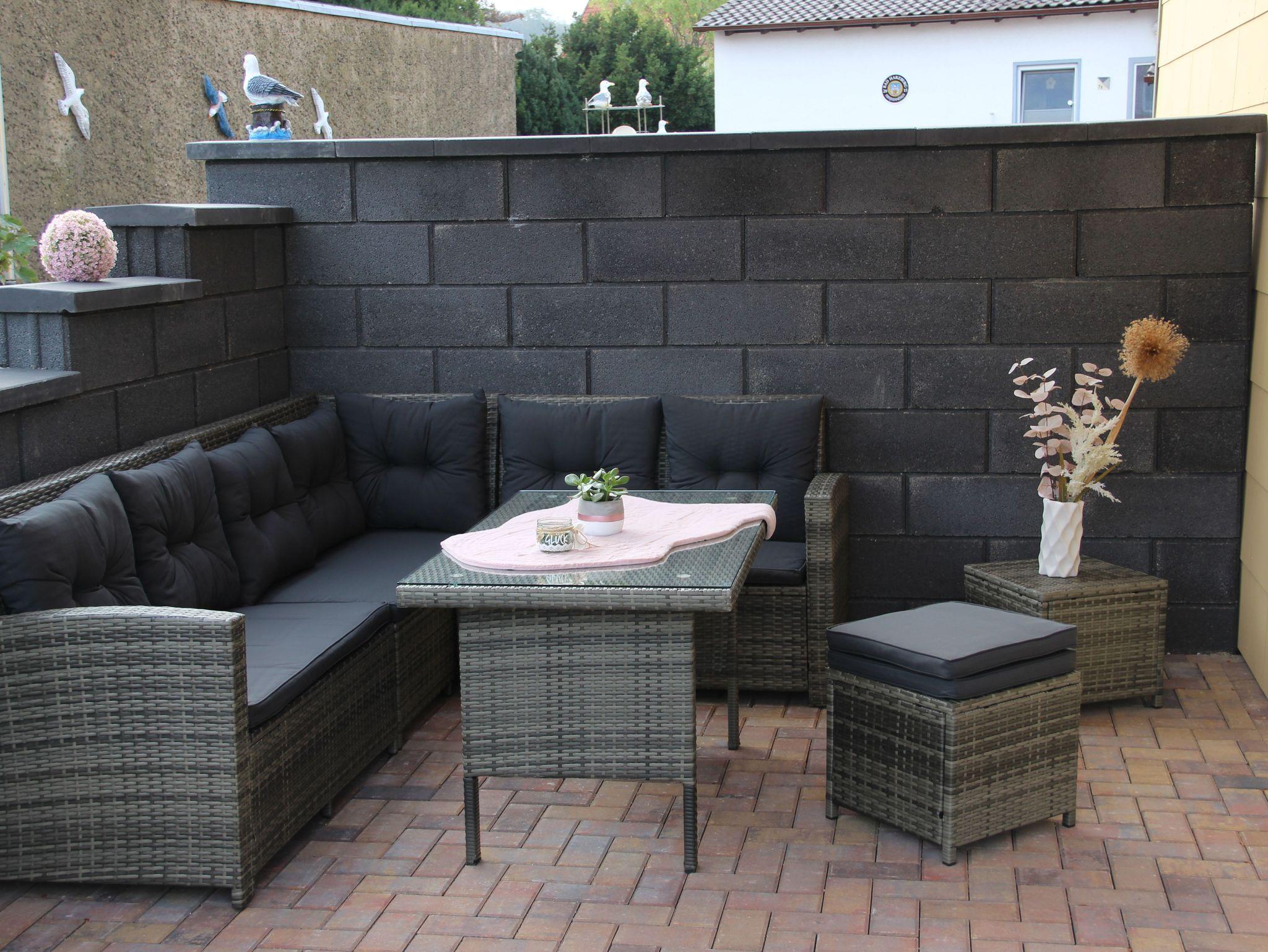 Die Terrasse ist ca. 24 m² große und liegt Richtung Süd-Ost. Auf der Terrasse befindet sich eine Rattan Sitzgruppe für 6 Personen und ein Tisch. Die Terrasse kann mittels elektrischer Markise abgedunkelt werden.