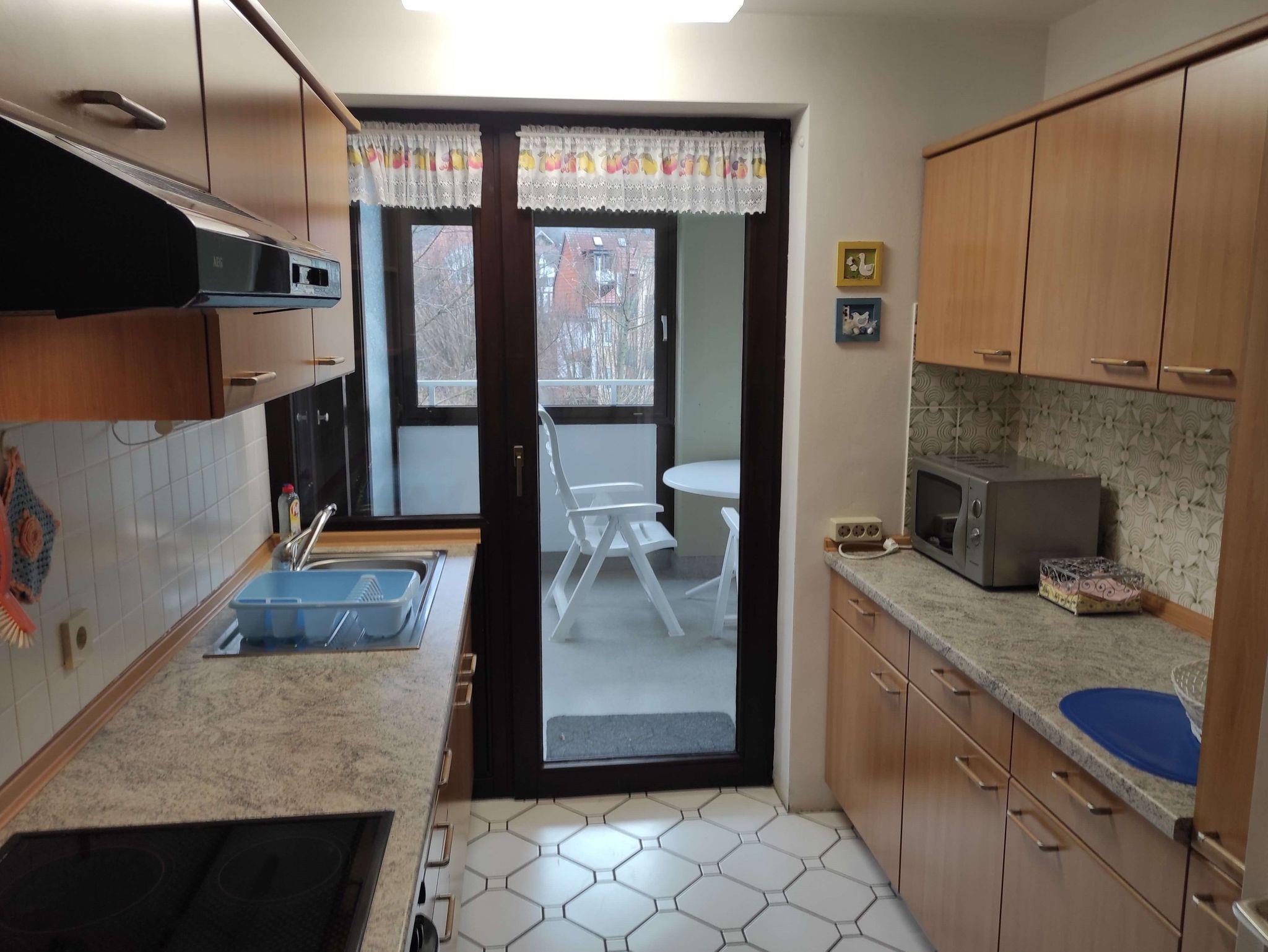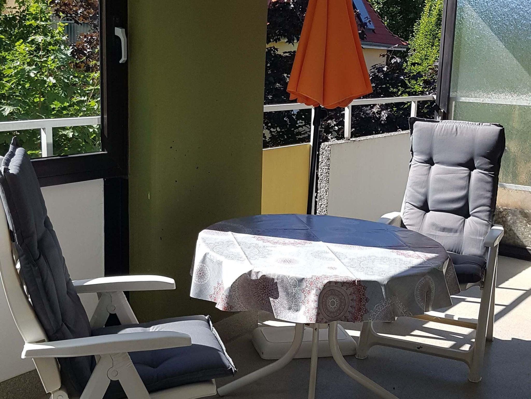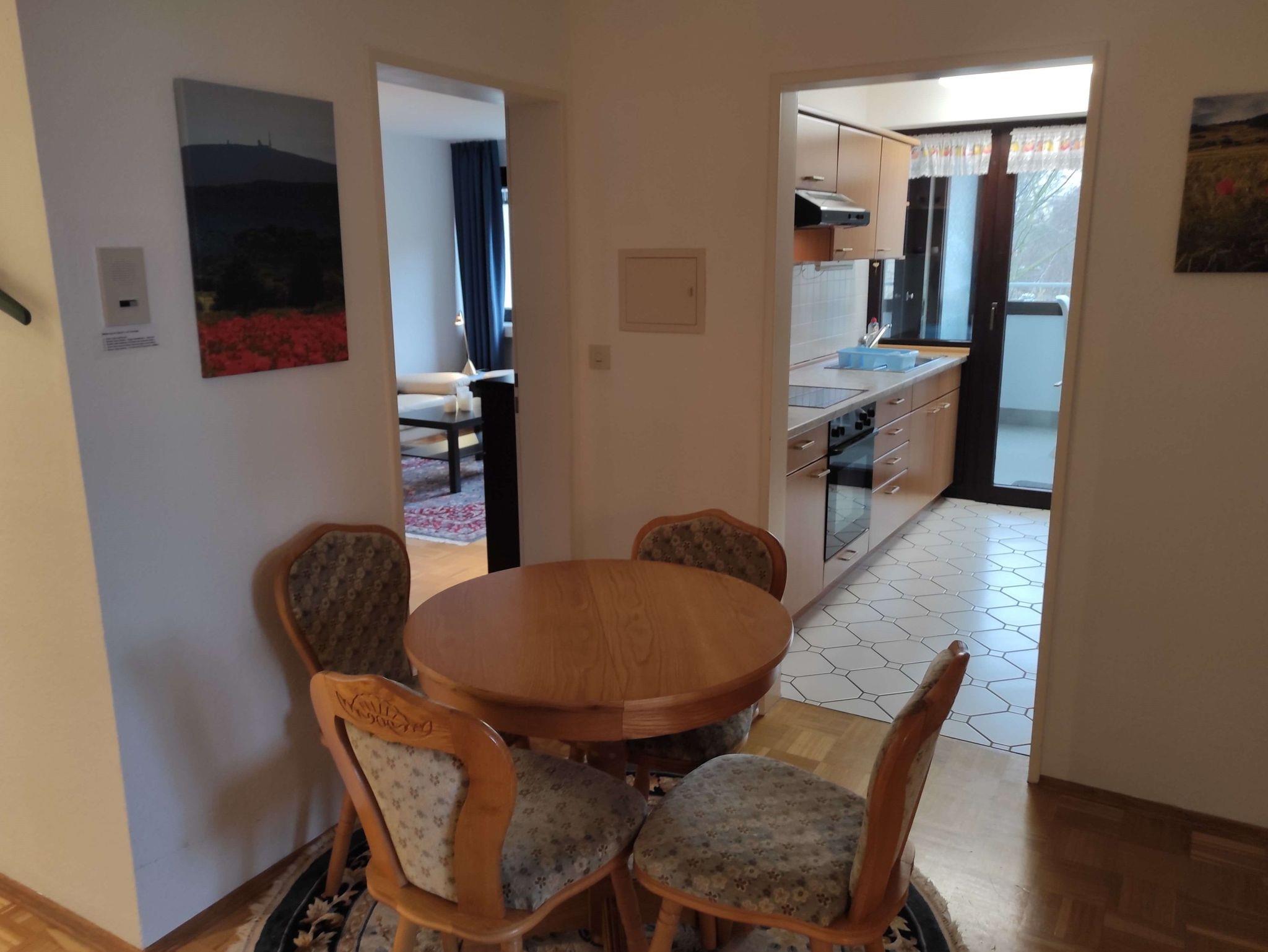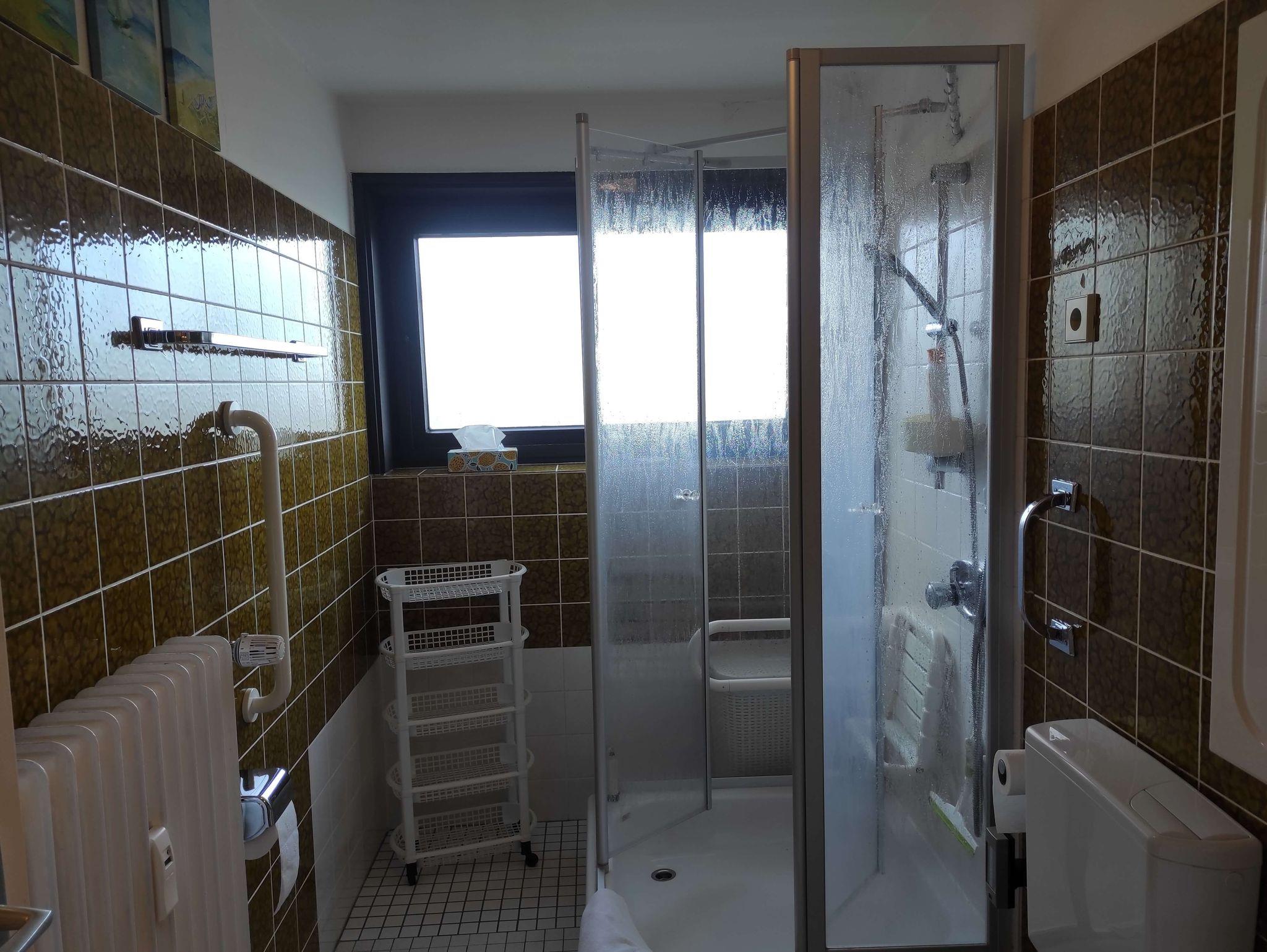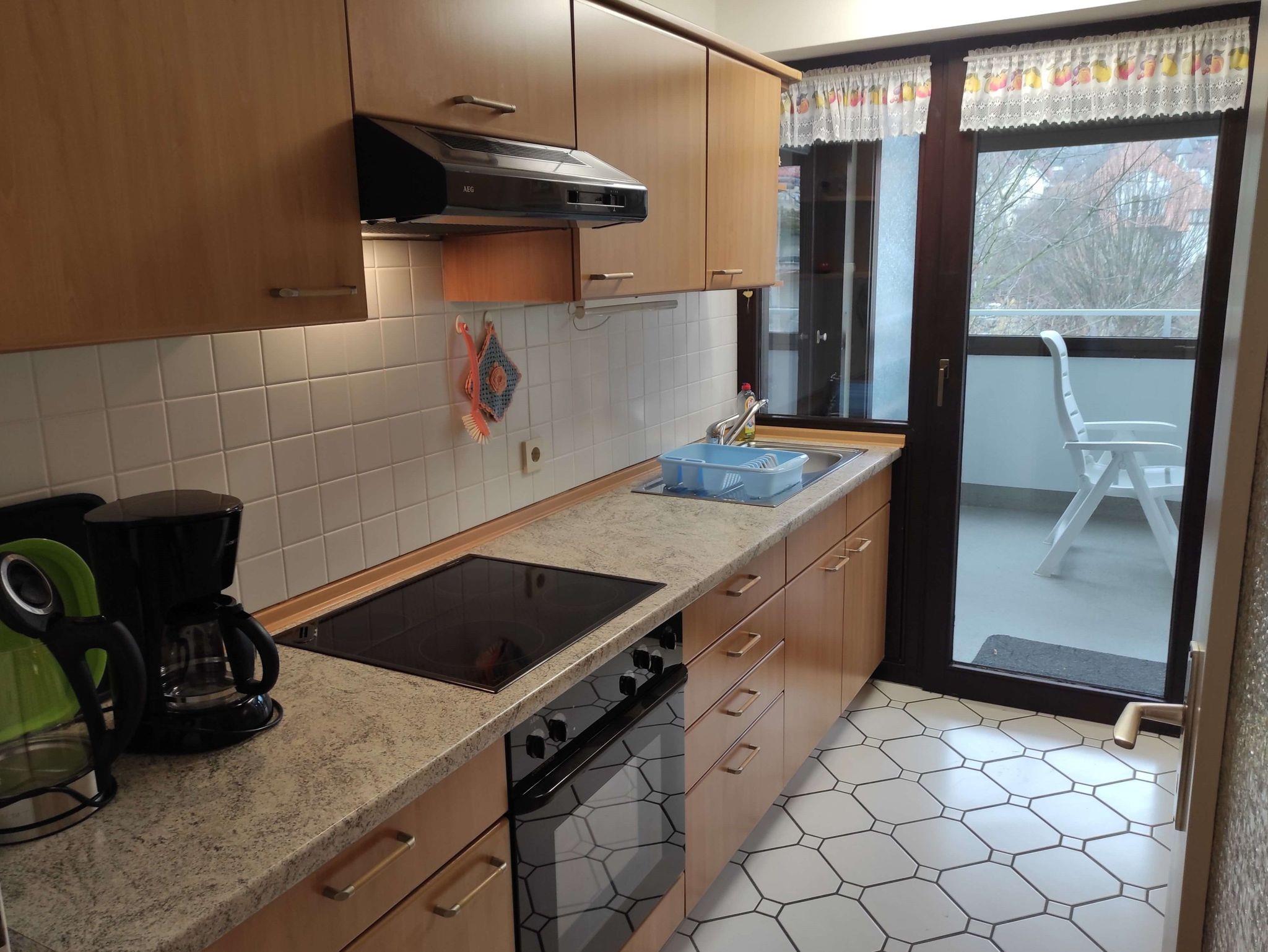 Die Ferienwohnung liegt in der 3. Etage und ist mit einem Fahrstuhl zu erreichen. Sie verfügt über einen großzügigen Balkon, ein separates Schlafzimmer, Diele mit Essbereich und ein Wohnzimmer mit einem großzügigen 1'80m Doppelschrankbett sowie einem Sofa und einem Sessel und TV. Im hellen Badezimmer befindet sich eine Dusche, die mit einem Klappsitz und Haltegriff ausgestattet ist. Die komplett eingerichtete Küche verfügt über einen Backofen mit Cerankochfeld, Mikrowelle, Kaffeemaschine, Wasser- und Eierkocher, Toaster, Backformen, Handmixer sowie einem Kühlschrank mit Eisfach.