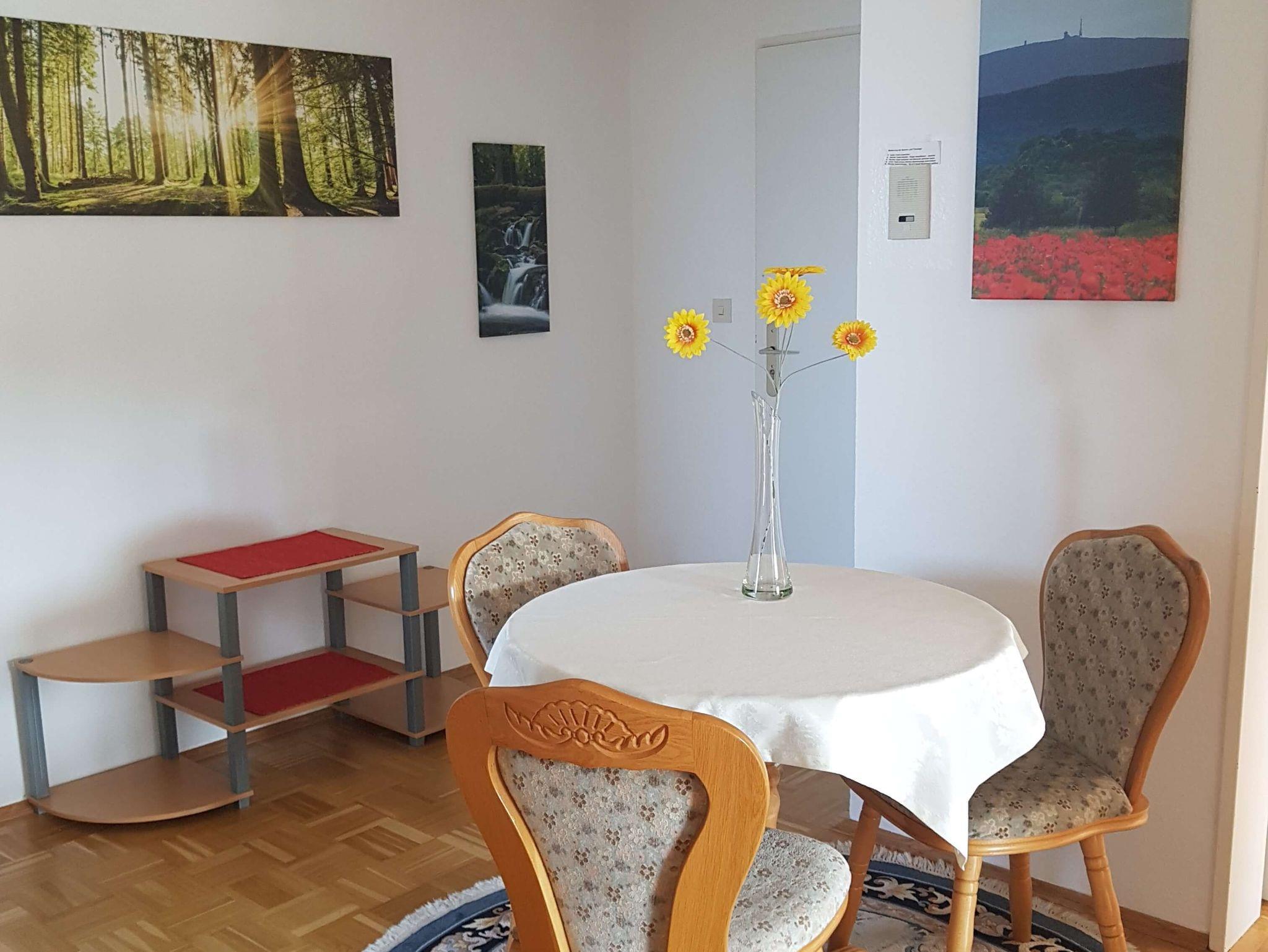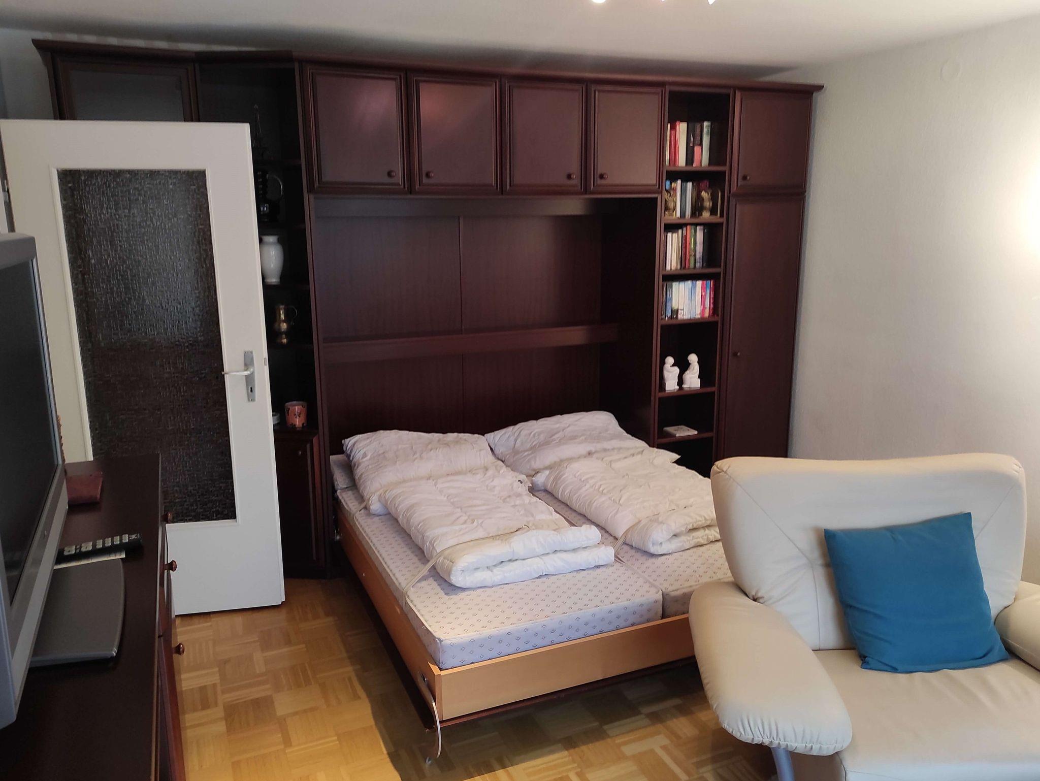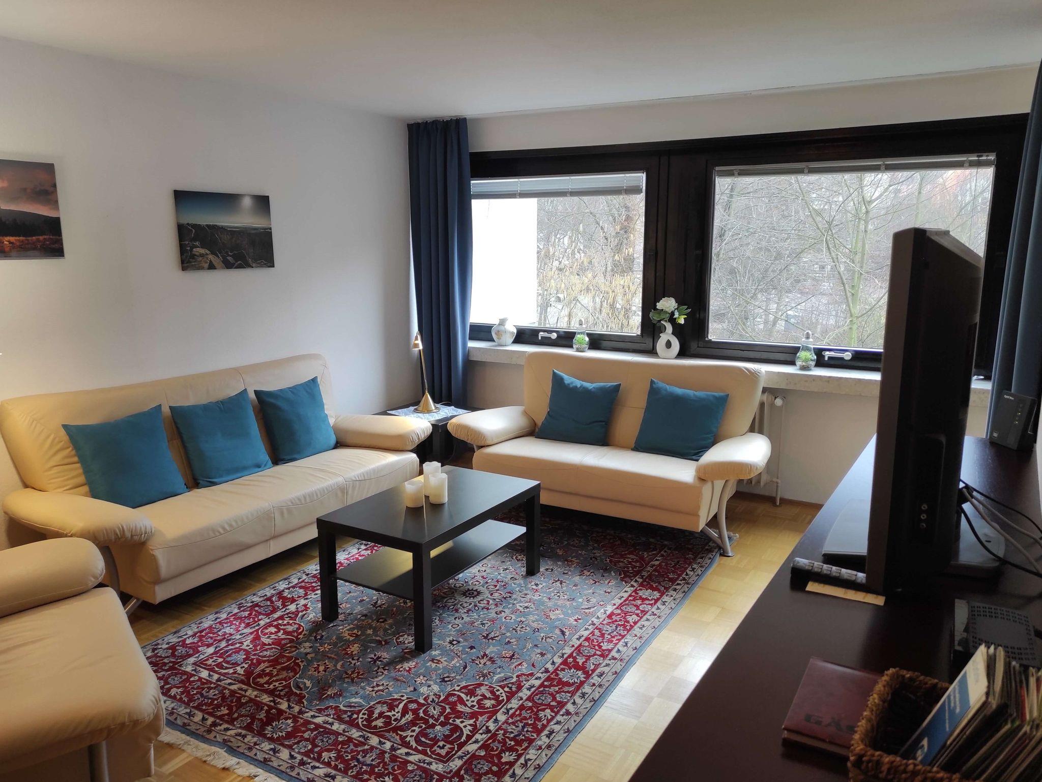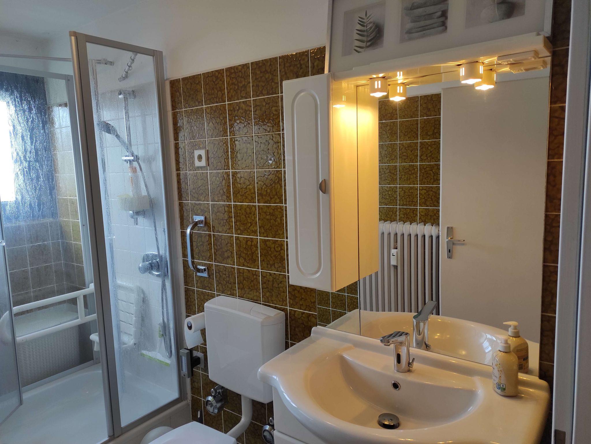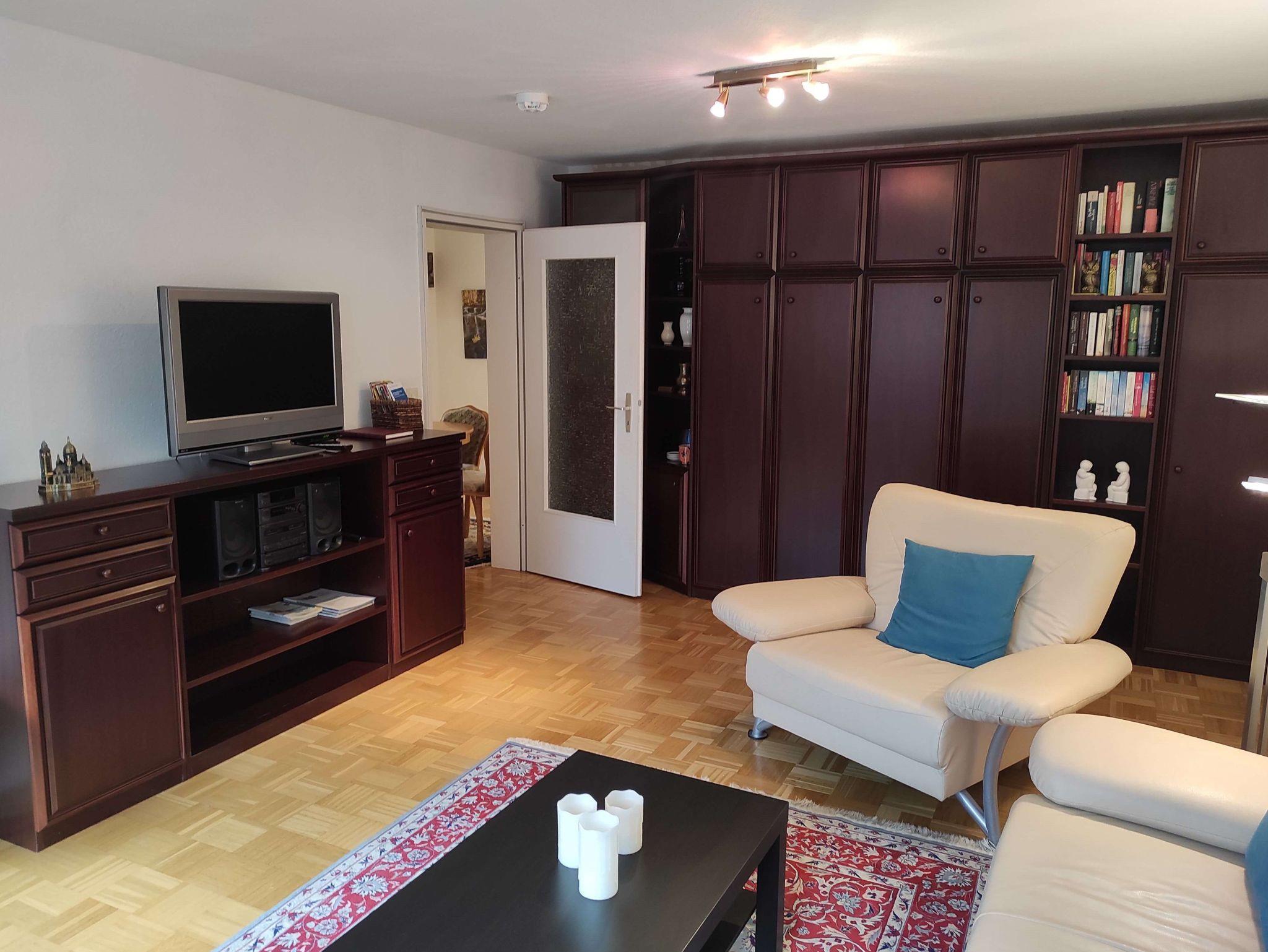 Die Ferienwohnung liegt in der 3. Etage und ist mit einem Fahrstuhl zu erreichen. Sie verfügt über einen großzügigen Balkon, ein separates Schlafzimmer, Diele mit Essbereich und ein Wohnzimmer mit einem großzügigen 1'80m Doppelschrankbett sowie einem Sofa und einem Sessel und TV. Im hellen Badezimmer befindet sich eine Dusche, die mit einem Klappsitz und Haltegriff ausgestattet ist. Die komplett eingerichtete Küche verfügt über einen Backofen mit Cerankochfeld, Mikrowelle, Kaffeemaschine, Wasser- und Eierkocher, Toaster, Backformen, Handmixer sowie einem Kühlschrank mit Eisfach.