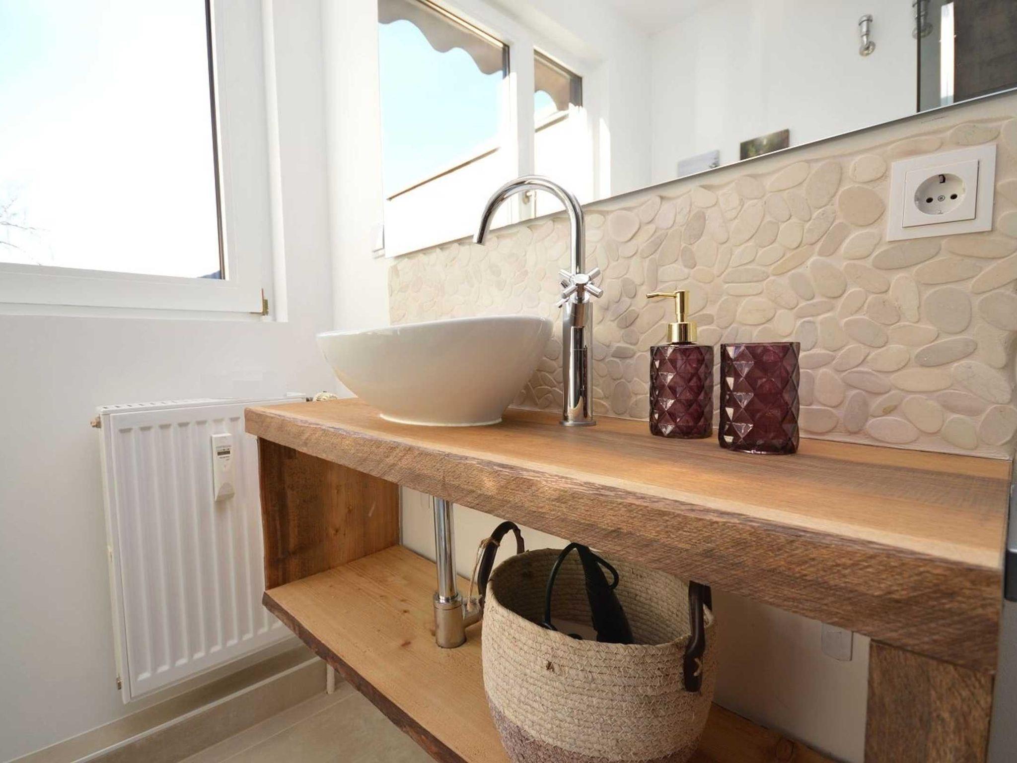 Angrenzend an das Wohnzimmer finden Sie das Schlafzimmer mit 1,80m breitem Doppelbett. Das neue, supermoderne Duschbad ist mit neuer Dusche und Wellness-Brause ausgestattet sowie einem Aufsatzwaschbecken auf rustikaler Holzplatte. Für zwei weitere Personen steht eine Schlafcouch zur Verfügung.