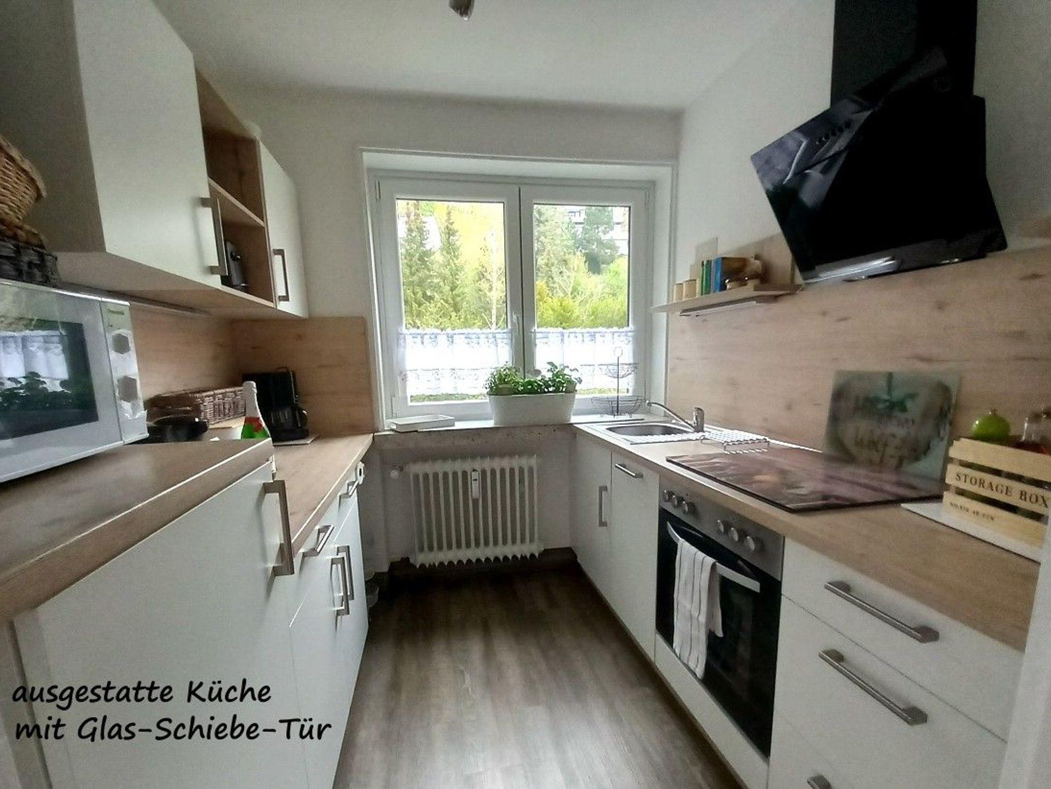 • Die Küche hat eine Glas-Schiebetür.