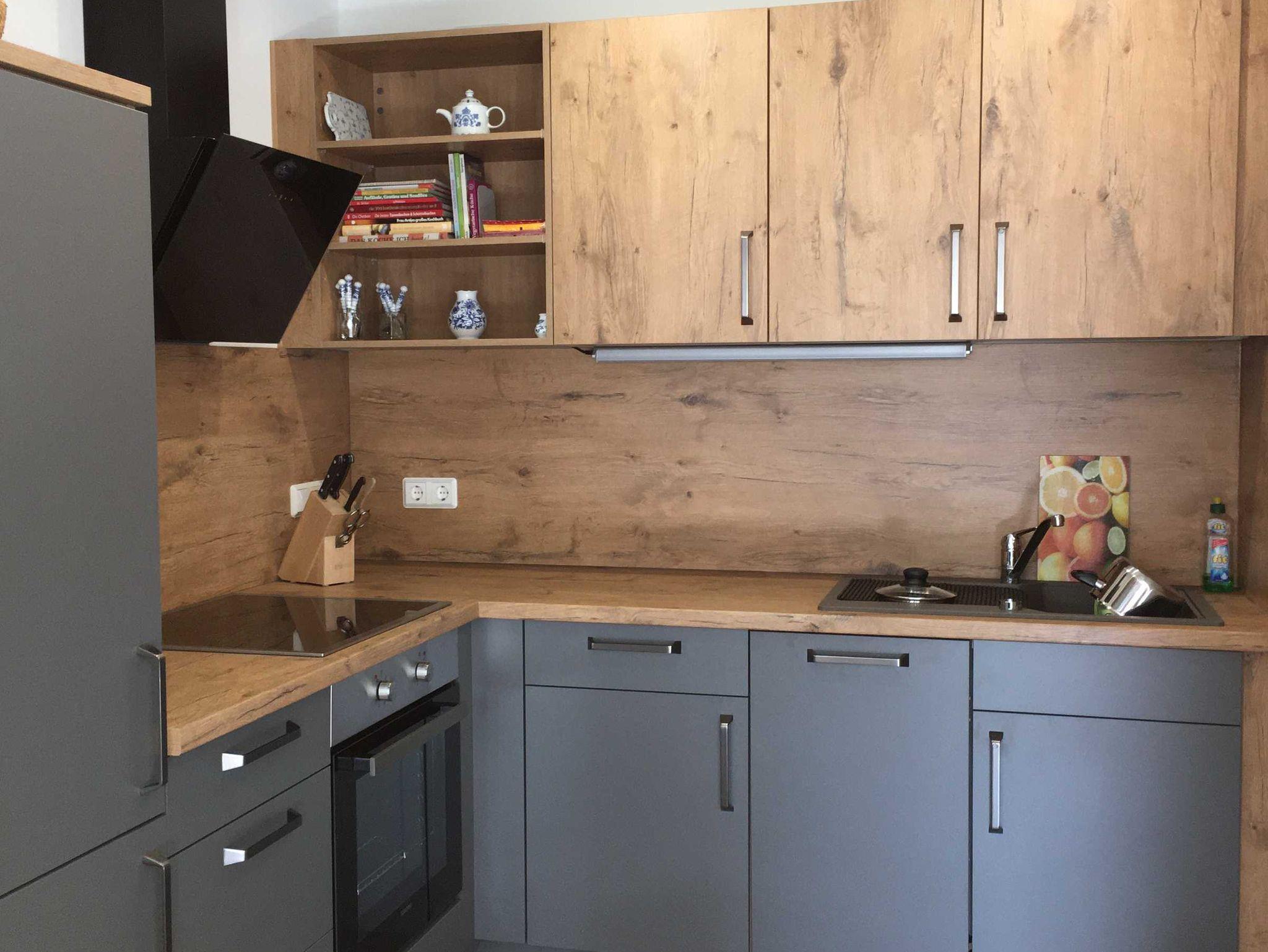 • offene Küche mit Kühl-/Gefrierschrank, Induktionsfeld (4 Platten), Backofen, Spülmaschine, Toaster, Kaffemaschine etc.