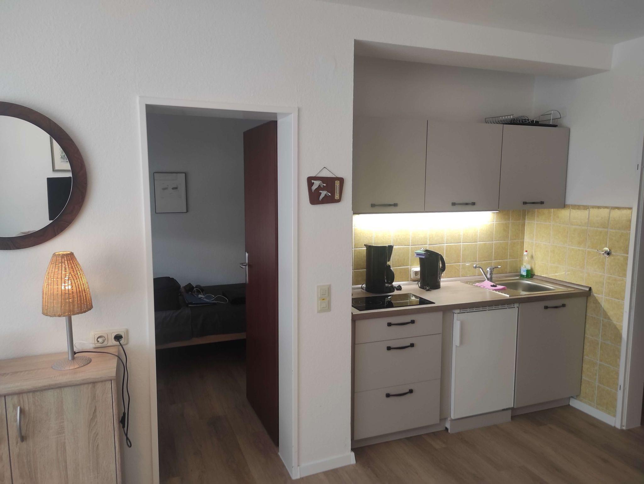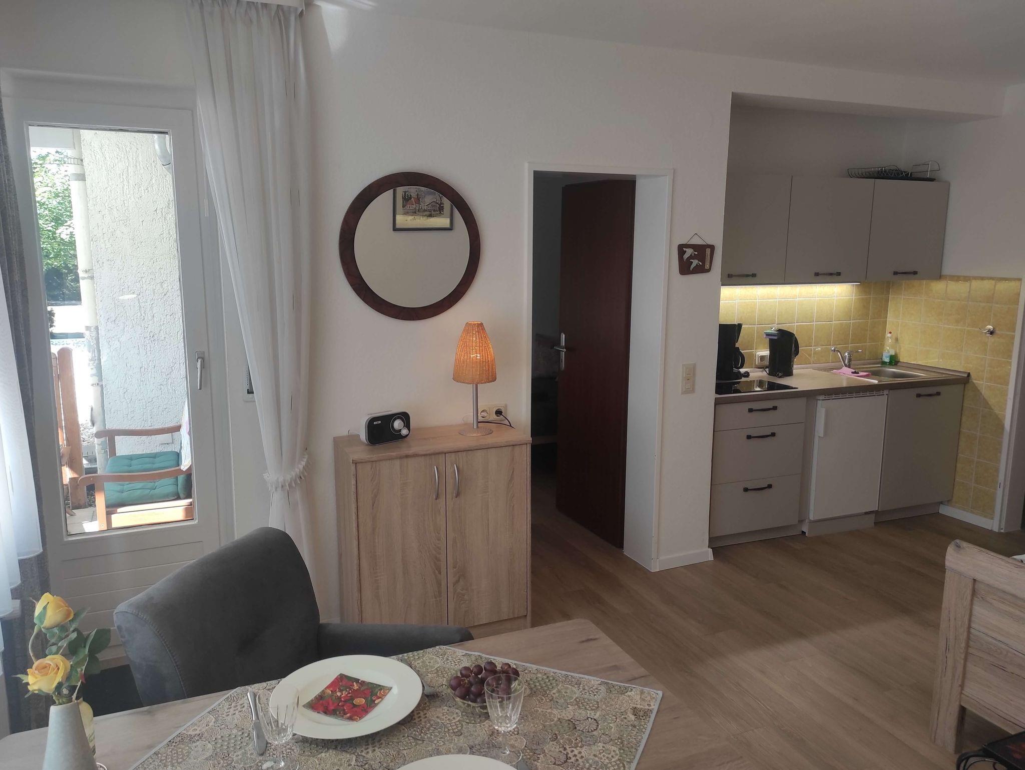 Ferienwohnung Magdalena ist auf ca. 40 qm ideal für 2- 3 Personen. Besteht aus Wohn-/Schlafbereich mit separatem kl. Schlafzimmer, Einbauküche und Essplatz. Flur mit Garderobe. Duschbad und Sonnenterasse mit Blick in den Stadtpark.