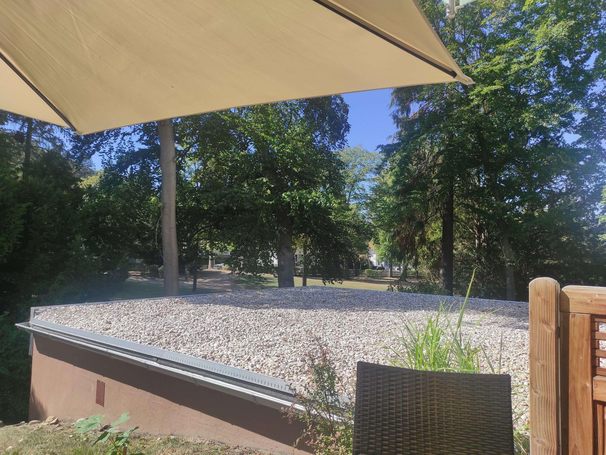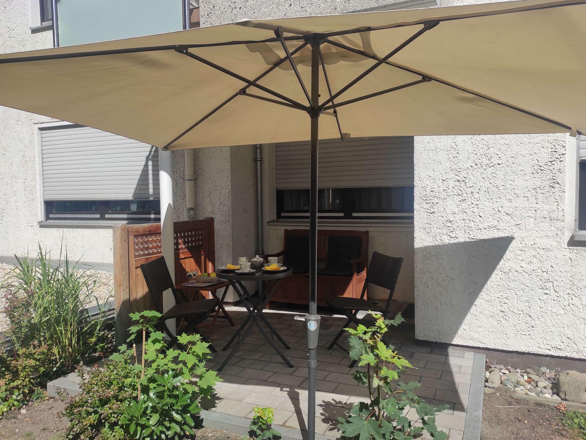 Südterrasse überdacht und möbliert. Blick in den Stadtpark. Sonnenschirm vorhanden.