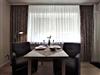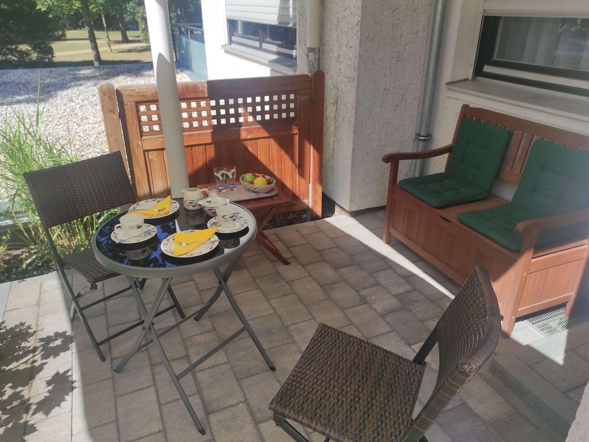 Essplatz mit gemütlichen Sesseln und Blick in's Grüne.