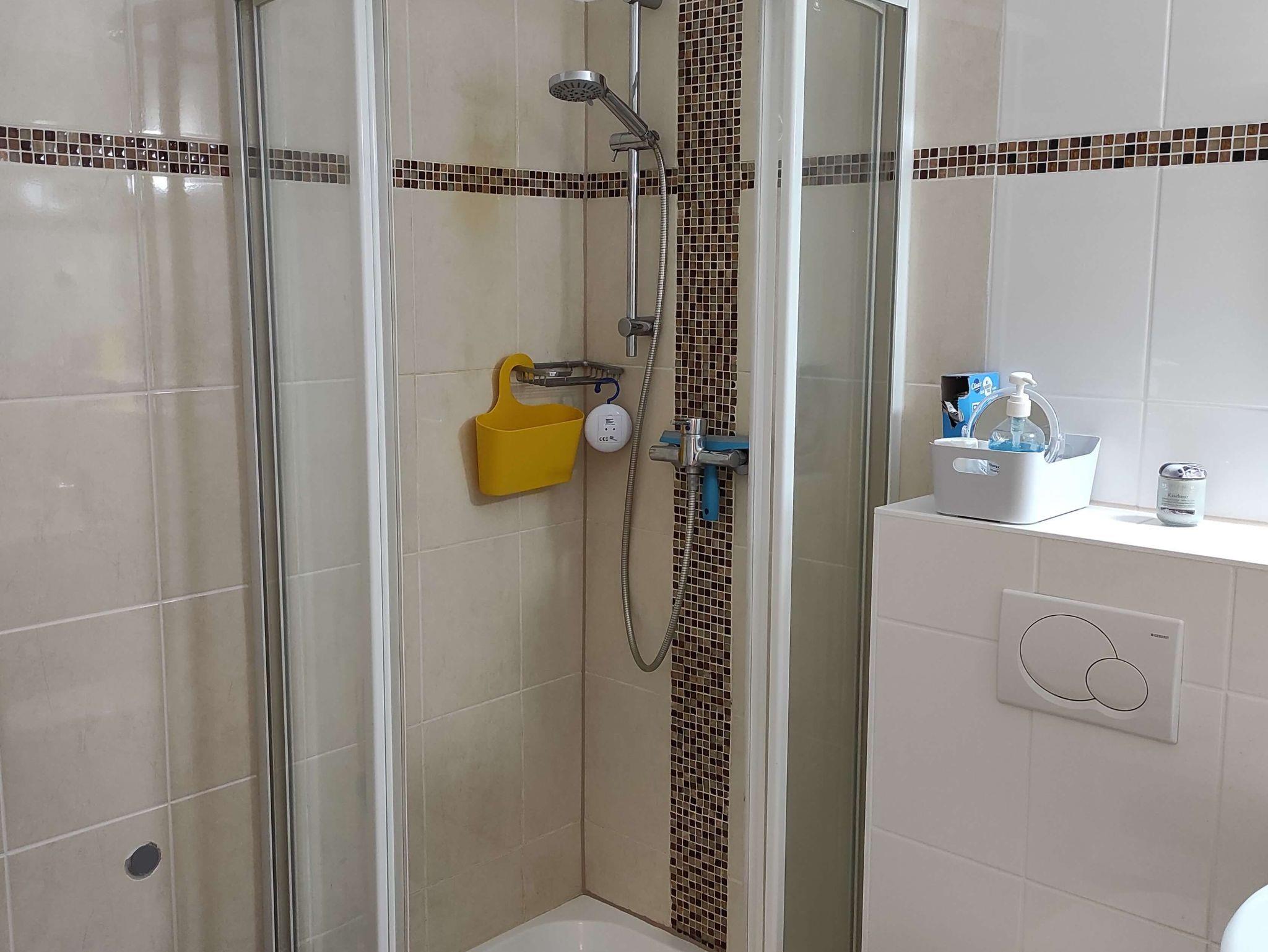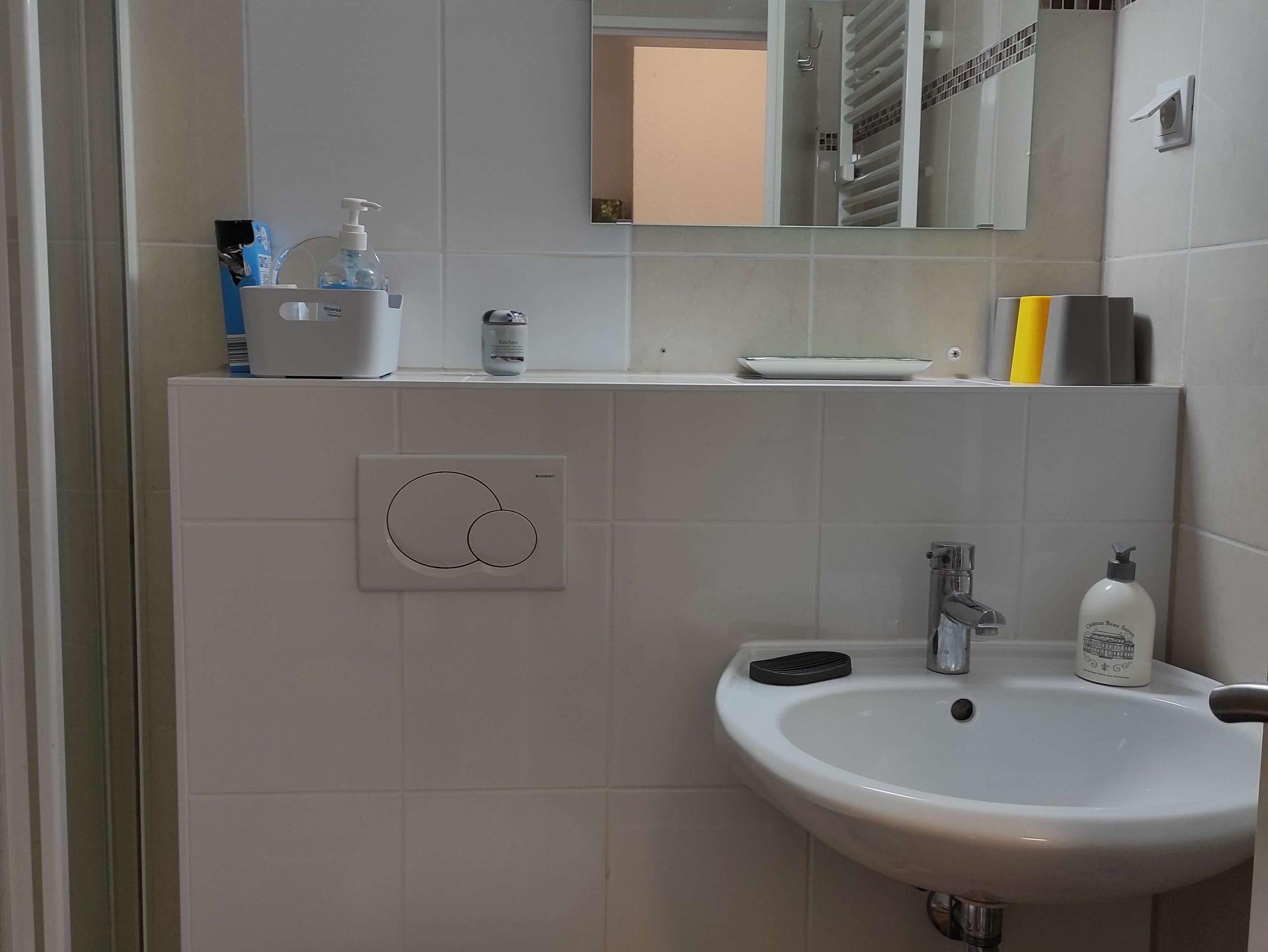 Das moderne Badezimmer ist mit einer Dusche und einer Handtuchheizung ausgestattet.