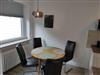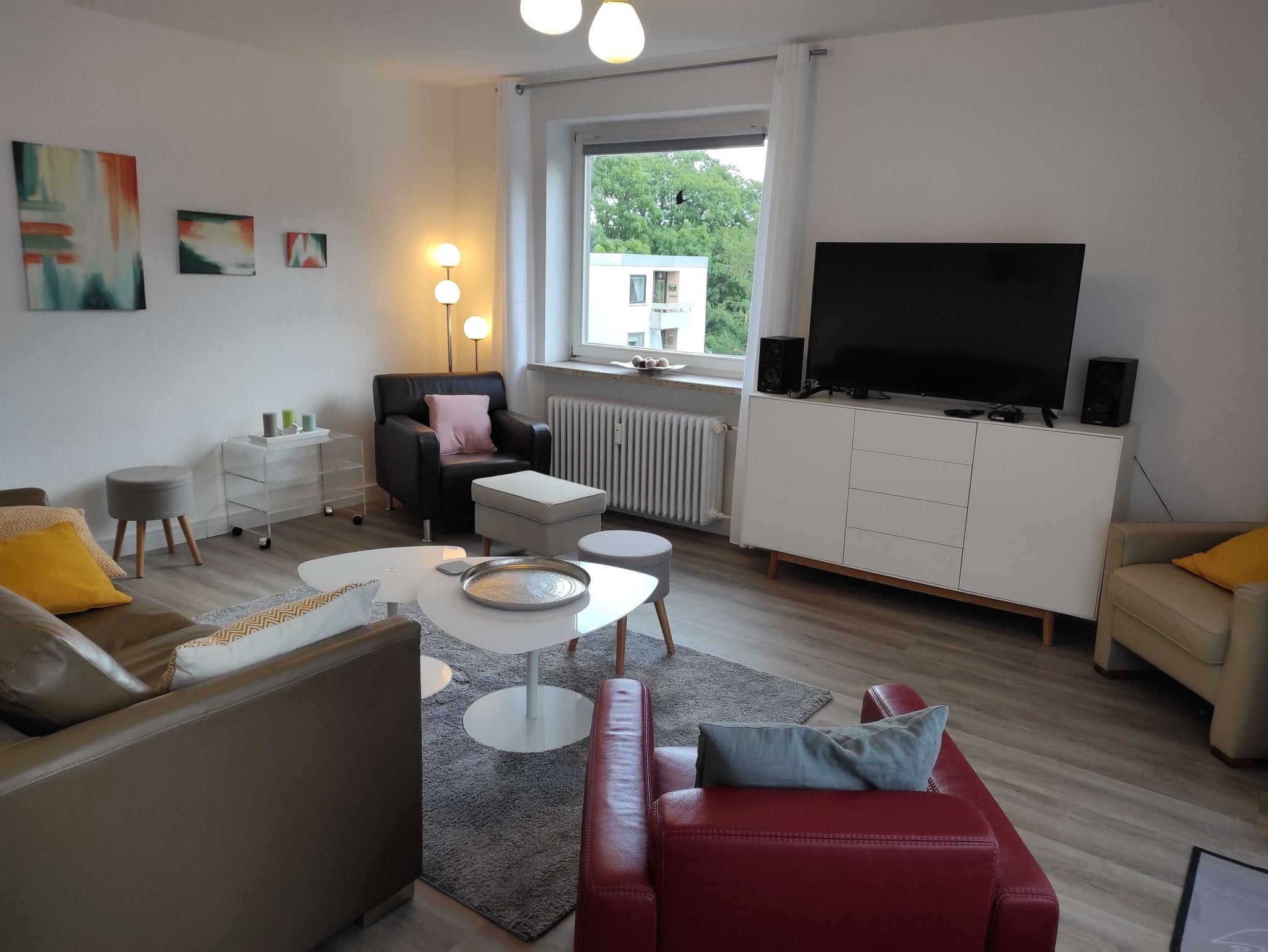 Das Wohnzimmer mit Laminatboden ist modern eingerichtet mit bequemen Sesseln und Sofa. Es verfügt über einen 40 Zoll Fernseher und eine Musikanlage mit Bluetooth. Das hochwertige Schlafsofa lässt sich leicht ausklappen und bietet mit einer Liegefläche von 1.40 x 2,00m genug Platz für 2 Personen.