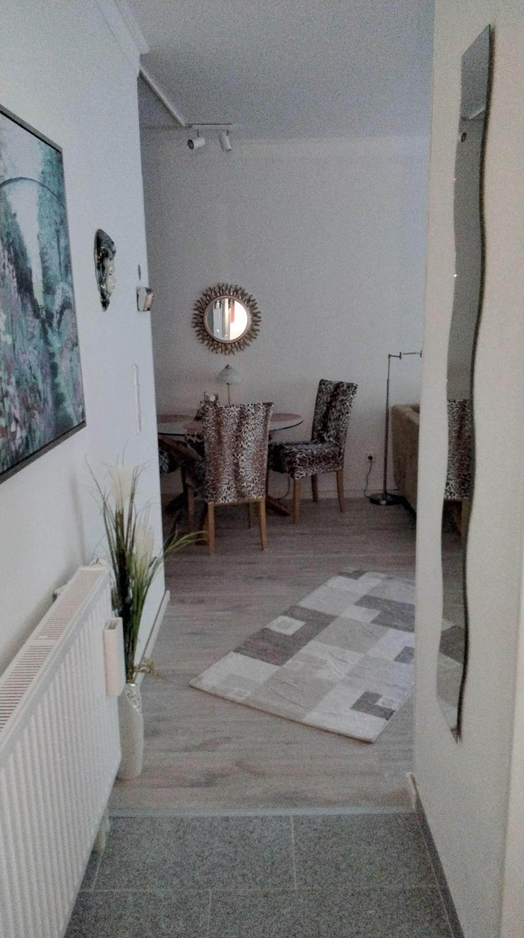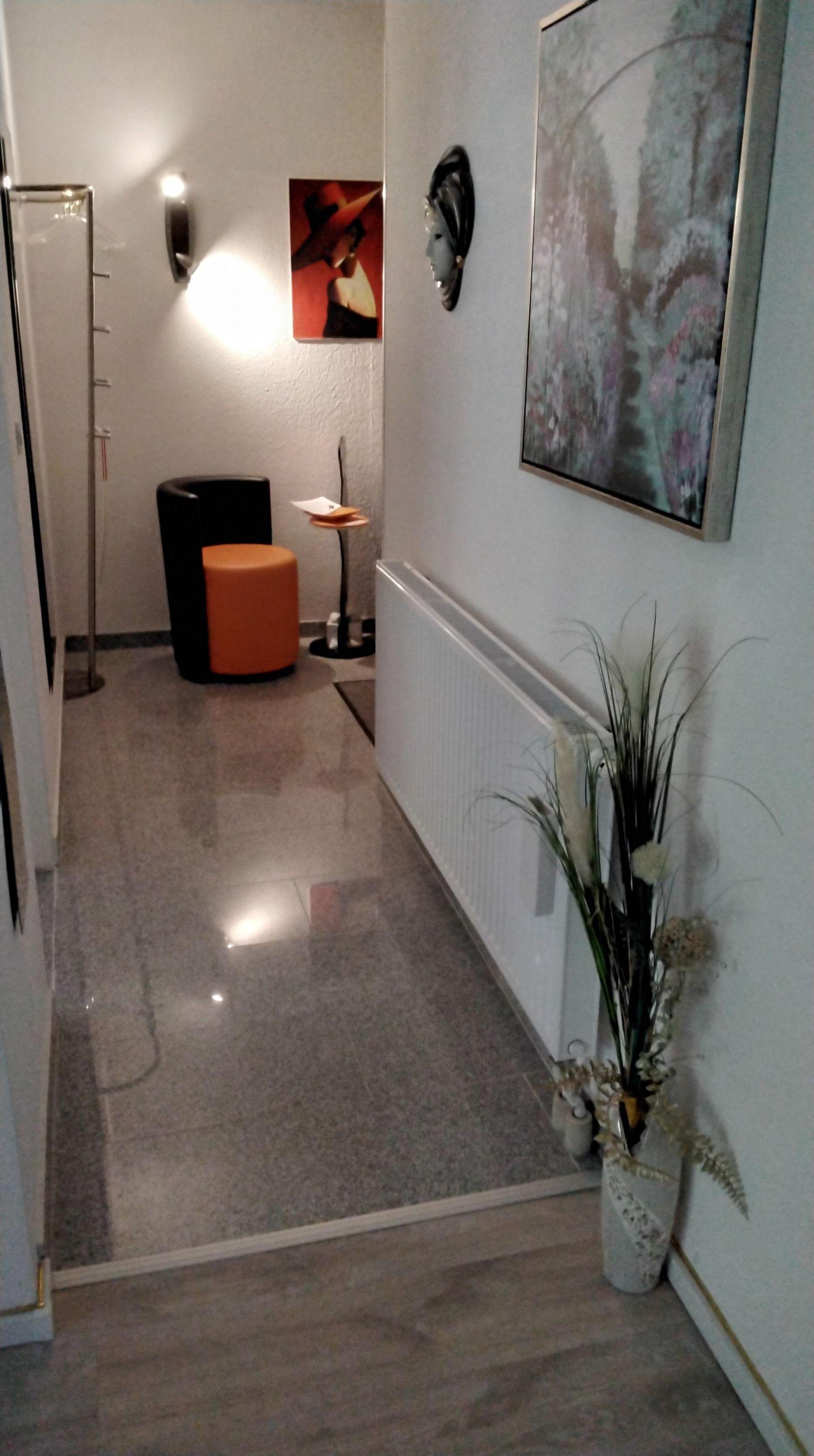 Flur mit Schuhschrank , großem Spiegel und Garderobenständer, zwei schöne Sessel sowie WLAN und Schuhputzmittel sowie Gästepantoffeln und Schuhschalen zum ablegen von getragene Schuhe.