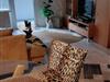 Das Wohnzimmer ist mit einer Couch und einem Glastisch versehen ,der auf einem Fell platziert ist.