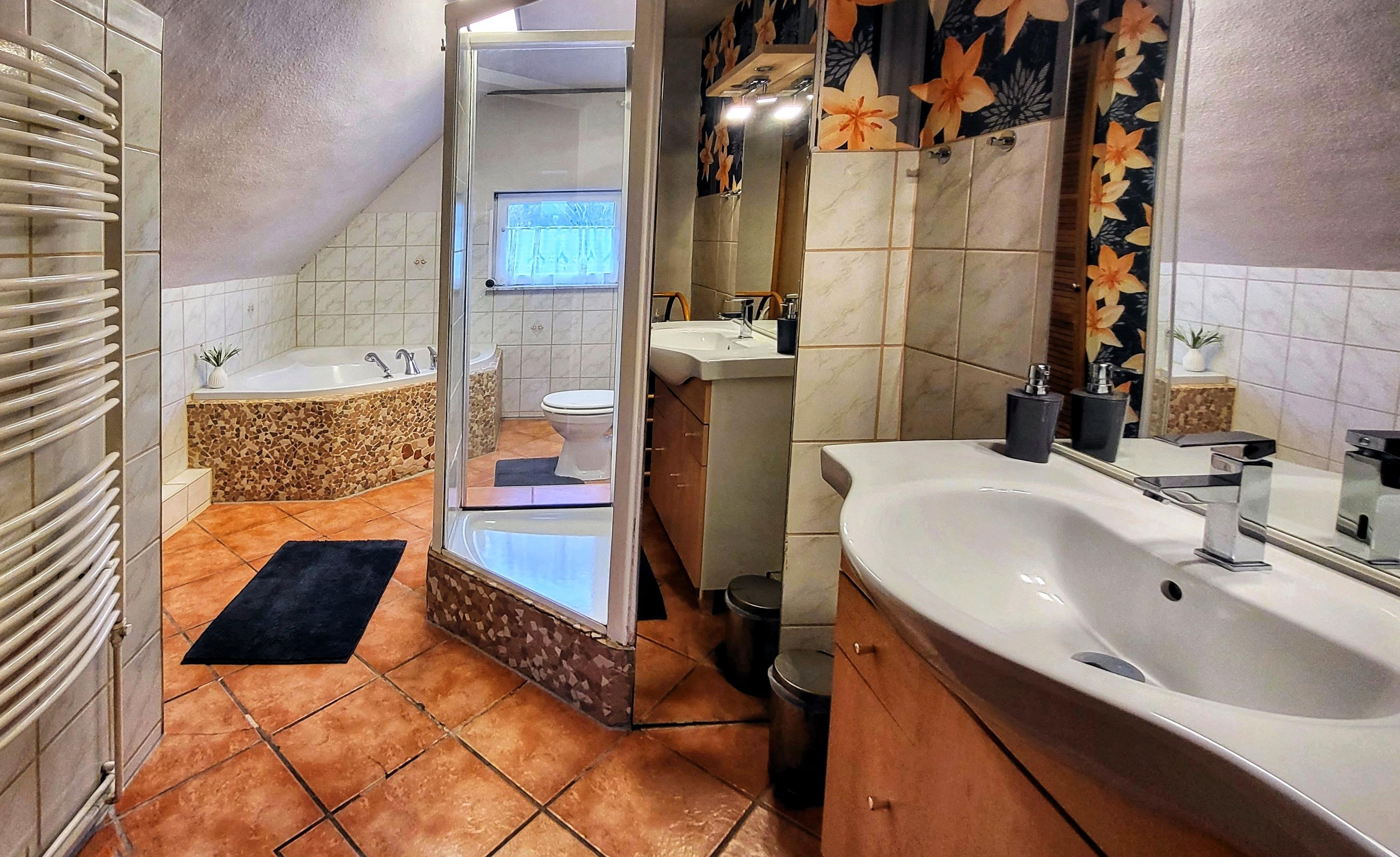 * ein geräumiges Tageslichtbad mit Eckwanne, Dusche und WC