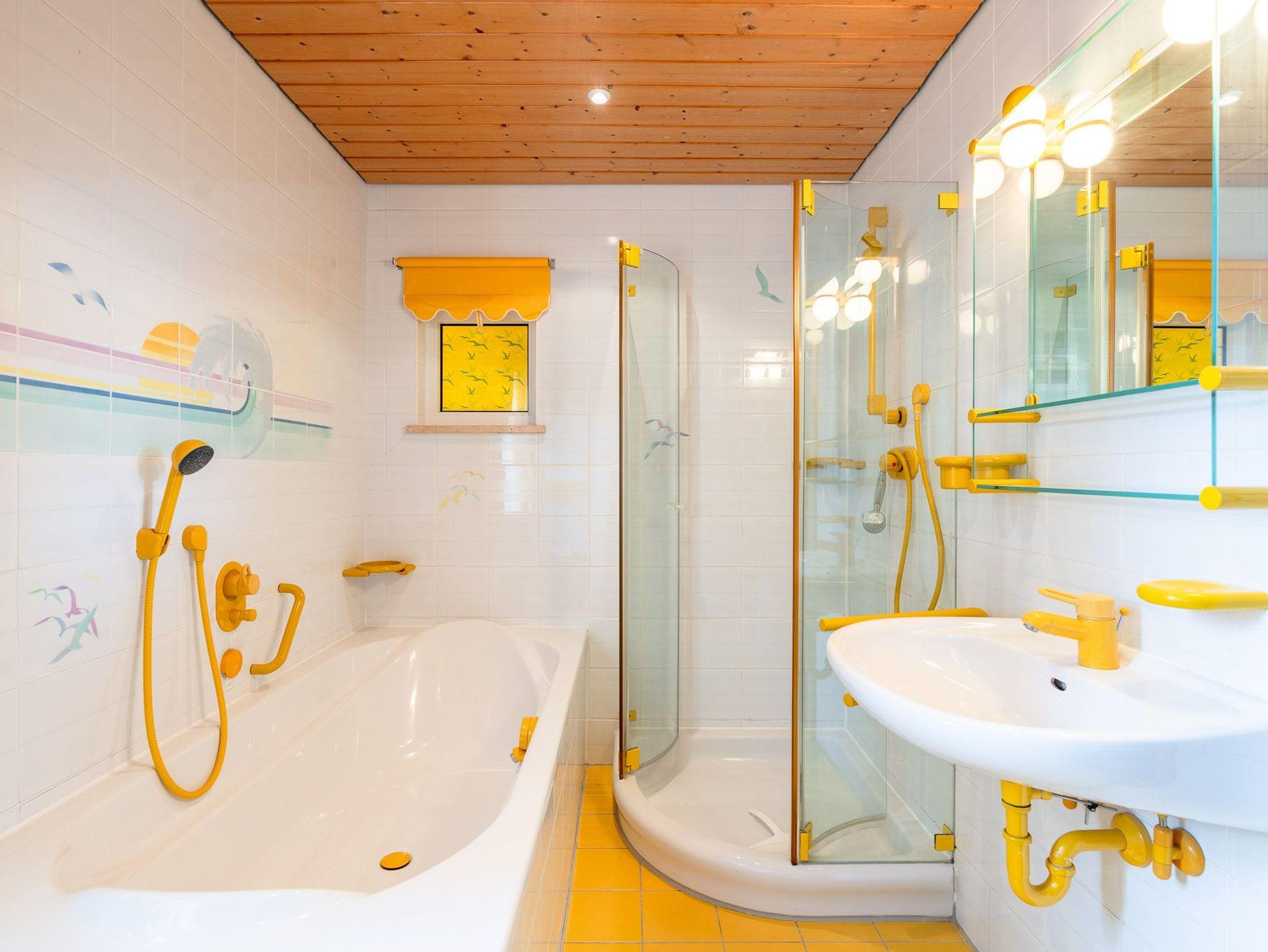 Im freundlich gestalteten Bad befindet sich eine Dusche/Badewanne und ein WC.