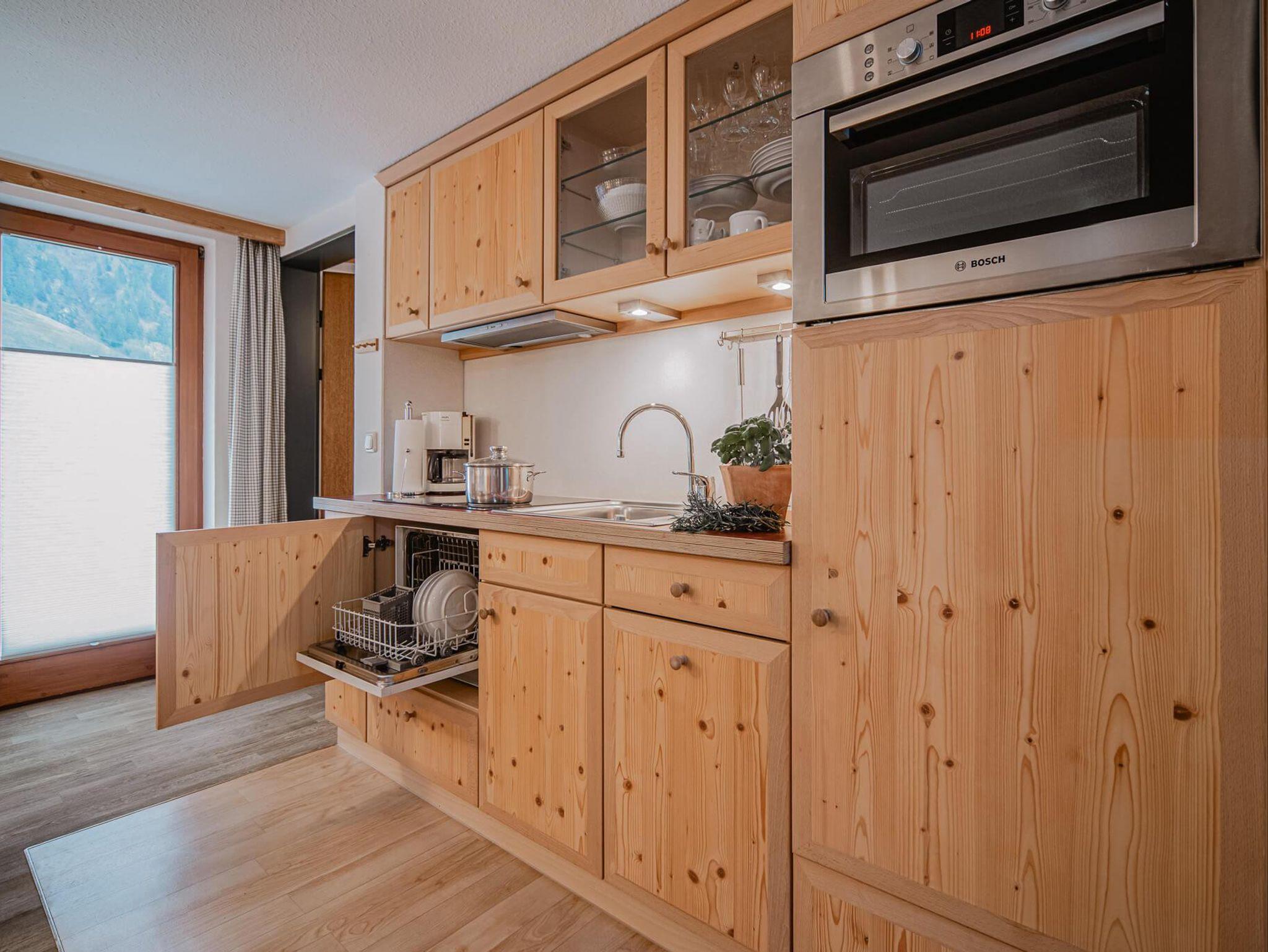 Küche mit 4 Kochplatten, Backofen, Mikrowelle, Spülmaschine, Kaffeemaschine, Espressokocher, Wasserkocher, Toaster, Eierkocher, diverse Arbeitsgeräte, Kochtöpfe, Gläser und Geschirr.
