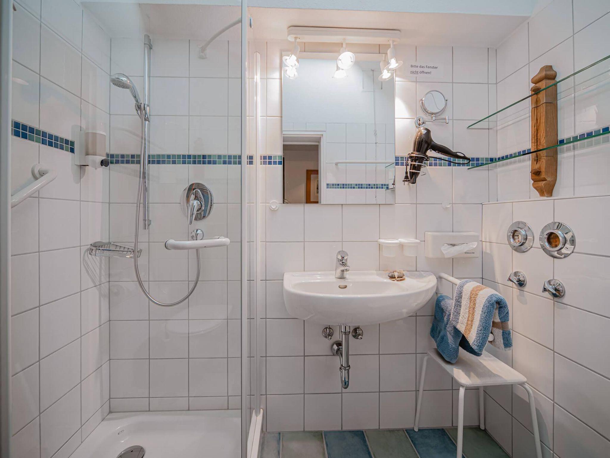 Badezimmer mit Dusche, WC und Haarfön, sept. WC.