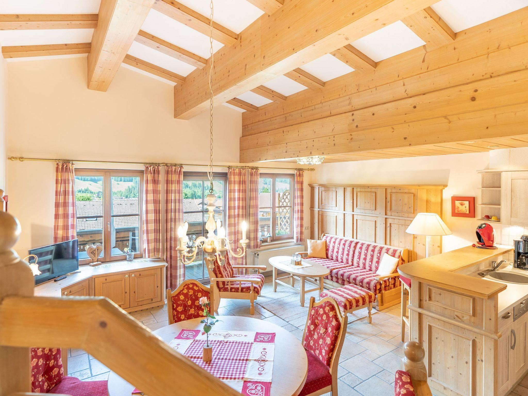 Der großzu?gige Wohn- und Essbereich la?dt mit einer gemu?tlichen runden Essecke zum Verweilen ein. Hier ko?nnen Sie Ihre Mahlzeiten genießen und entspannte Stunden verbringen. Vom Su?dbalkon aus ko?nnen Sie die Sonne und die heilklimatische Bergluft Bad Hindelangs genießen. Mit einem atemberaubenden Bergblick ko?nnen Sie Ihre Seele baumeln und den Tag harmonisch ausklingen lassen. Der Schlafbereich befindet sich auf einer Empore und verspricht Ihnen mit seinem komfortablen
