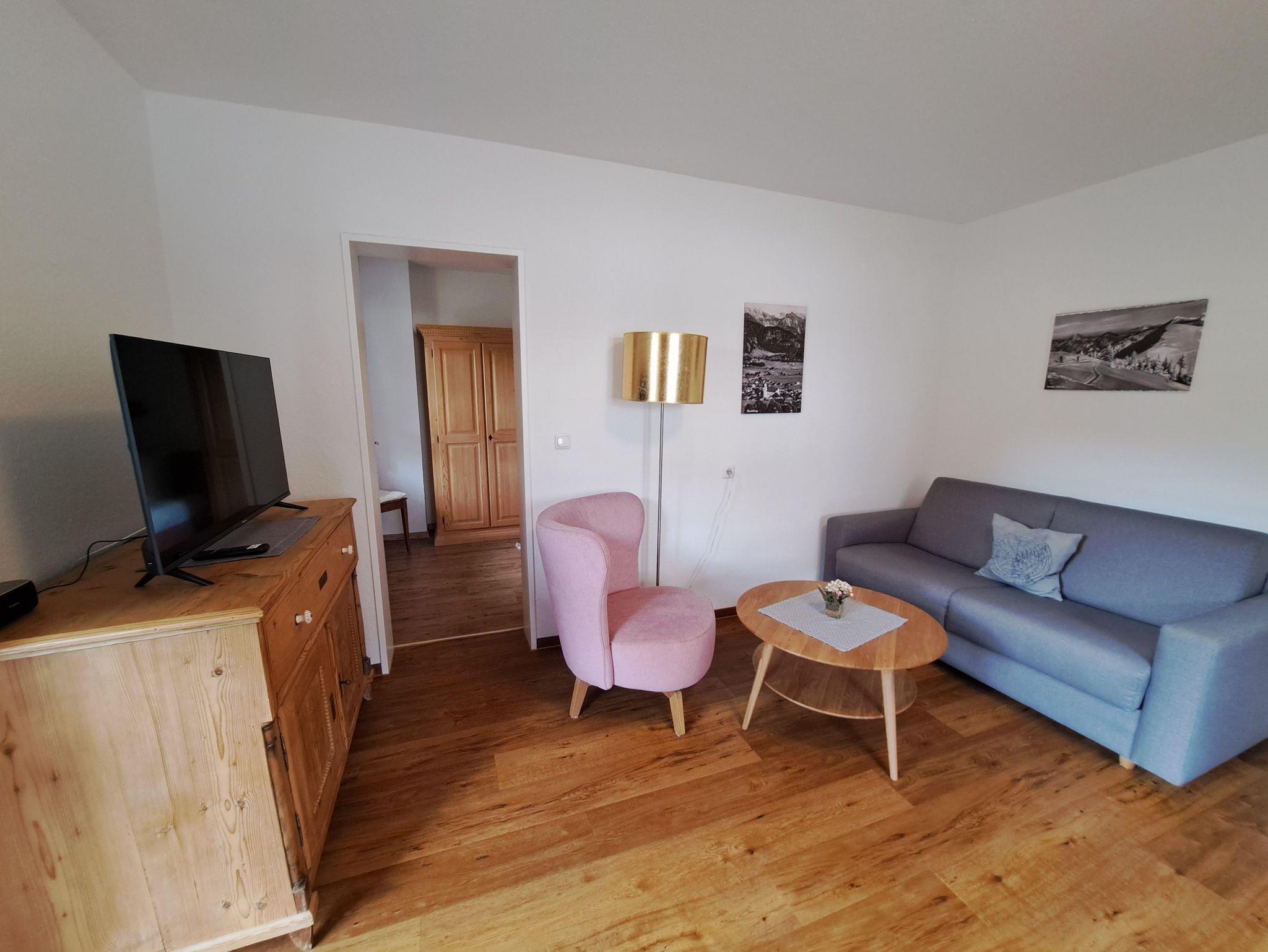 Wohnzimmer, Schlafzimmer, Küche, Bad-WC, Balkon, ca. 45qm.Landhausstil, freie Gebirgsaussicht. Keine Haustiere. Allergiker Bettwäsche auf Wunsch. Bad Hindelang PLUS Betrieb.