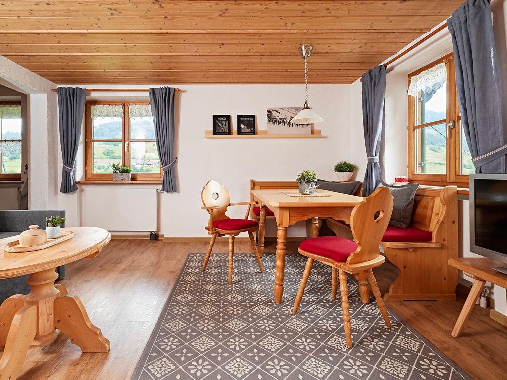 Der gemütliche Wohnraum ist im Allgäuer Stil eingerichtet und hat einen Ausgang zum Balkon.