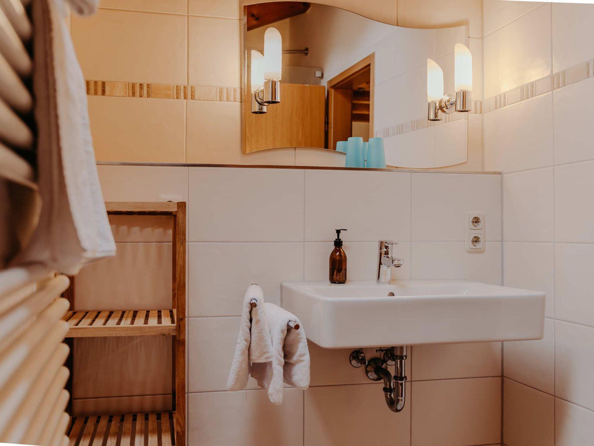 Bad mit Waschbecken und begehbarer Dusche, separates WC, inklusive Handtücher und Bettwäsche