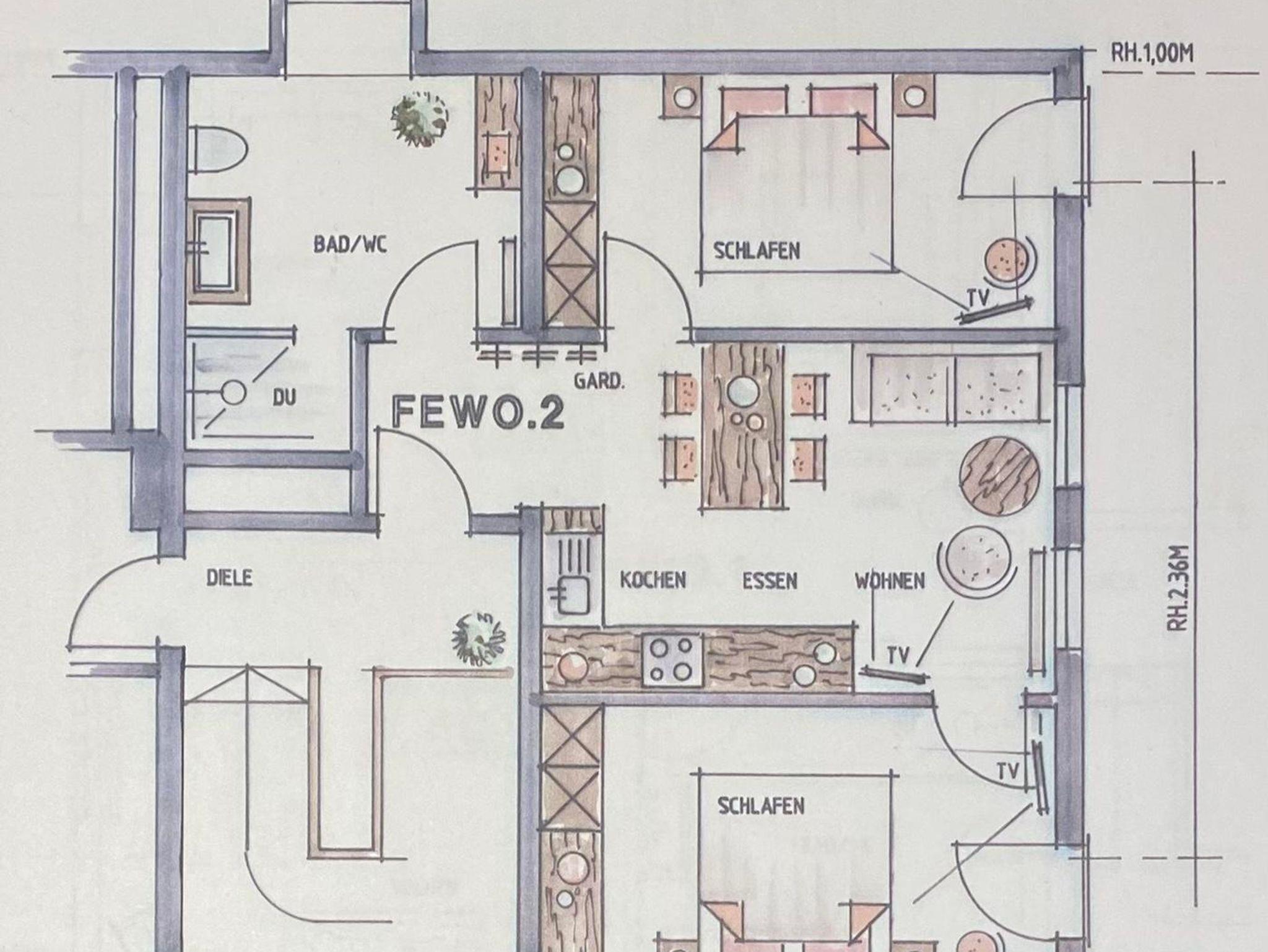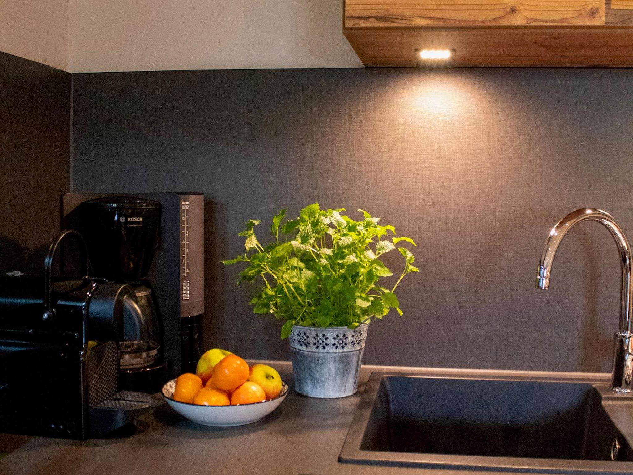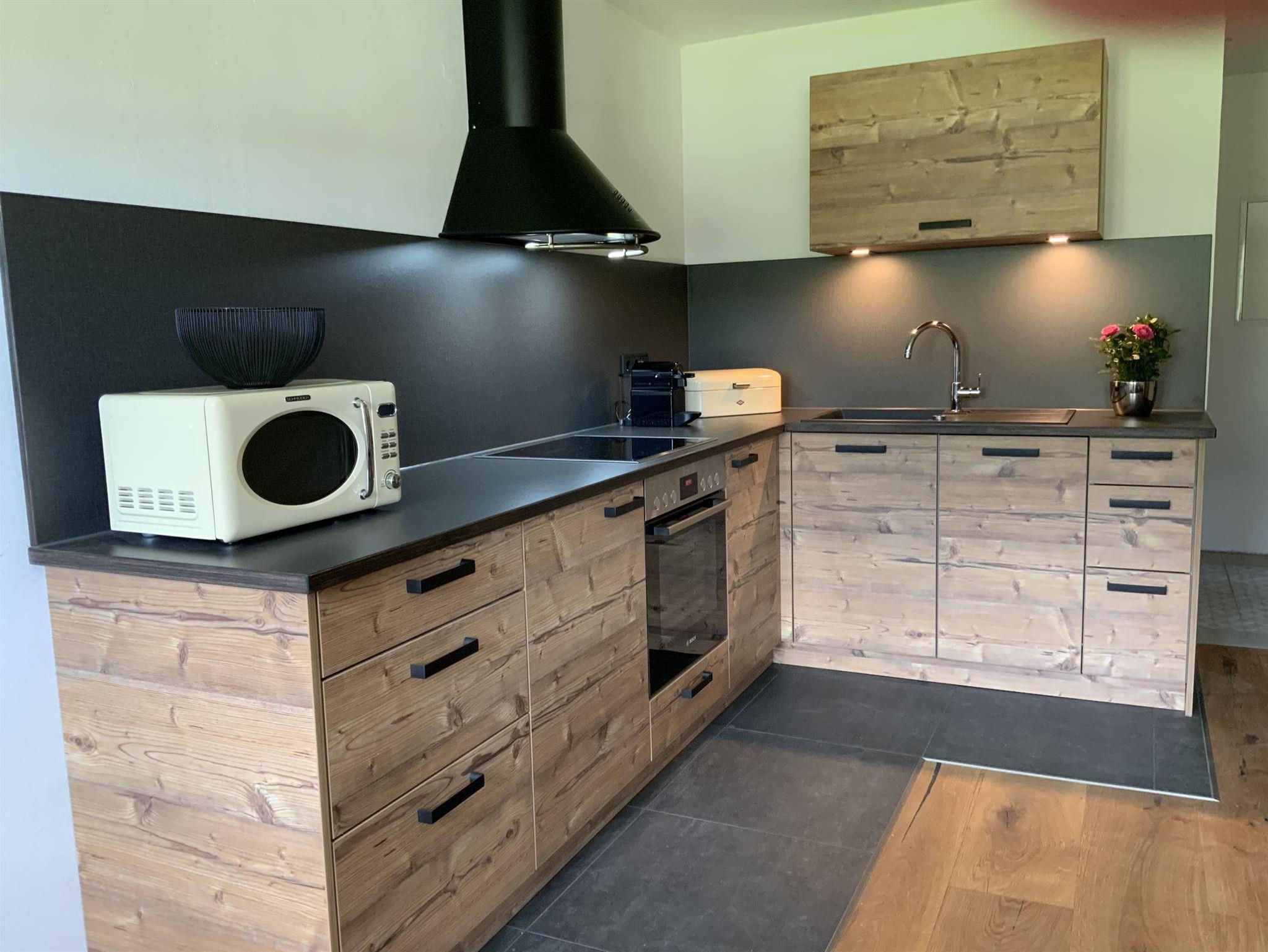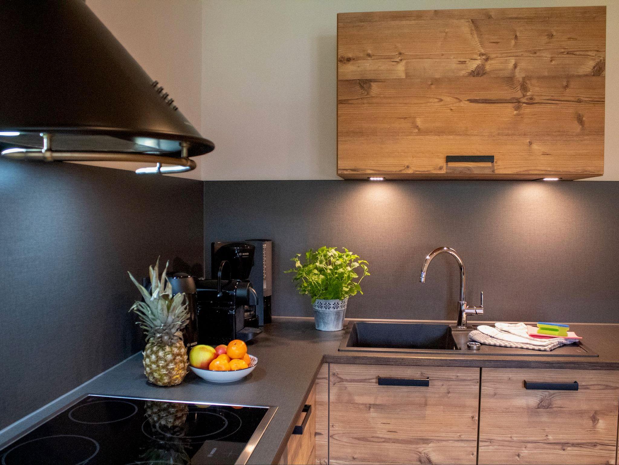 - einer Wohnküche (große Küchenzeile, Ceranherd, Backofen, Spülmaschine, Kühlschrank mit Eisfach, Dunstabzug, Nespressomaschine, Milchaufschäumer, Wasserkocher etc.), Sofa, Esstisch, Flachbild TV